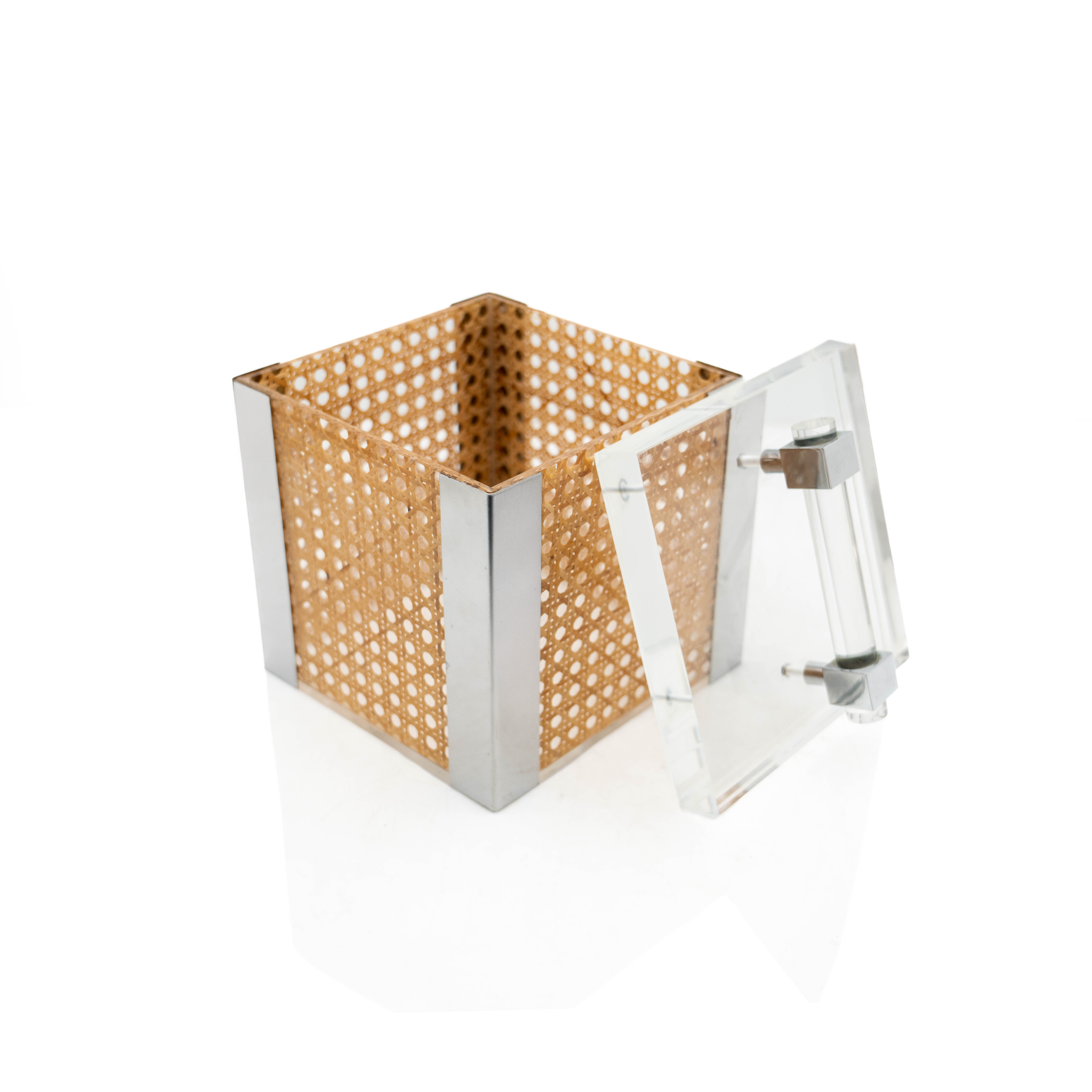 A fine Christian Dior ice bucket and coaster set. The generous ice bucket is crafted out of lucite-encased wicker with silver-plated brass accents, while the coasters are simply wicker encased in lucite.