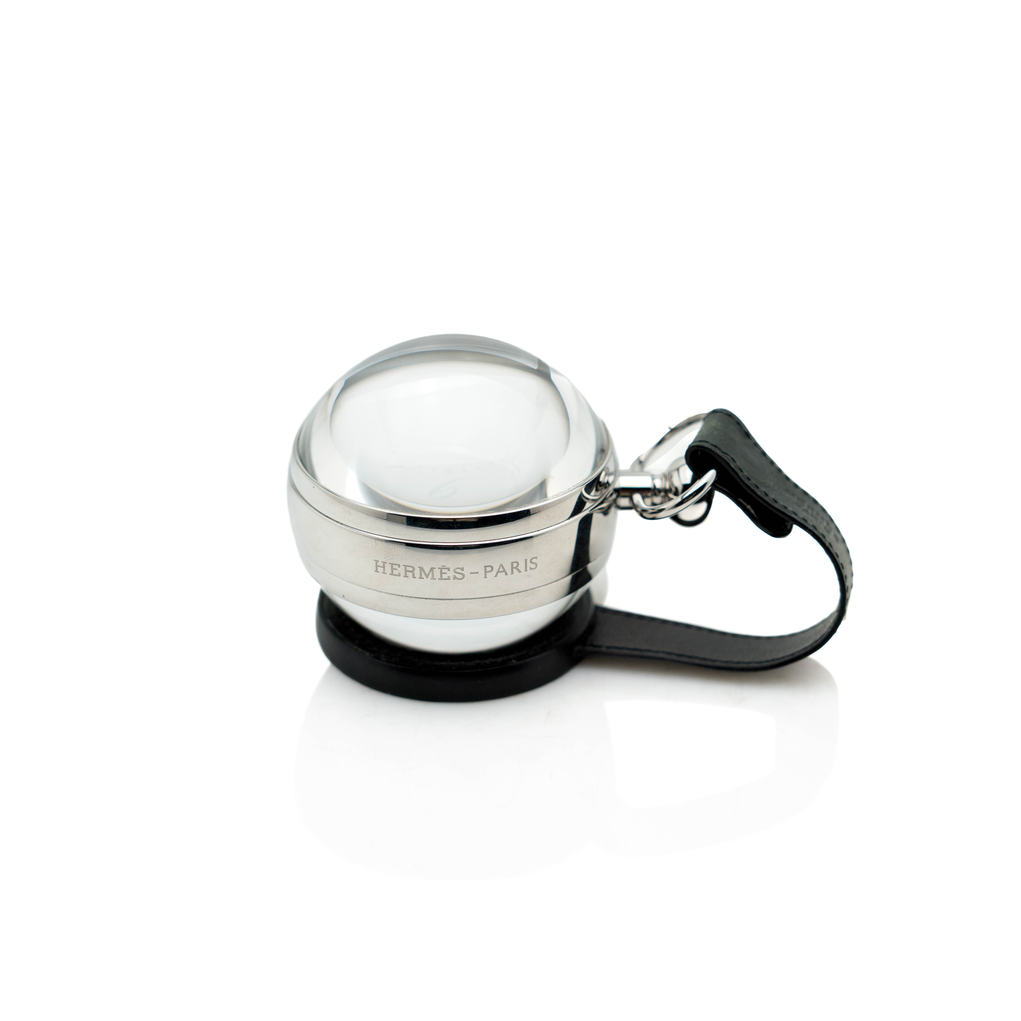 A fine and elegant Hermes ball clock, set on a black leather base. Designed in the form of a traditional ball clock, this fabulous clock is fashioned with a manual winding movement, adding to this already timeless piece, ready to elevate any surface in your home.