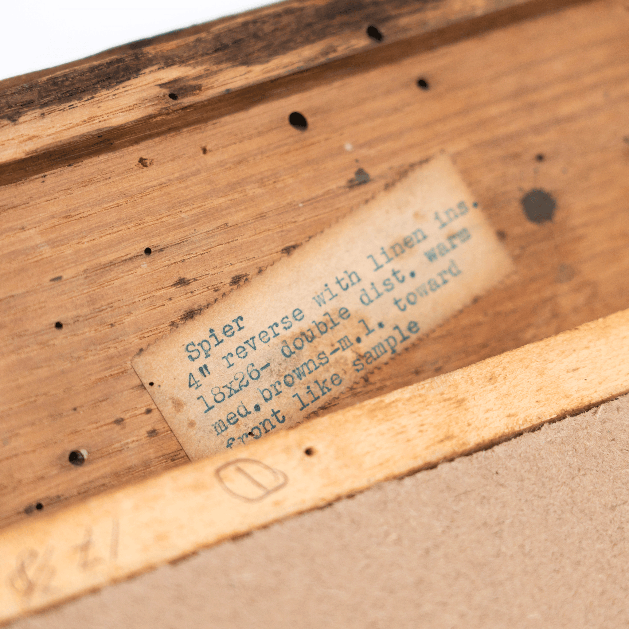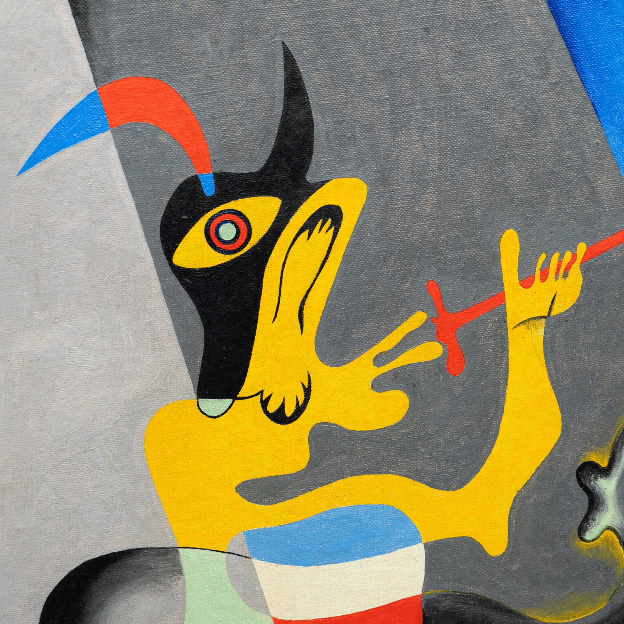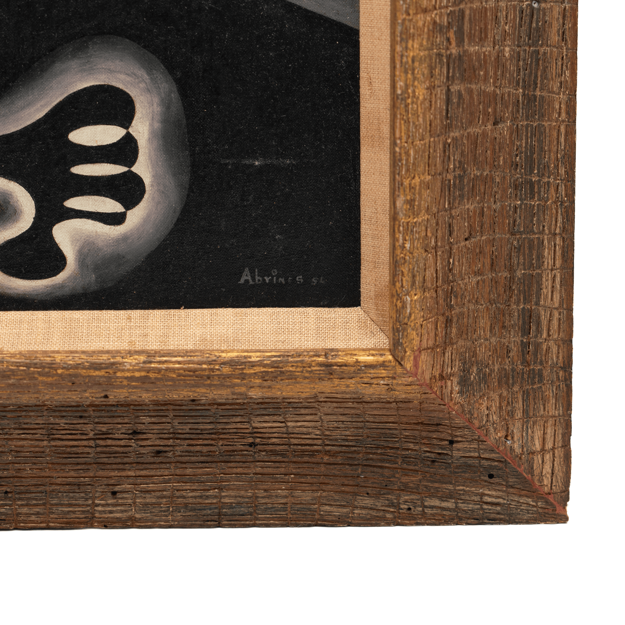 An intriguing and captivating surrealist painting by an undiscovered American artist, signed 'Abrines, 53' in the lower corner. Housed in its original frame, this fabulous painting boasts a wonderful color scene, reminiscent of Miro's use of line, color and form.