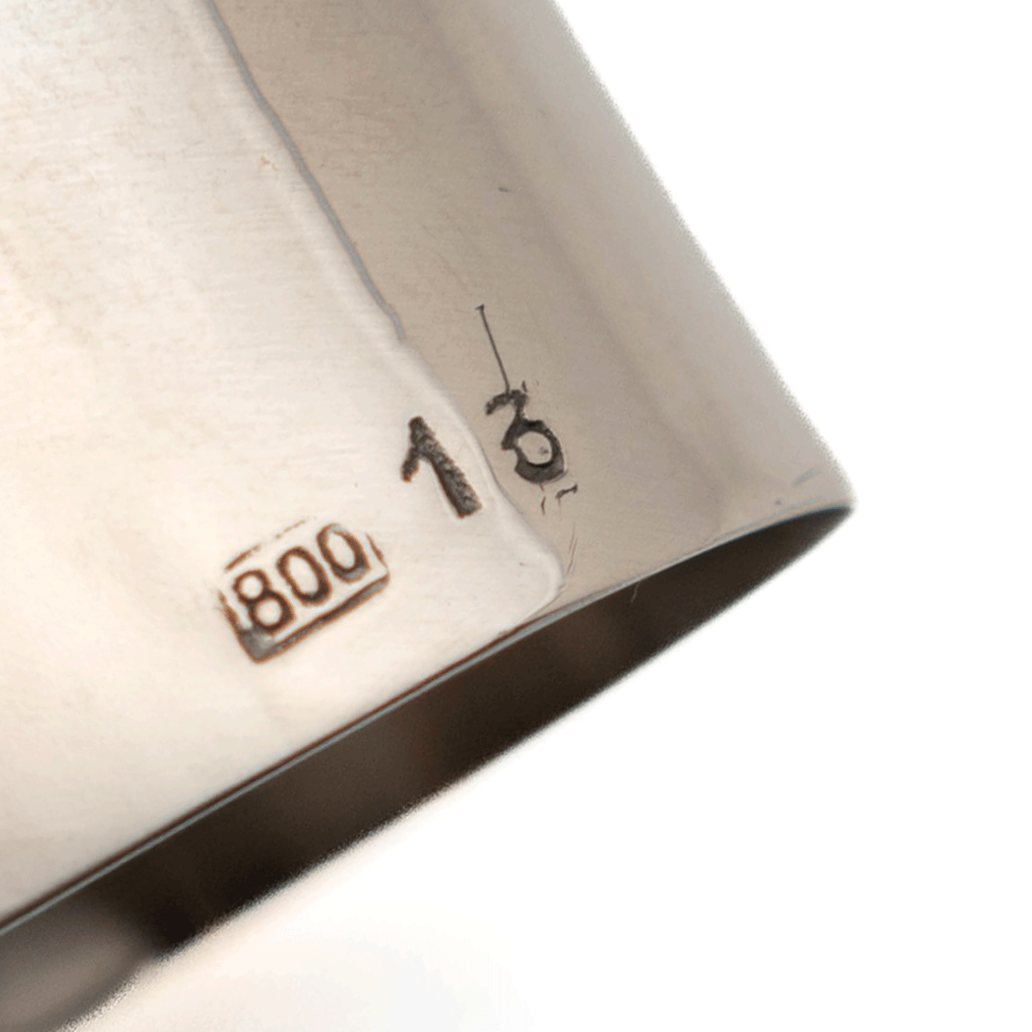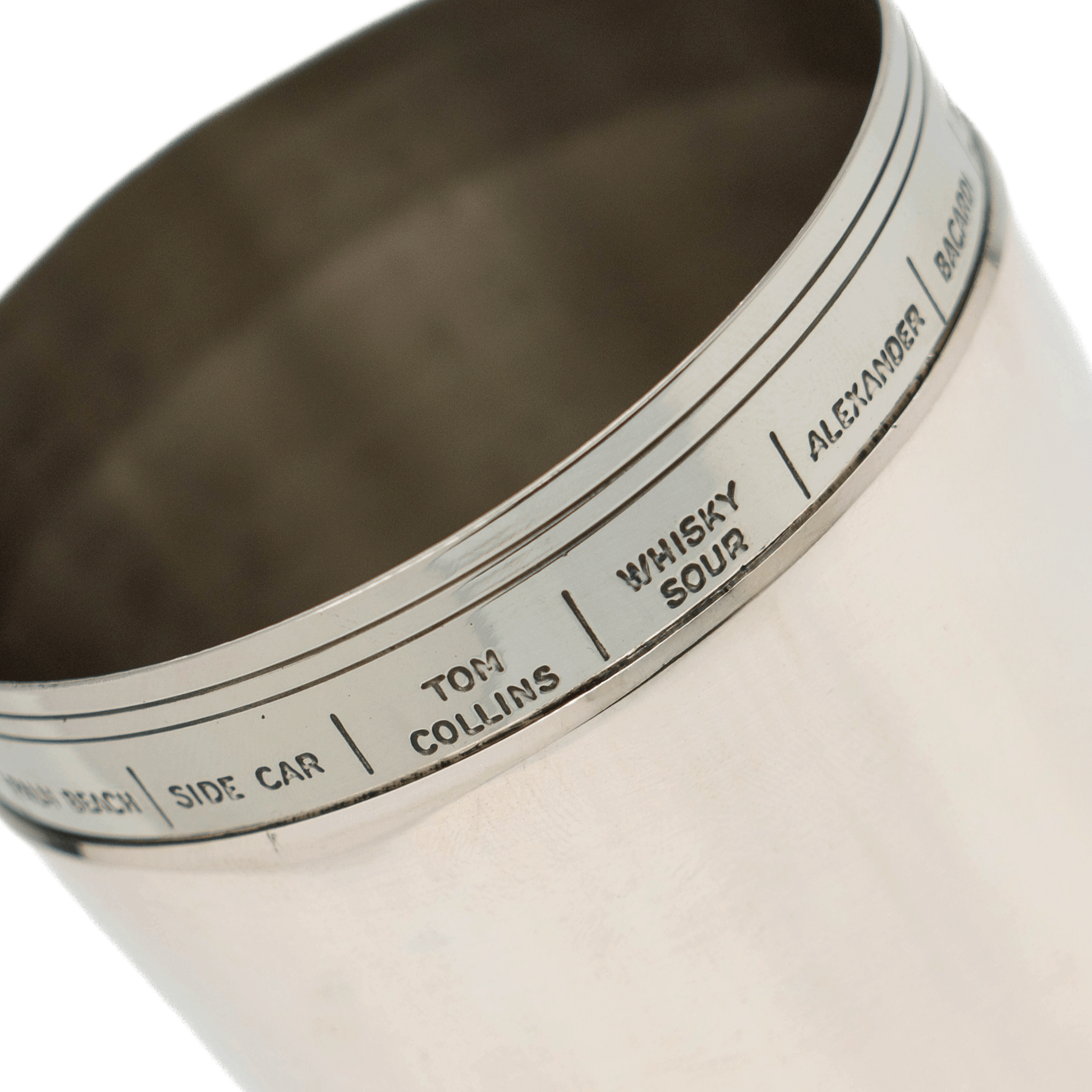 A fine and luxurious Italian sterling silver cocktail shaker with a 'recipe' function. Known as a 'recipe' shaker, one can find the ingredients to several cocktails by turning the outer cup to reveal the recipe. This fabulous recipe shaker is rarely seen in sterling silver.