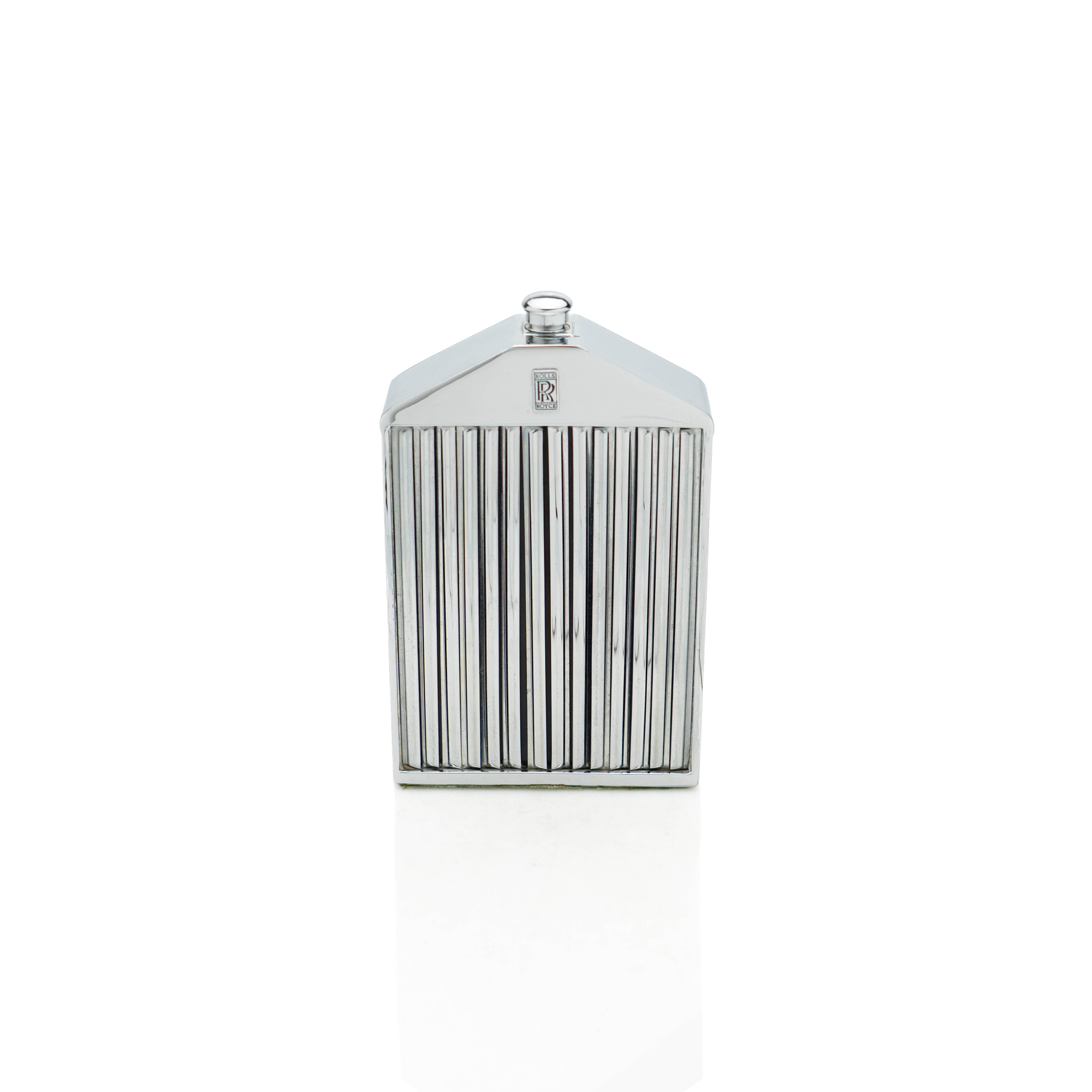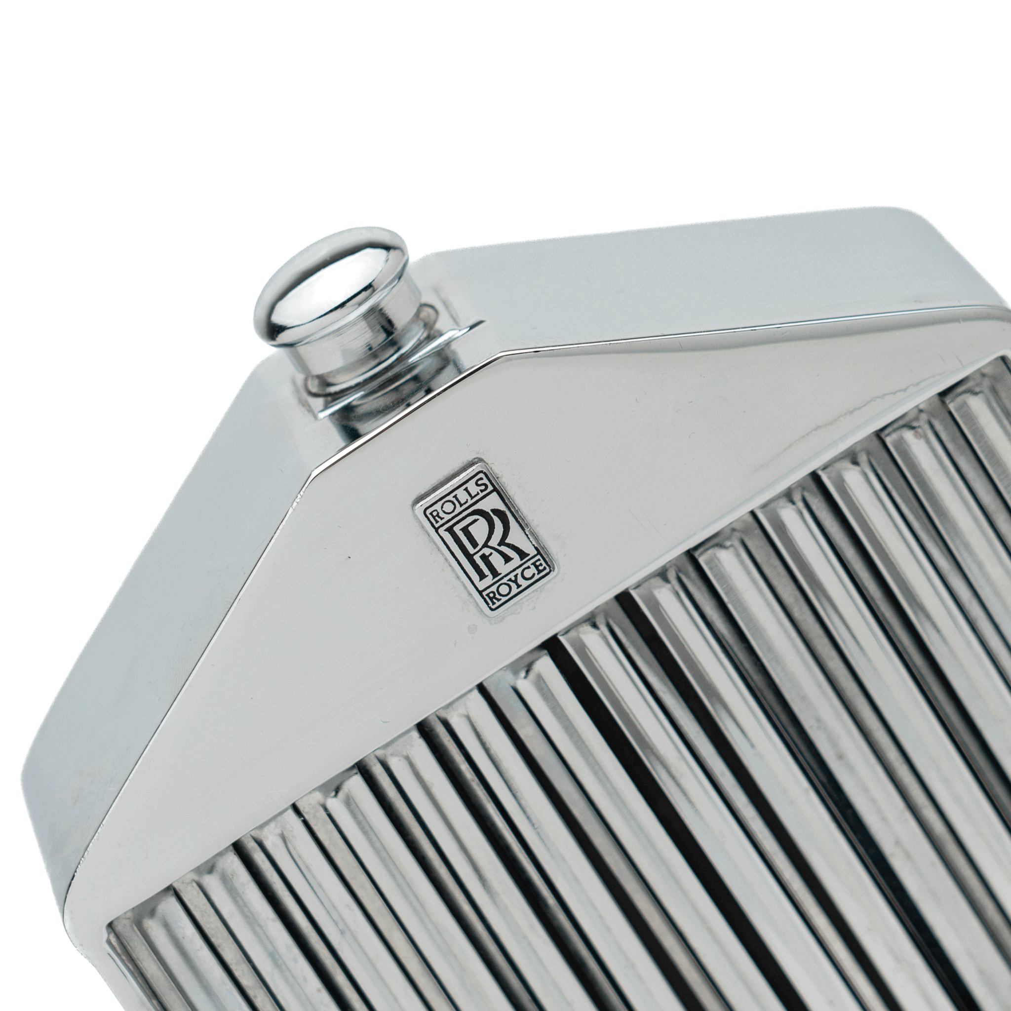A fine and rare Rolls-Royce flask in the form of their iconic car grill. Made in England as part of a series of rare car flasks, this is one of the seldom-seen examples. One needs only to unscrew the radiator cap to access the flask, and a thin exposed line on the backside of the flask allows one to see how much is remaining.
