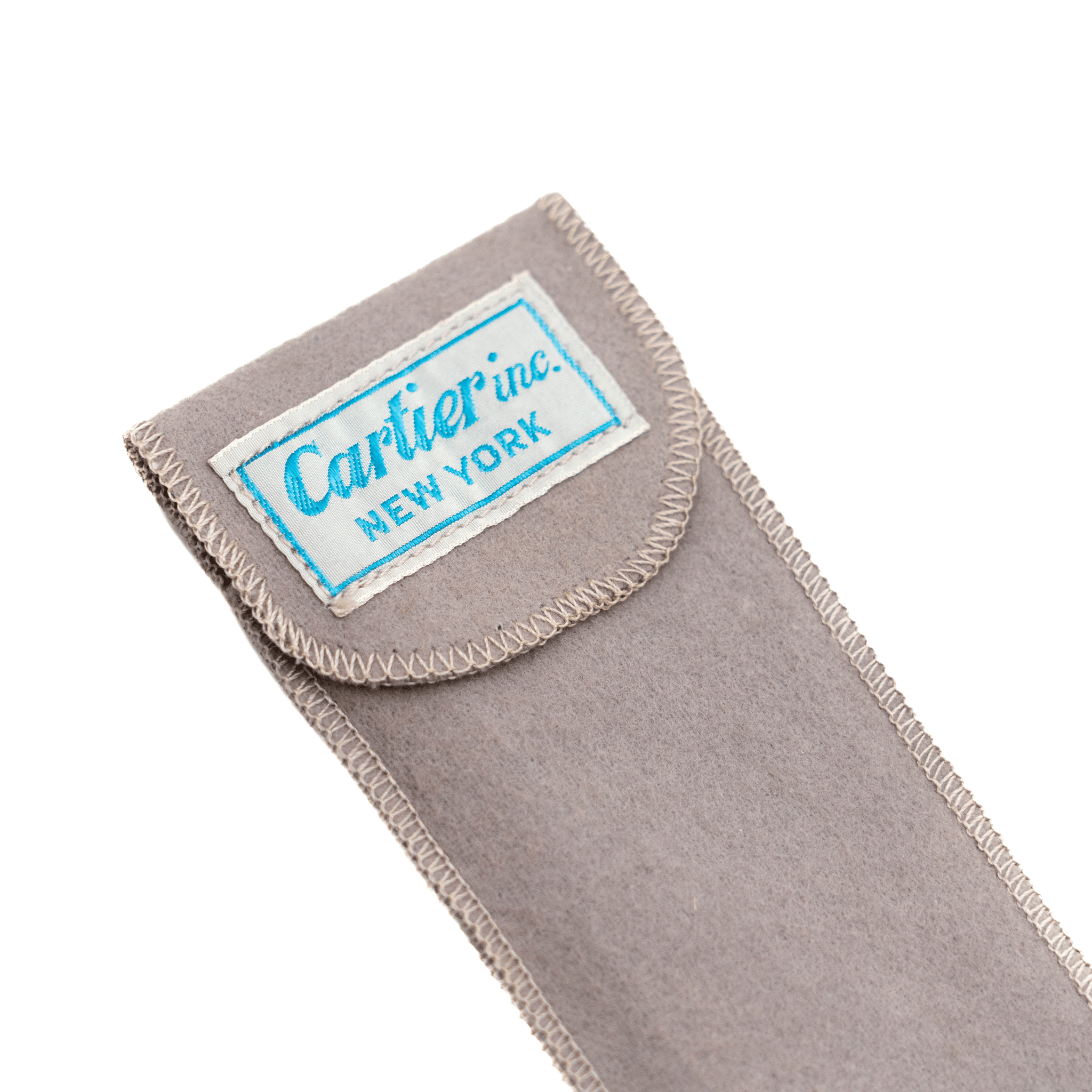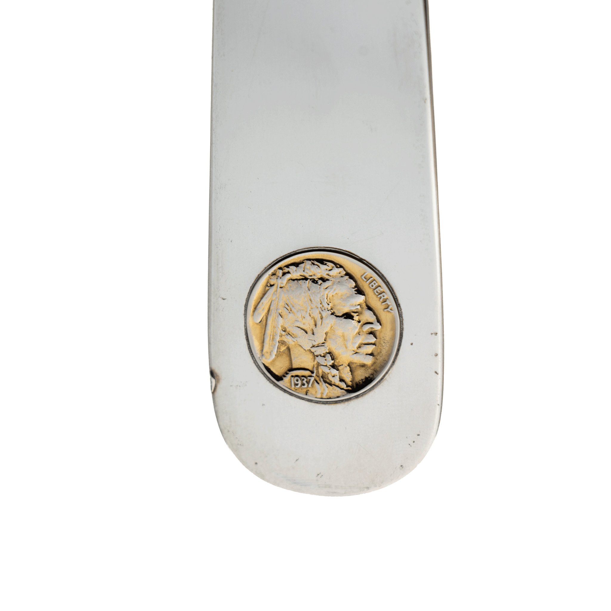 A fine and rare Cartier letter opener, fashioned out of sterling silver in a classic pointed shape, and inset with a gold-washed buffalo nickel. Housed in its original sleeve, this fabulous 1940s opener will be a perfect companion for any desk or table.