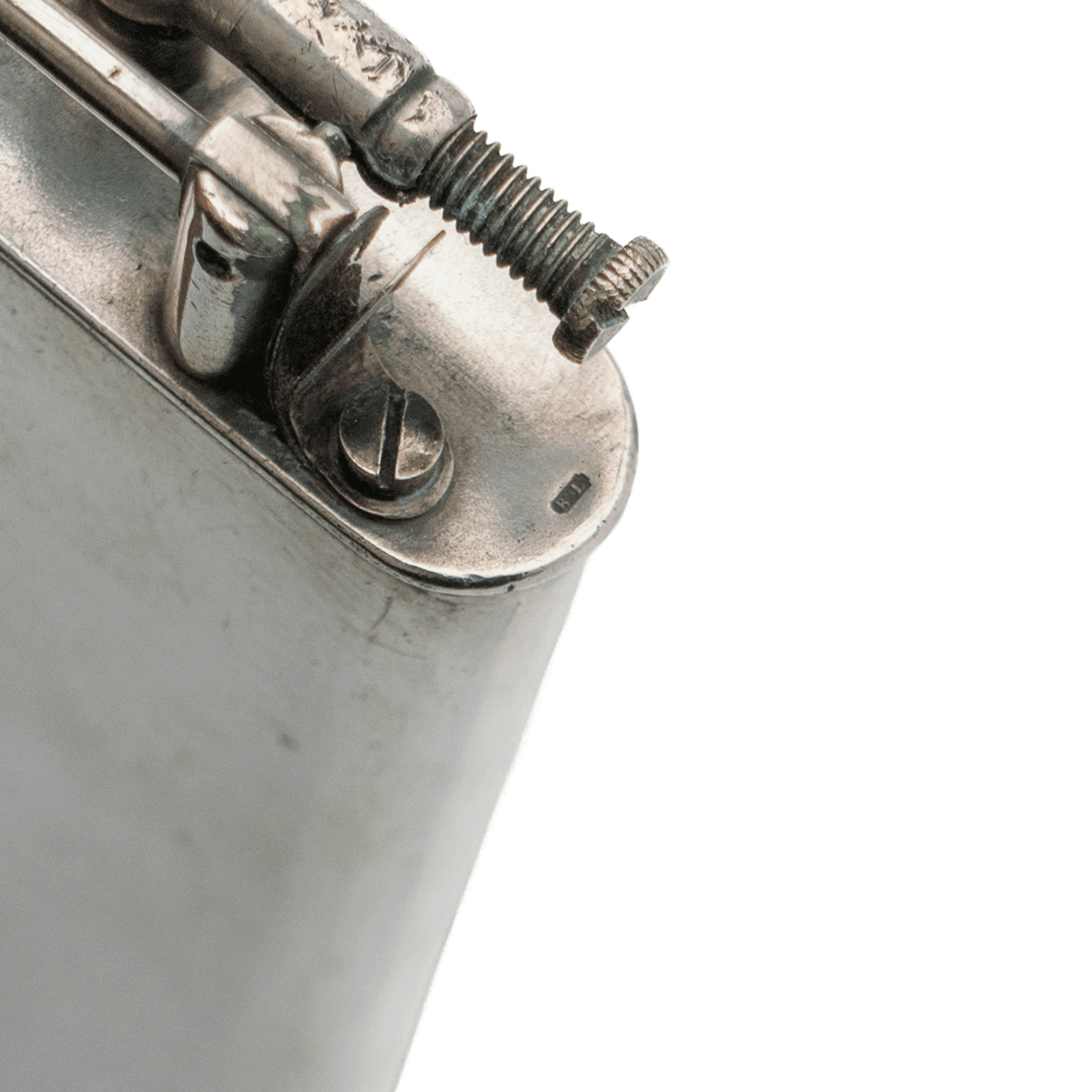 A fine and luxurious Dunhill table lighter in a silver-plated finish with its classic rounded base. Complete with a polished body, ready for monogramming, this elegant table lighter is perfect for any table, desk or bar.