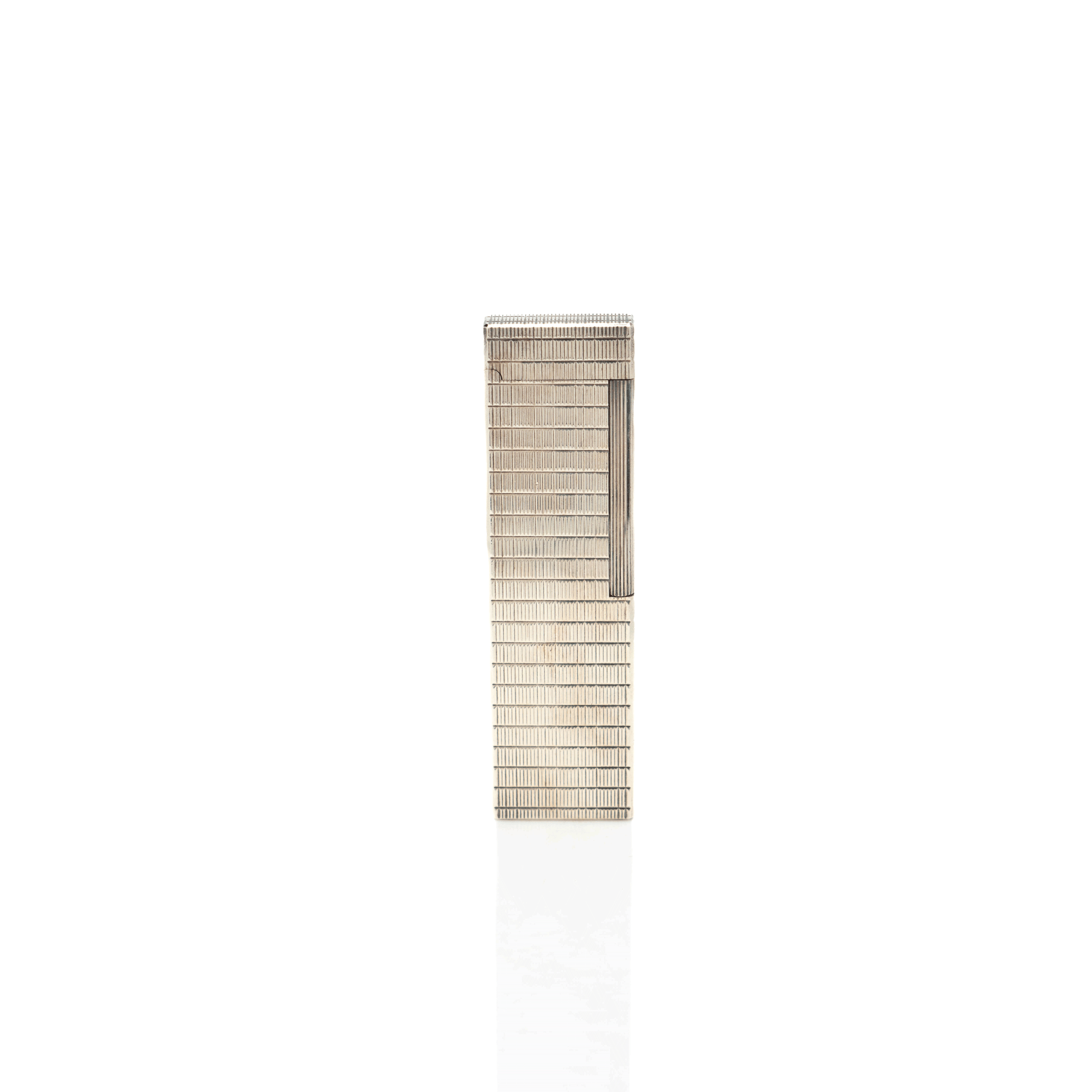 A fine and rare table lighter, by S.T. Dupont, the famed French lighter company. Fashioned out of a very heavy gauge silver-plated brass in their plaid pattern, this iconic and practical accessory comes complete with its rare original box.