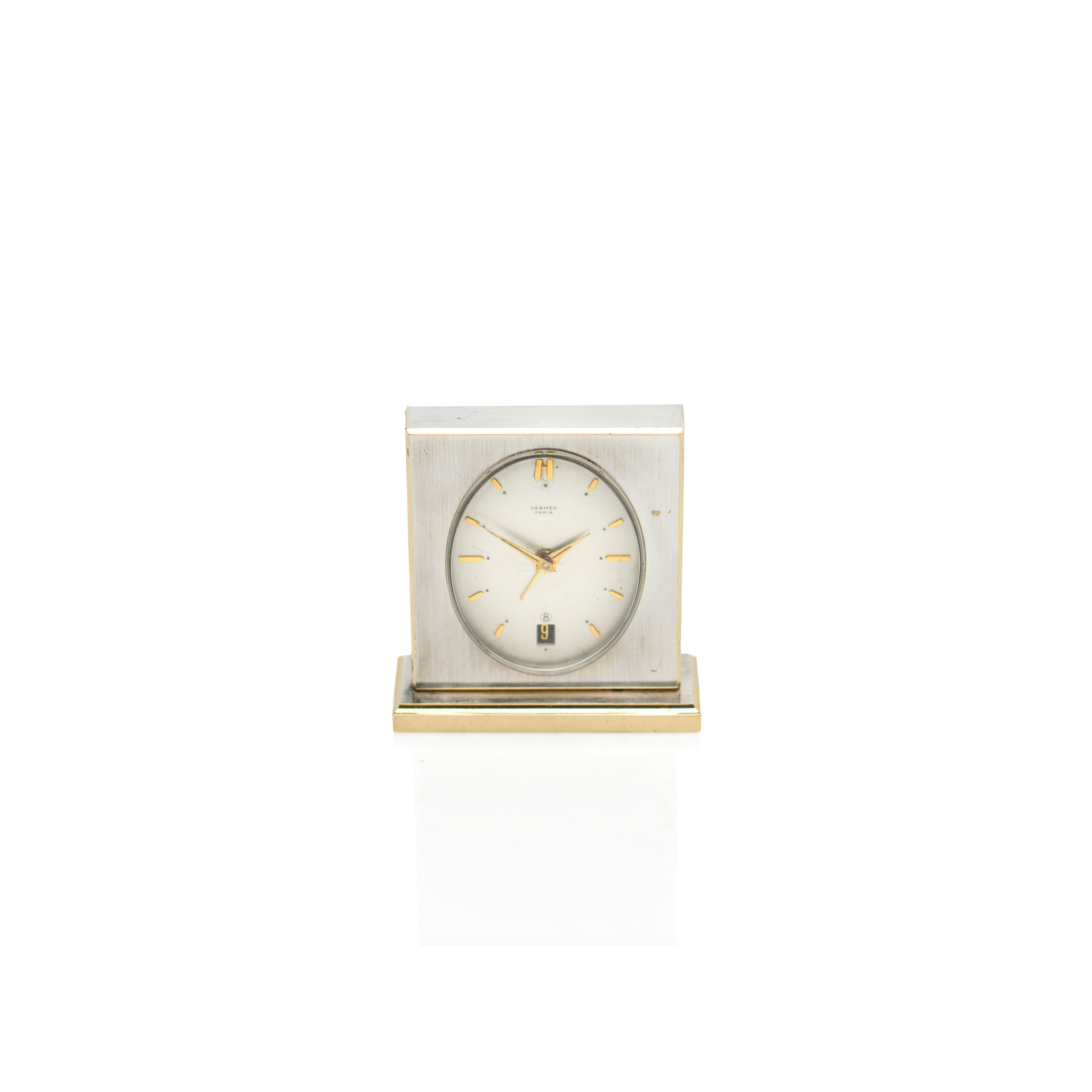 A fine and rare Hermes table clock, in a brushed silver finish with a stepped base. This decadent clock features a calendar function, an alarm function, and an 8-day movement.