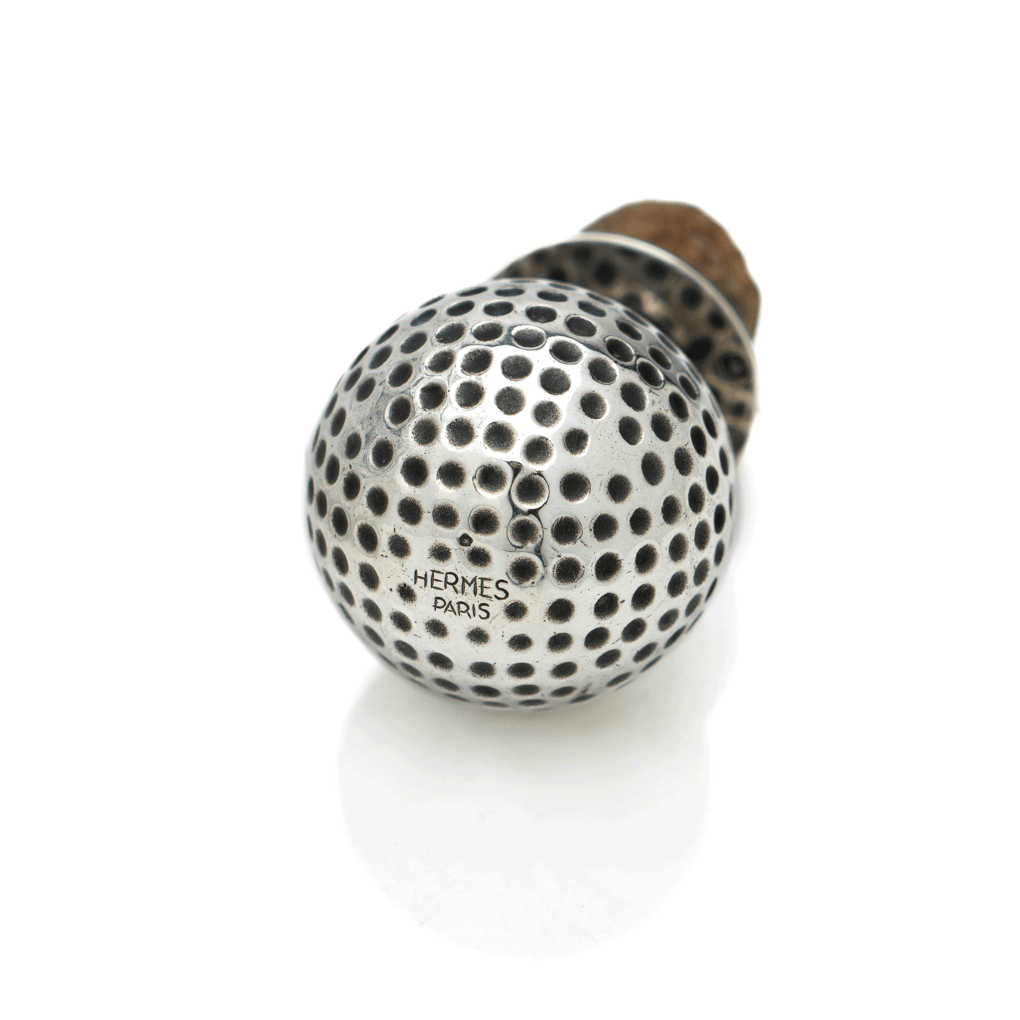 A fine and rare Hermes decanter with a Baccarat crystal body and a sterling silver collar with a figural golf-ball handle.
