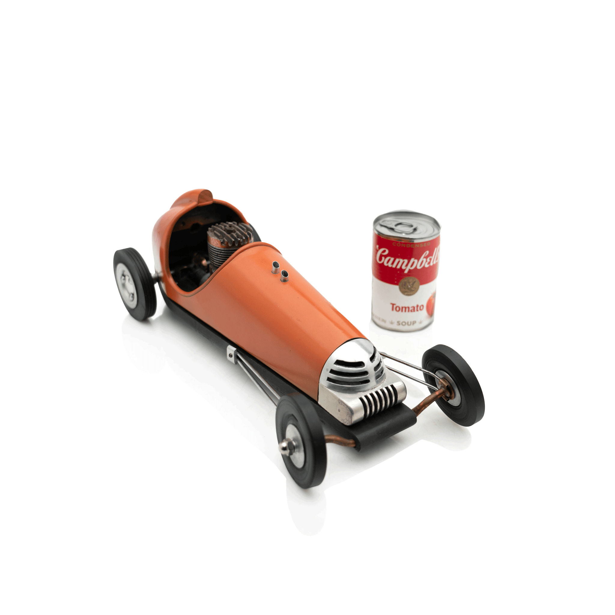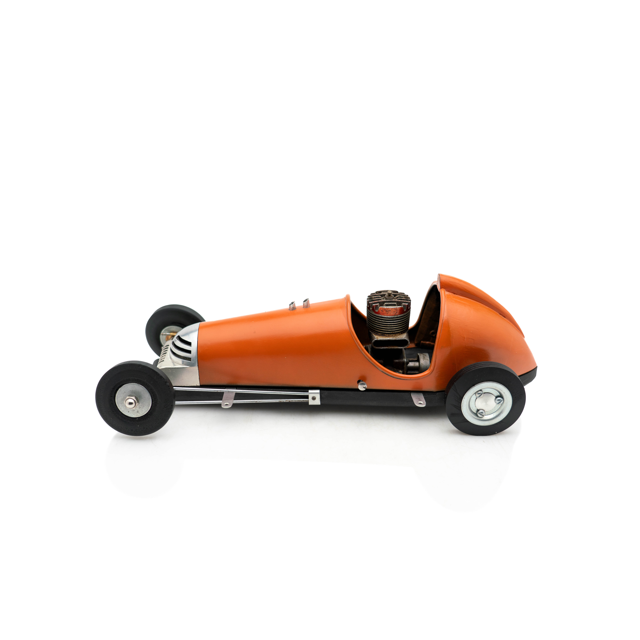 A cool and historic American gas-powered tether car, made in the 1940s. These gas-powered tether cars rose to popularity beginning in the early 20th century, first being homemade and eventually being produced by manufacturers. These incredible objects are equal parts sculpture and fun, a perfect piece for any car enthusiast.