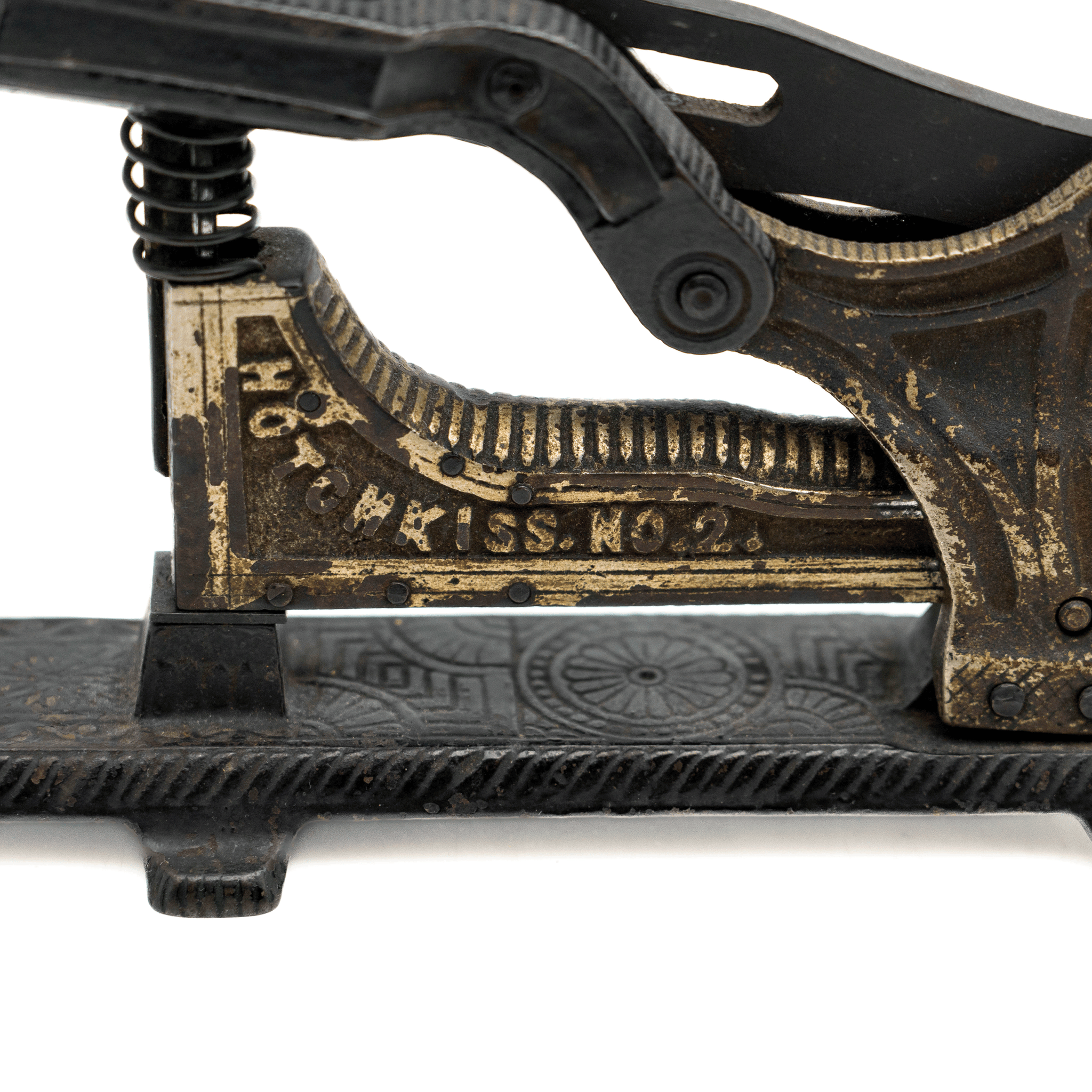 A cool and highly interesting cast-iron stapler, made by the American company, Hotchkiss, in the late 19th century. A turned wood handle is complemented by remnants of gilding along the side, making this classical yet usable piece of deskware perfect for any historic home.