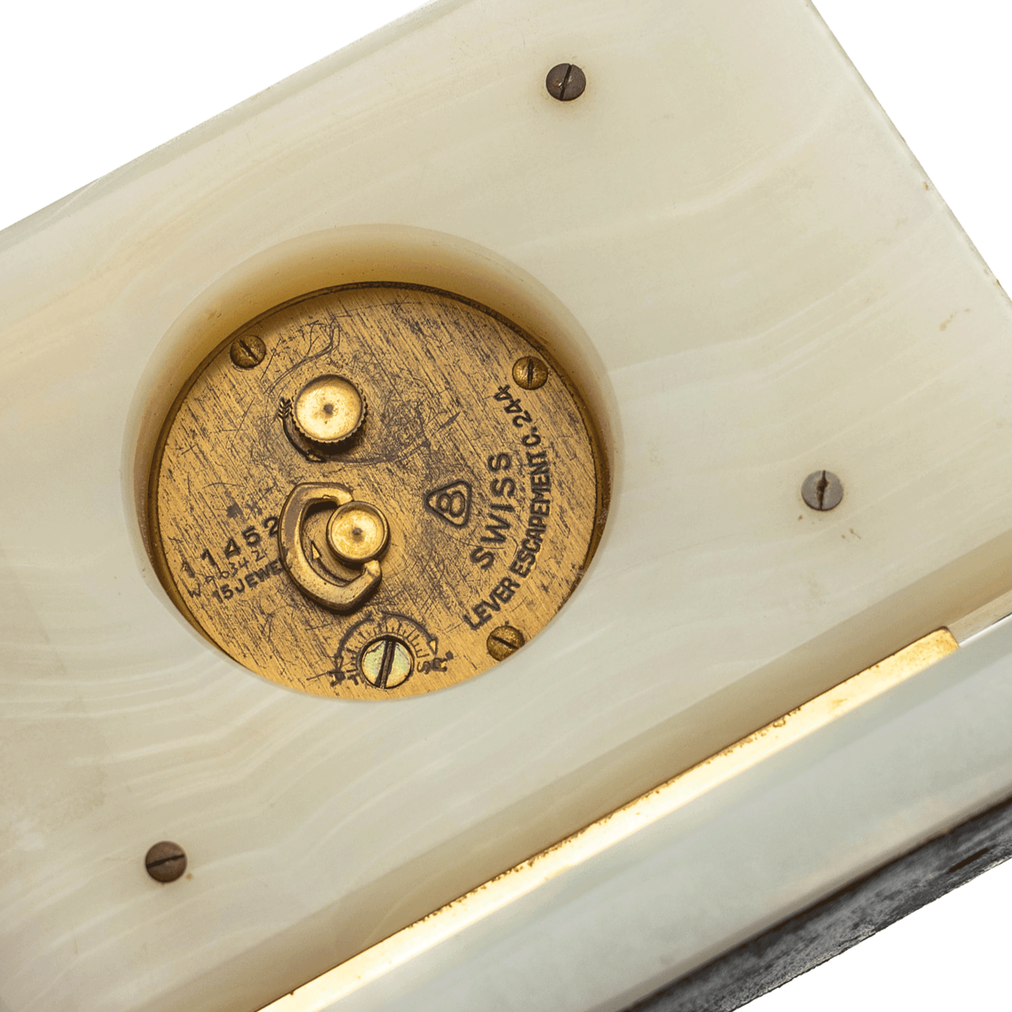 A fine and decadent desk set by Asprey. Crafted out of Onyx, Lapis, and gilt-brass, this set includes a picture frame, letter rack, ashtray set, clock, and bookends. This fabulous set will provide a perfect pop of texture and color on any desk.