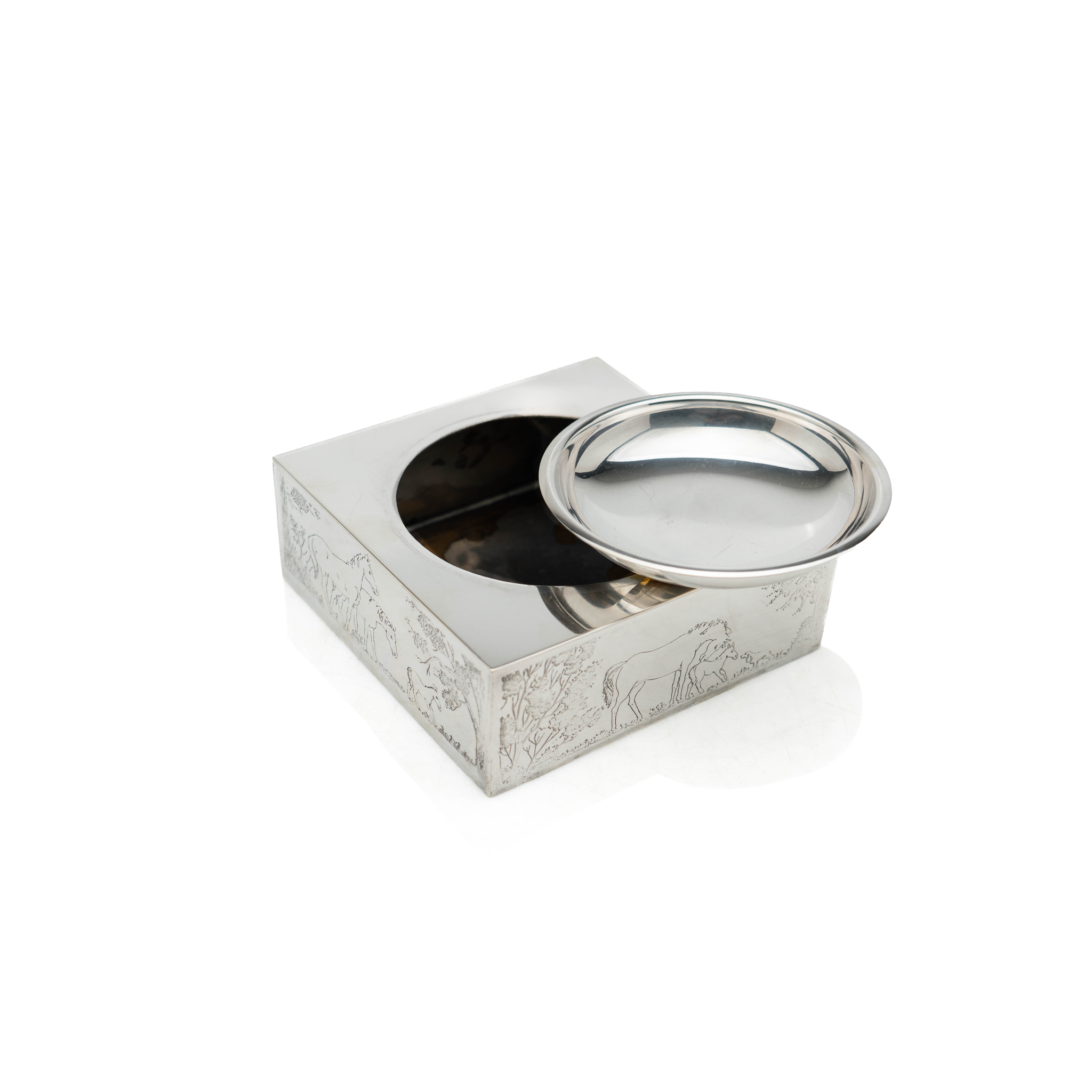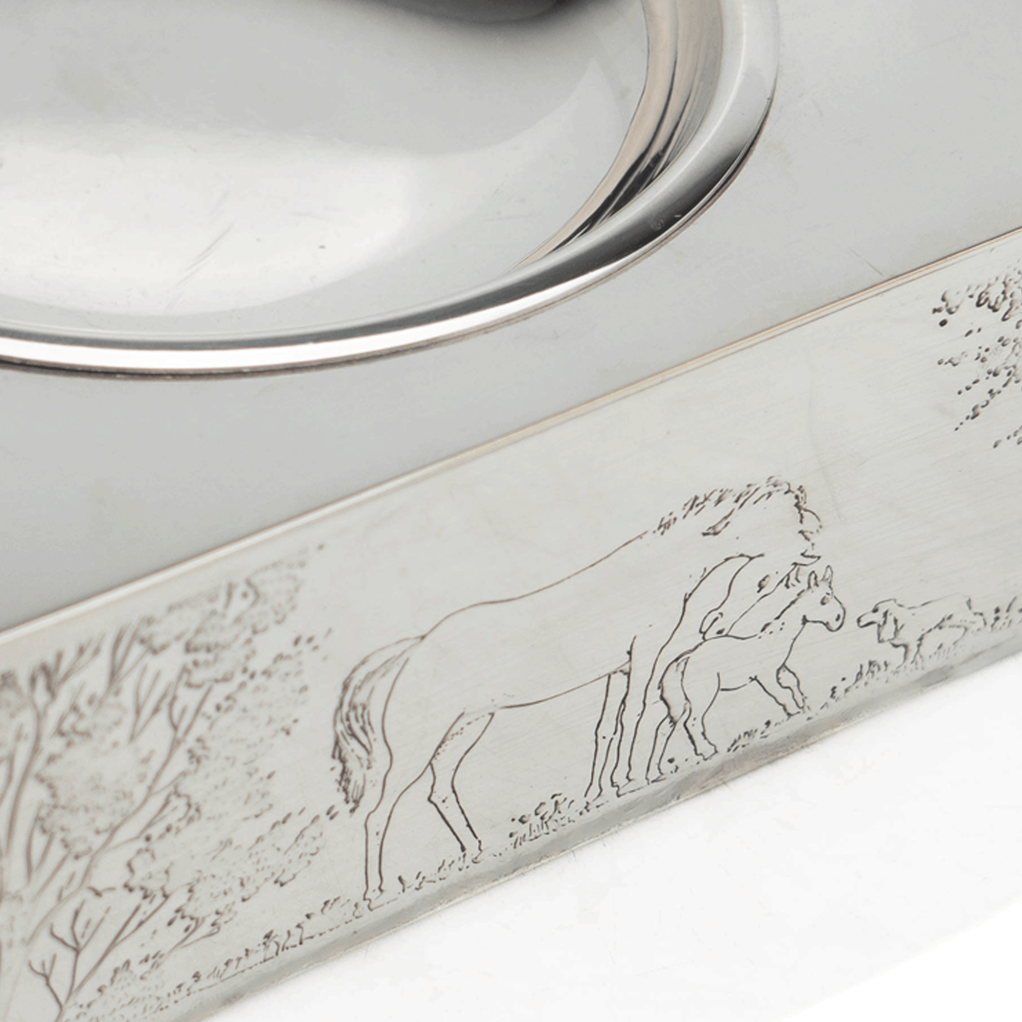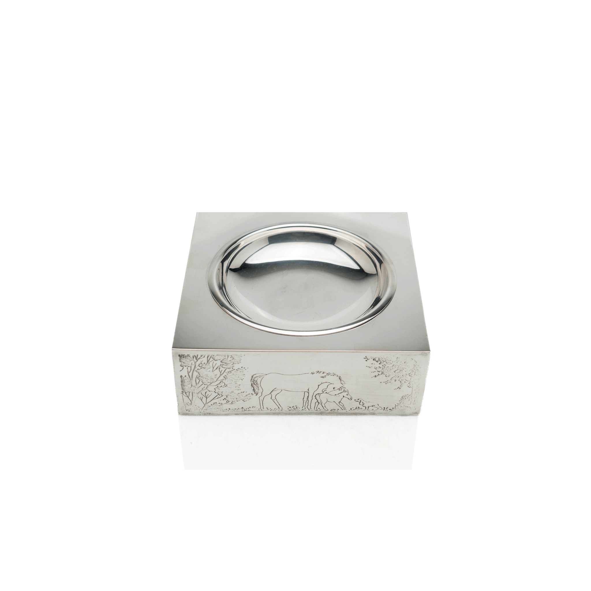 A fine and elegant Christian Dior catchall, fashioned out of silver-plated brass with a lovely engraved equestrian motif around the perimeter. A simple concave base allows for ease of use, perfect for any equestrian-inspired home.
