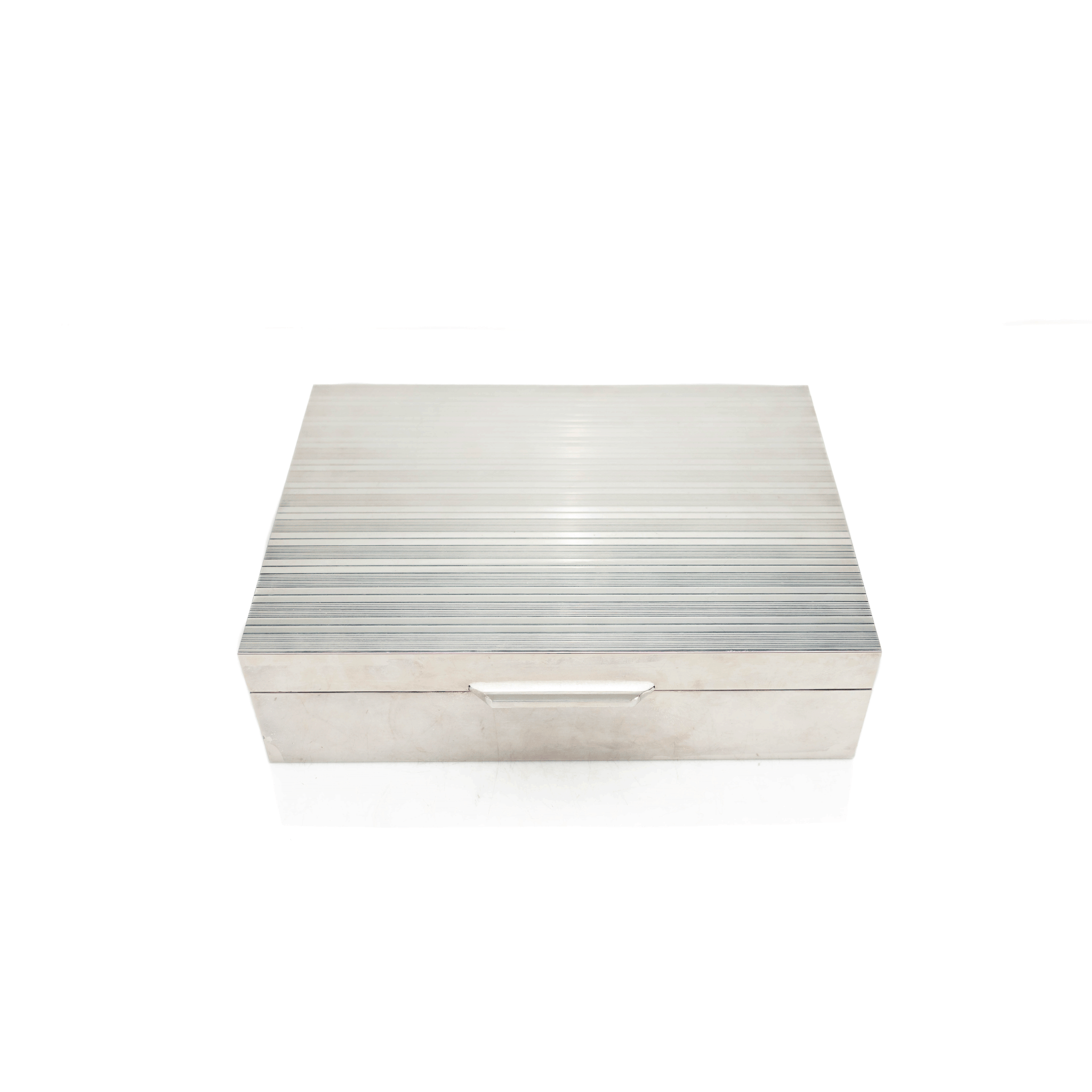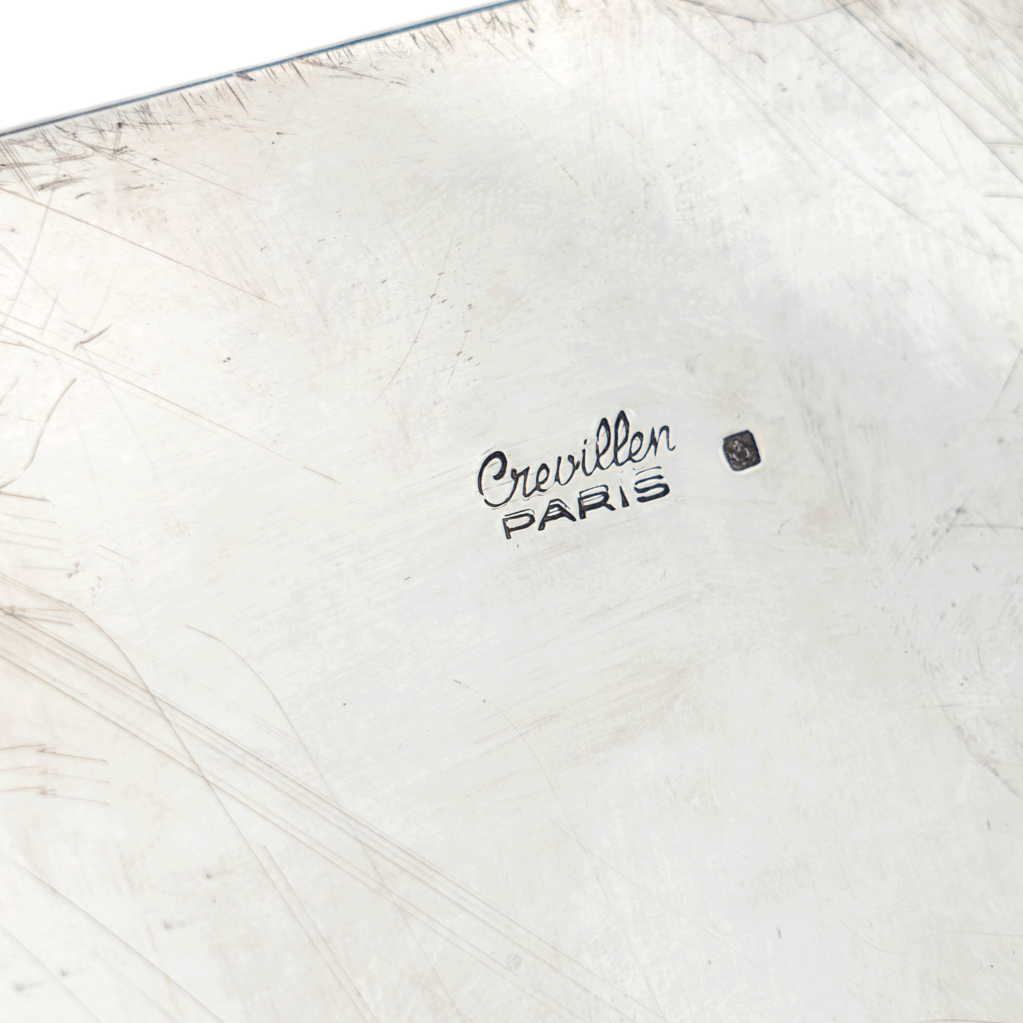 A fine and elegant French box lined in velvet by Crevillen, a famed French silversmith. Crafted out of silver-plated brass, this lovely box has a deco-inspired fluting across the top of the lid, a perfect box for the desk, coffee table or dresser.