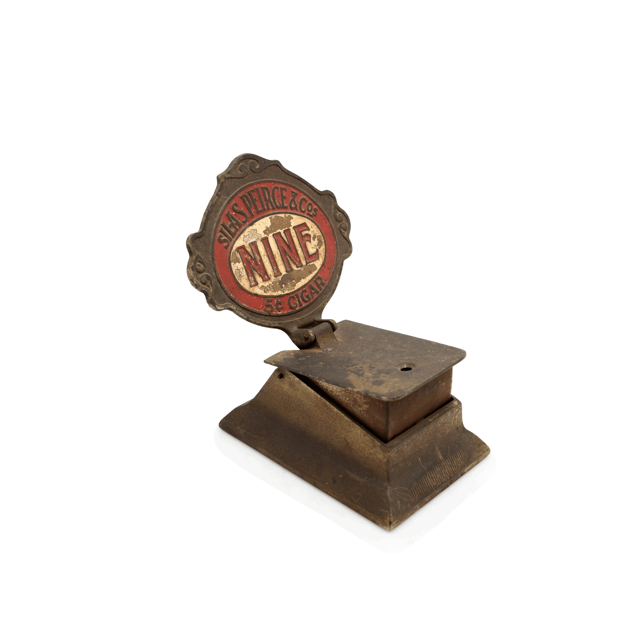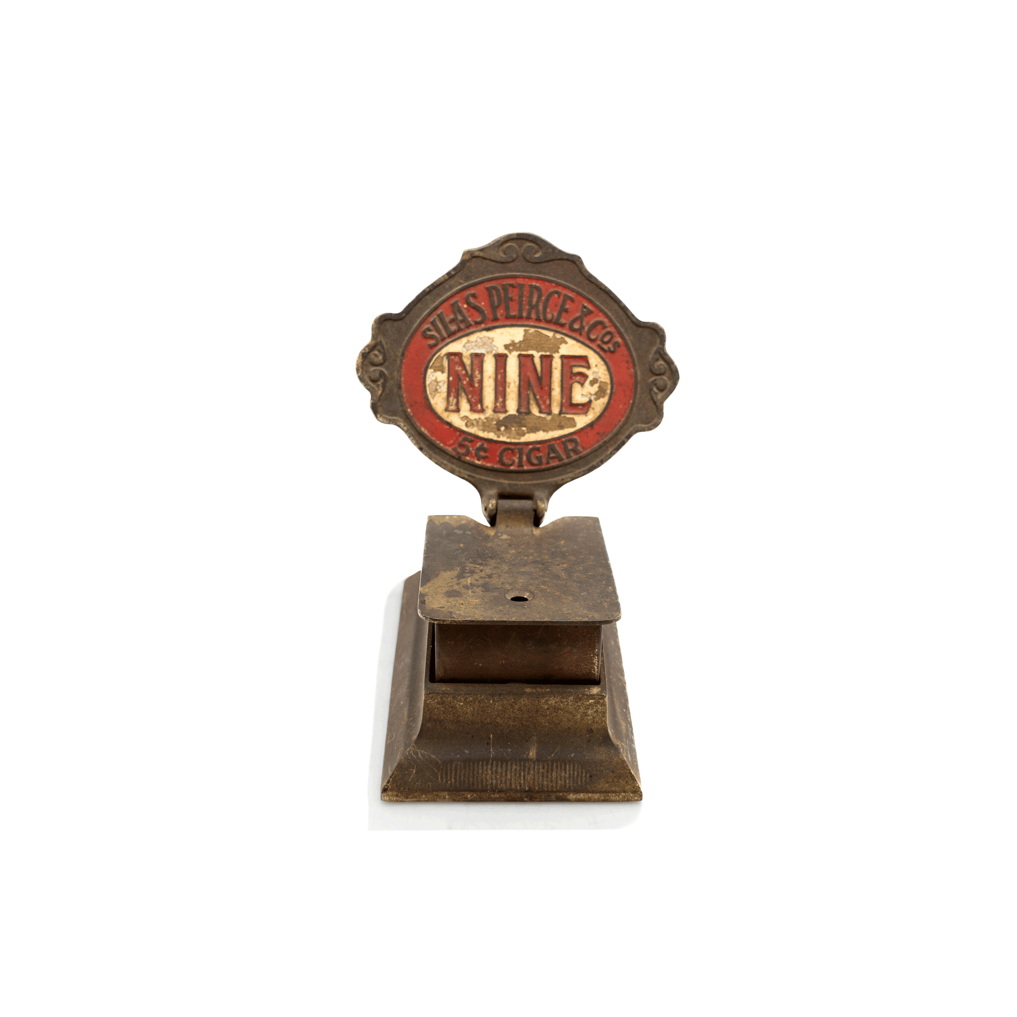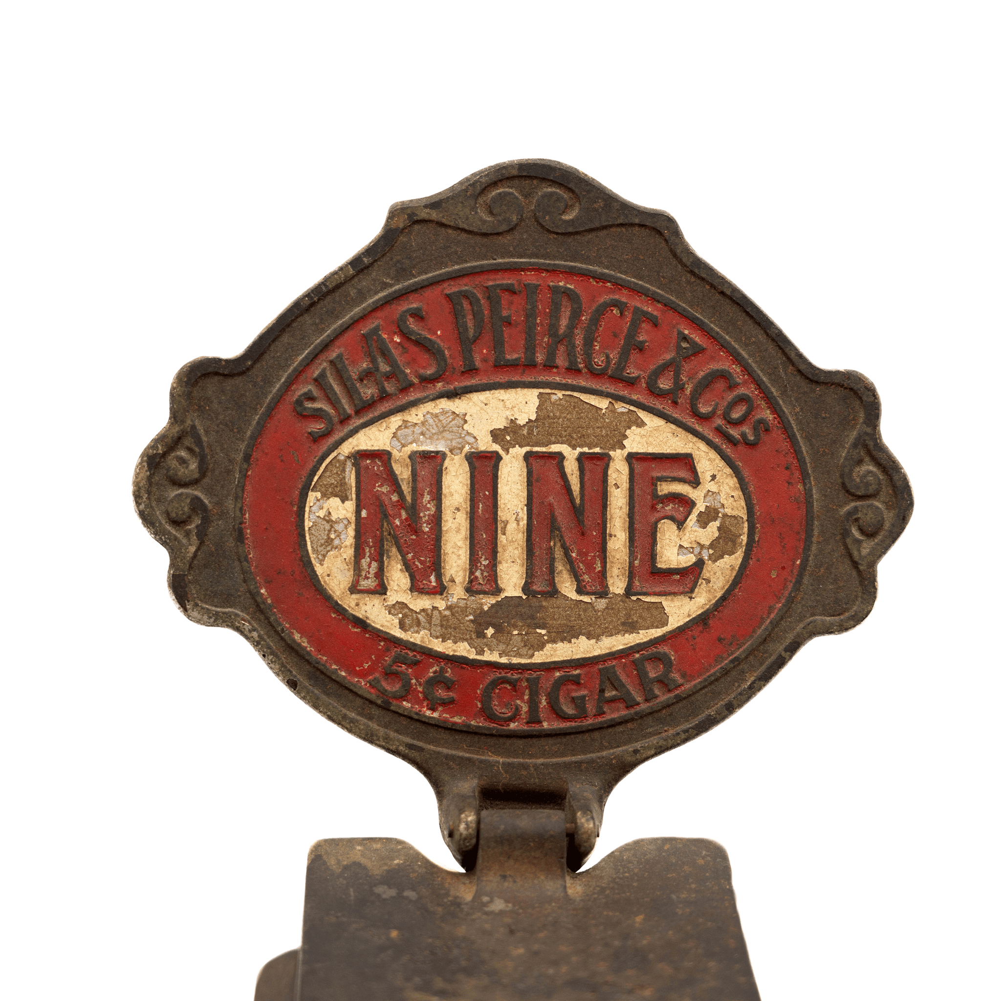 A cool and captivating cast iron cigar cutter advert, made for Silas Peirce & Co., to advertise their 5-cent 'Nine' cigar. Retaining much of its original enamel paint, this rare and intriguing cigar cutter is a perfect window into the history of cigars in America.