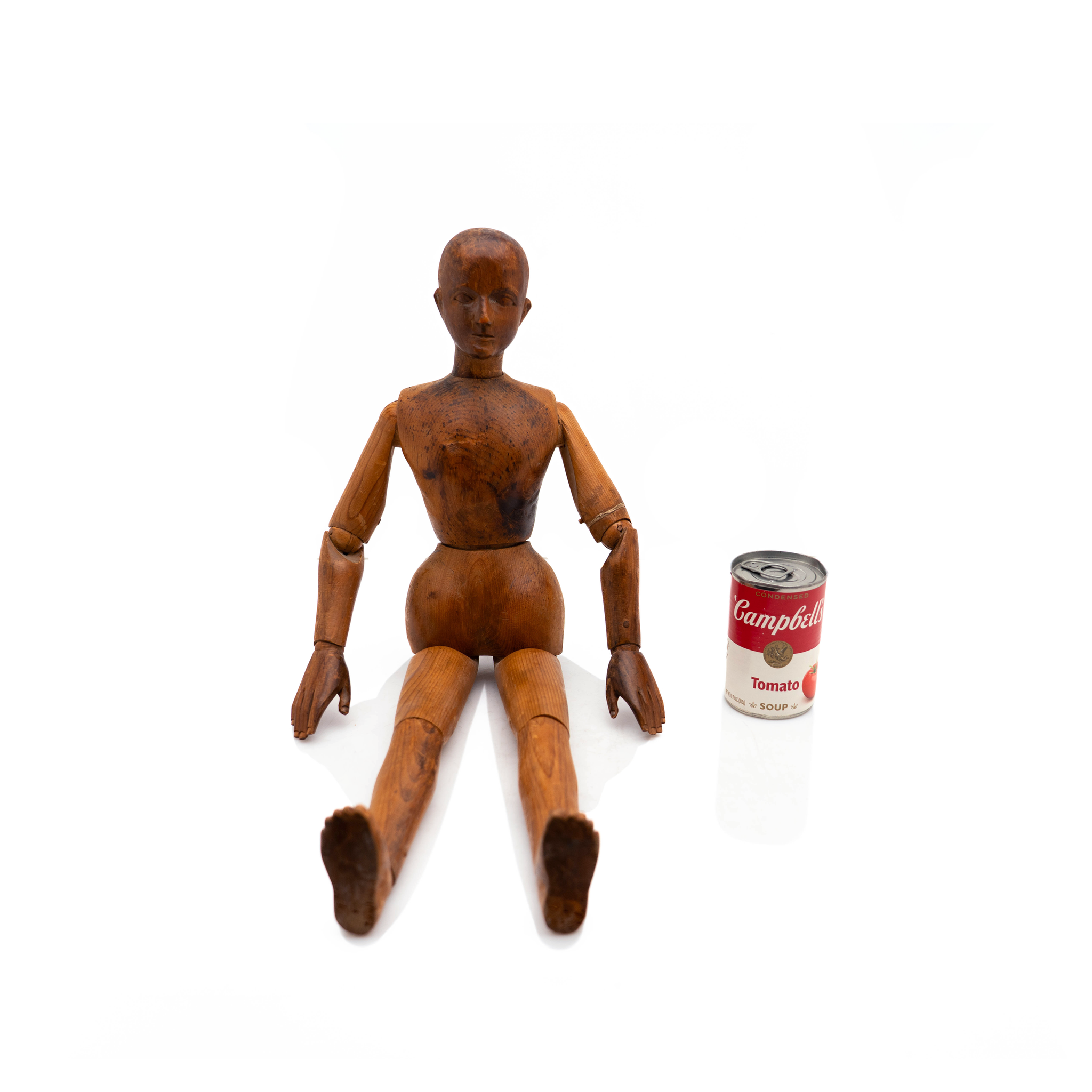 A fine and rare 19th-century French articulated mannequin, entirely crafted from wood. Each joint of the model can articulate as the human body does, allowing these rare models to be used for drawing and sculpting the human form. This example boasts a wonderfully carved face and digits -- coveted features that make this mannequin a fabulous example.