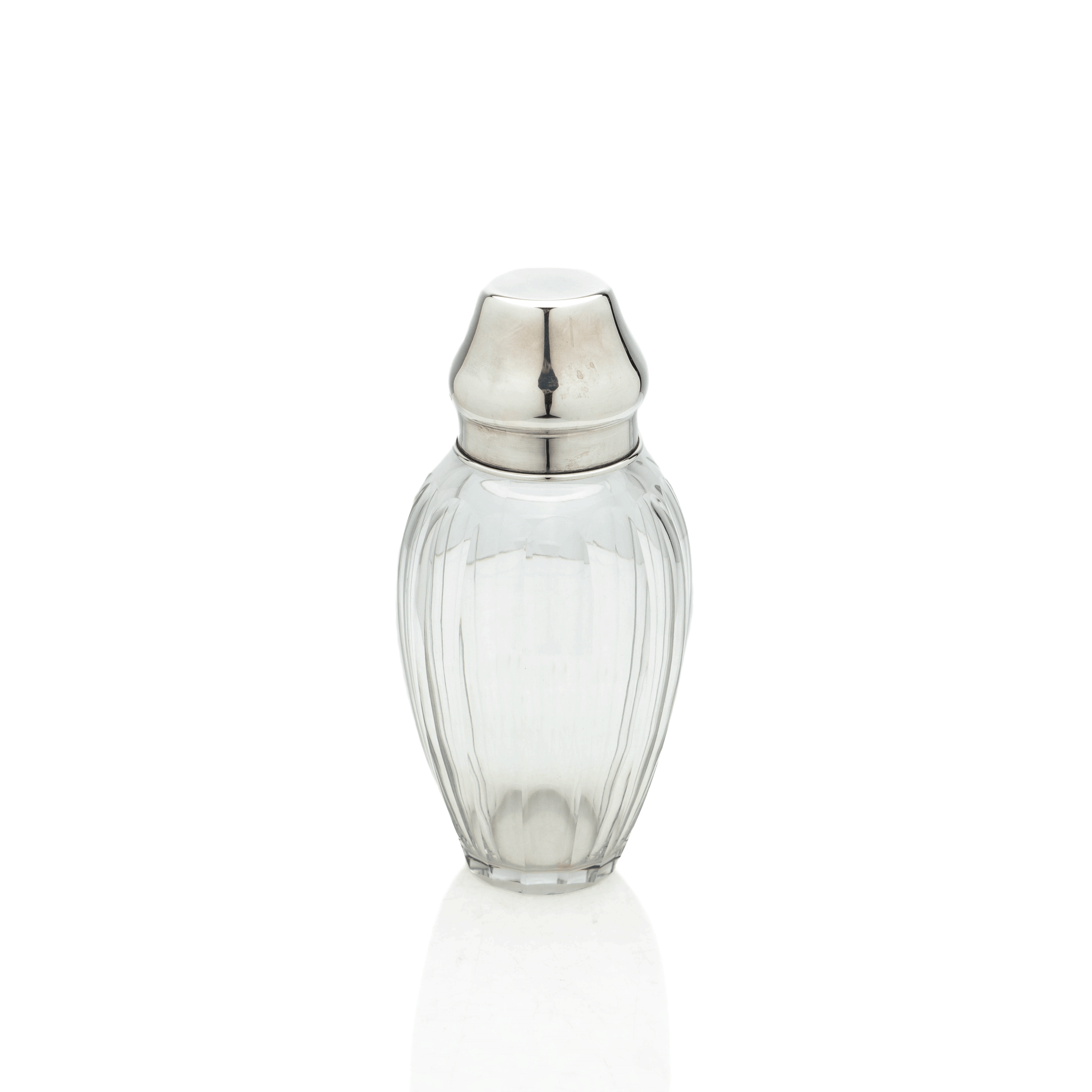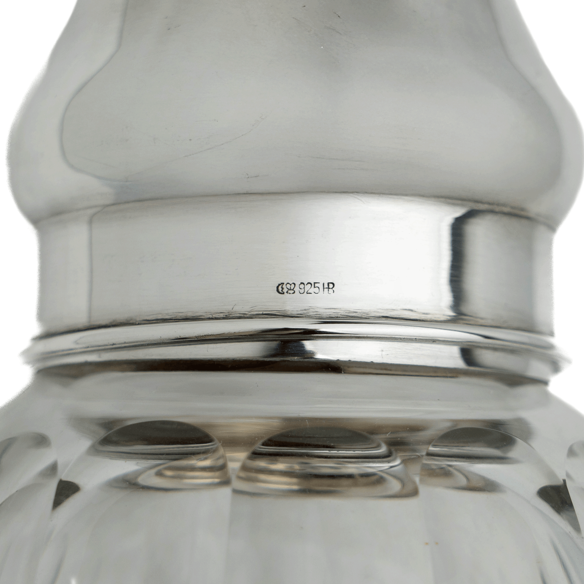 A fine and elegant French crystal and sterling silver cocktail shaker. A simple faceted crystal pattern is complemented by a sterling cap and strainer, fashioned in a rounded point form. This practical and decadent shaker will be perfect to elevate any bar or party.