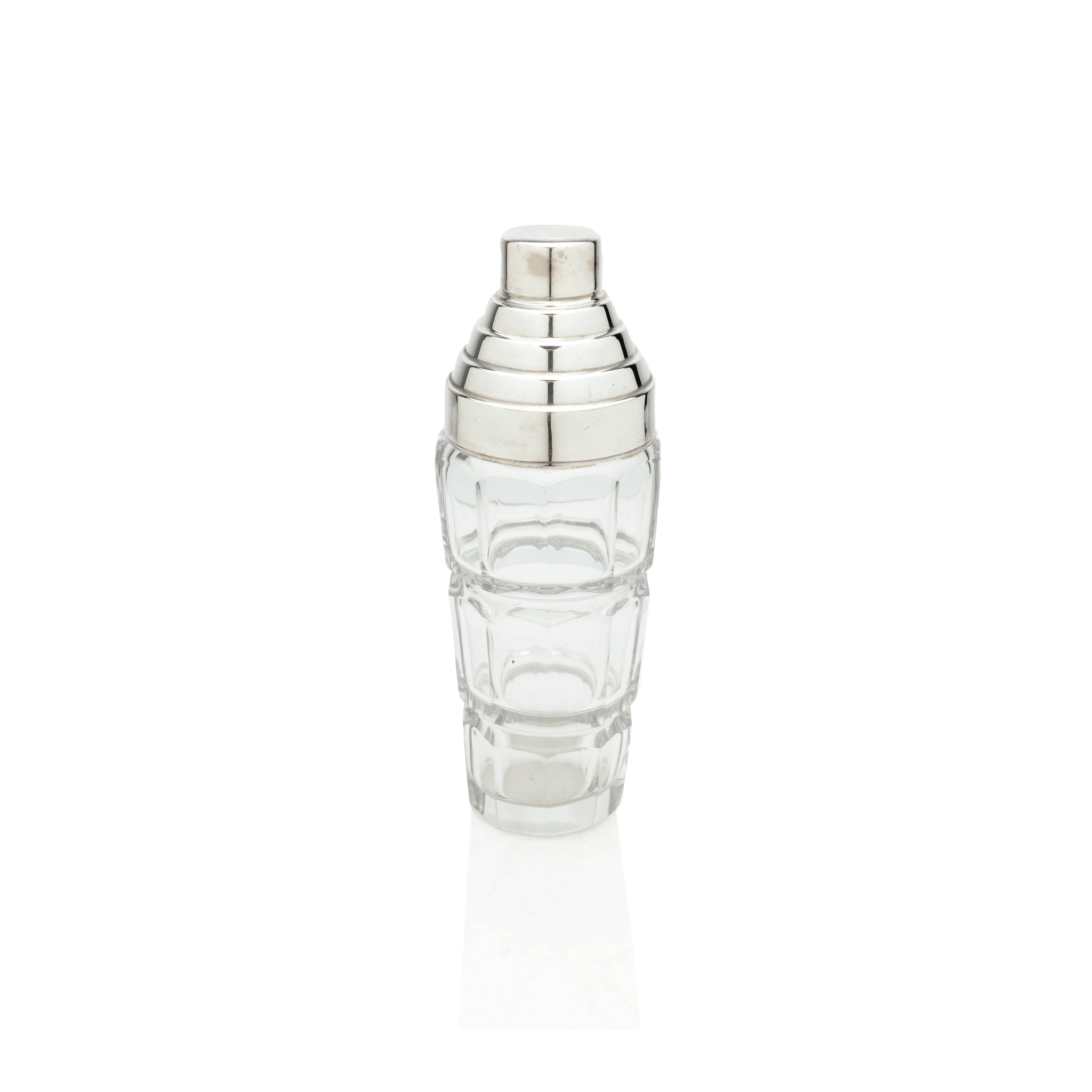 A fine and large French cocktail shaker, beautifully crafted out of glass and sterling silver. A geometric glass body is perfectly accented by a deco-inspired stepped cap and strainer, both beautifully crafted from sterling silver. Let this large and impressive shaker be a perfect companion for your next party.