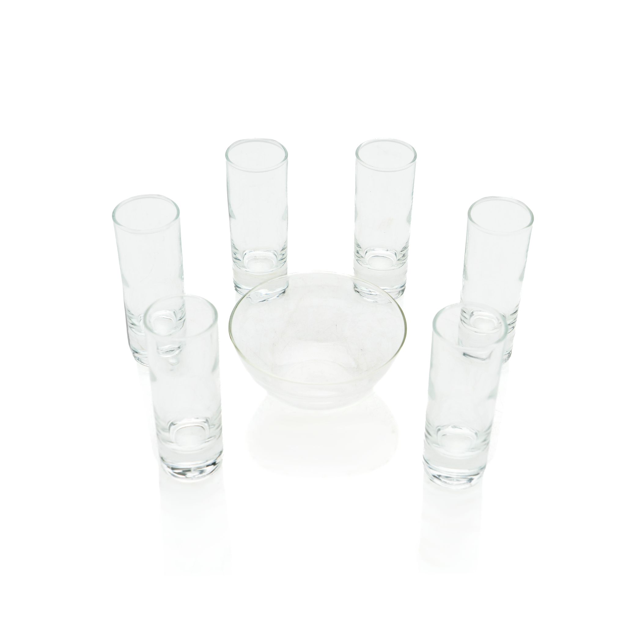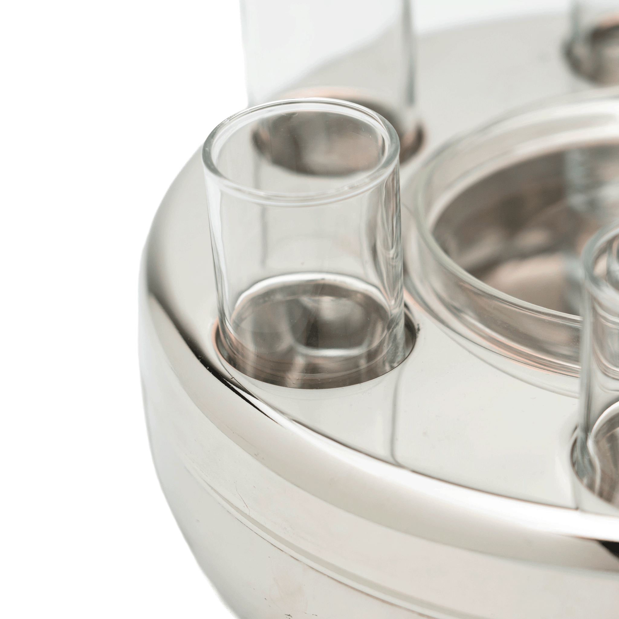A simple yet refined French glass caviar and vodka service, complete with a fitted votive for caviar and six shot-glasses, all housed in a silver-plated brass chamber. This practical and chic piece of barware will be perfect for your bar or next event.