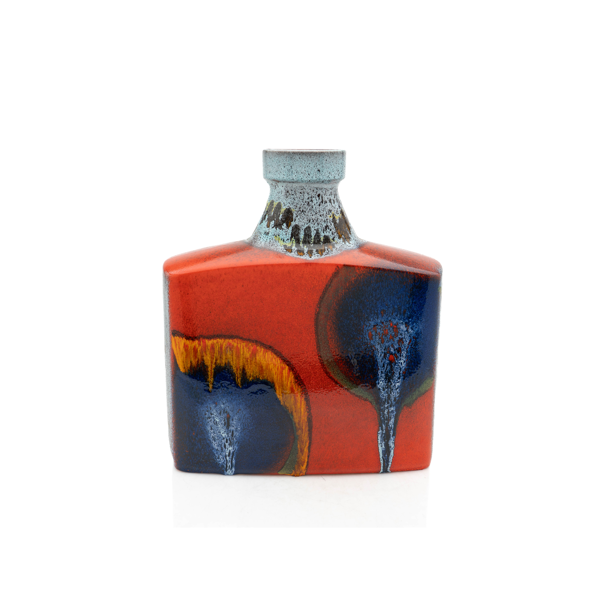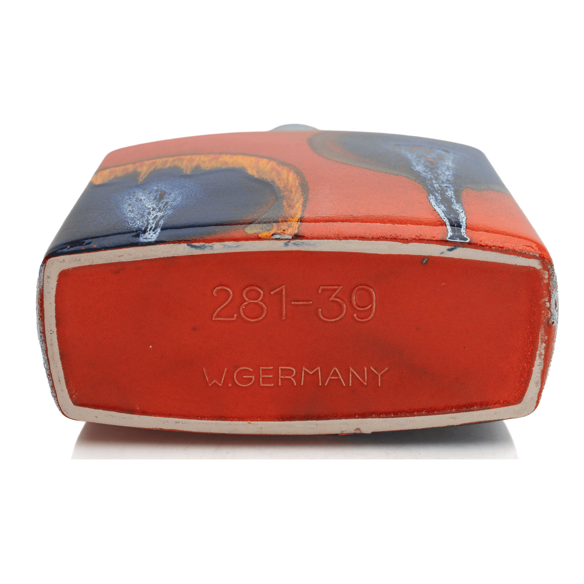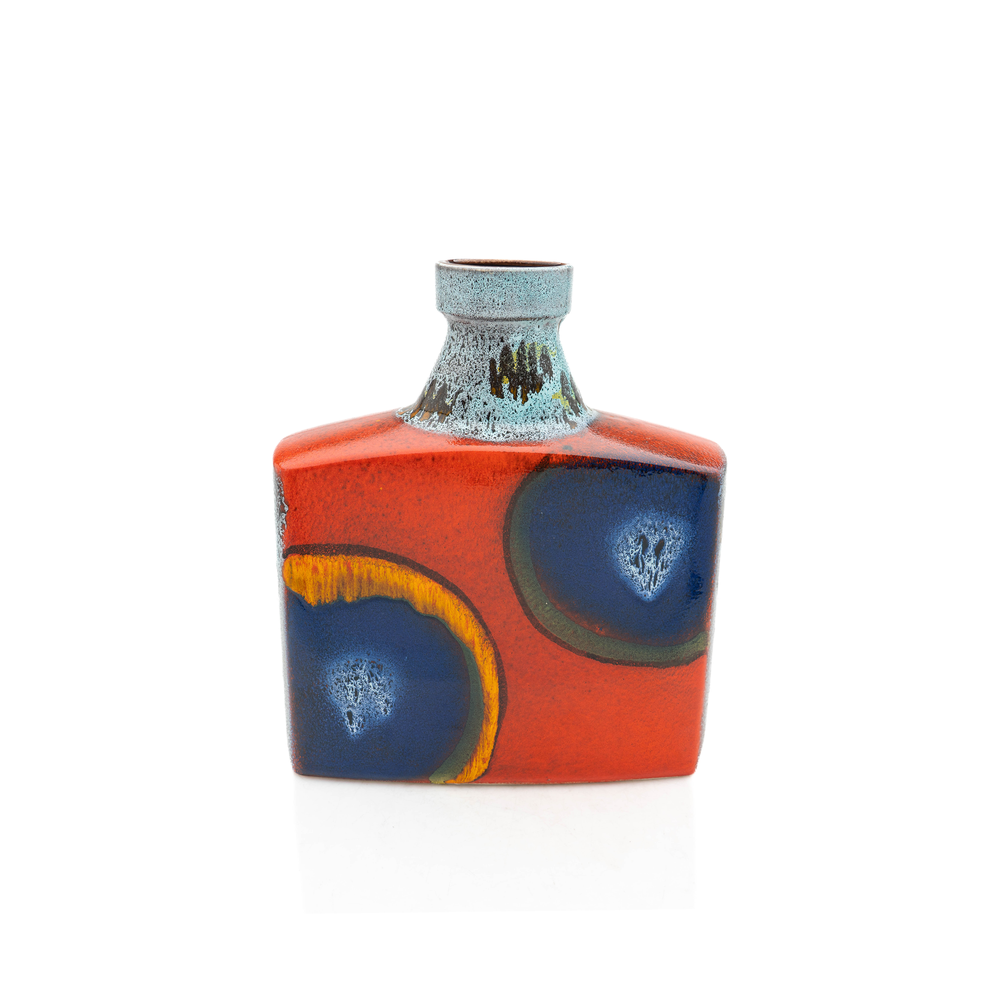 A giant and graphic ceramic vase, made in West Germany in the 1970s. A large squared body is met with a pinched neck, providing the perfect body for the optic and highly visual glaze applied. Let this vibrant vase add a touch of color to any room it's set in.