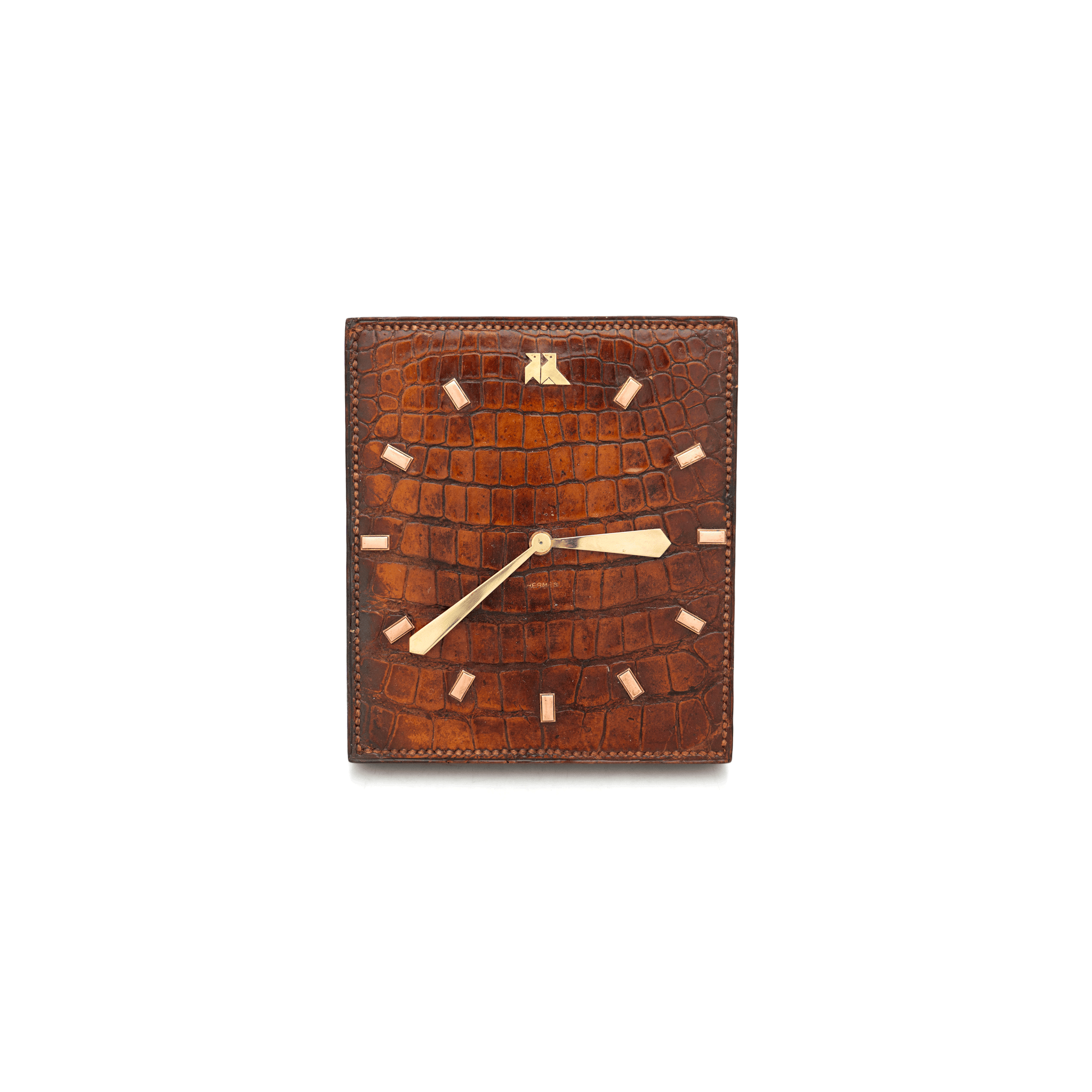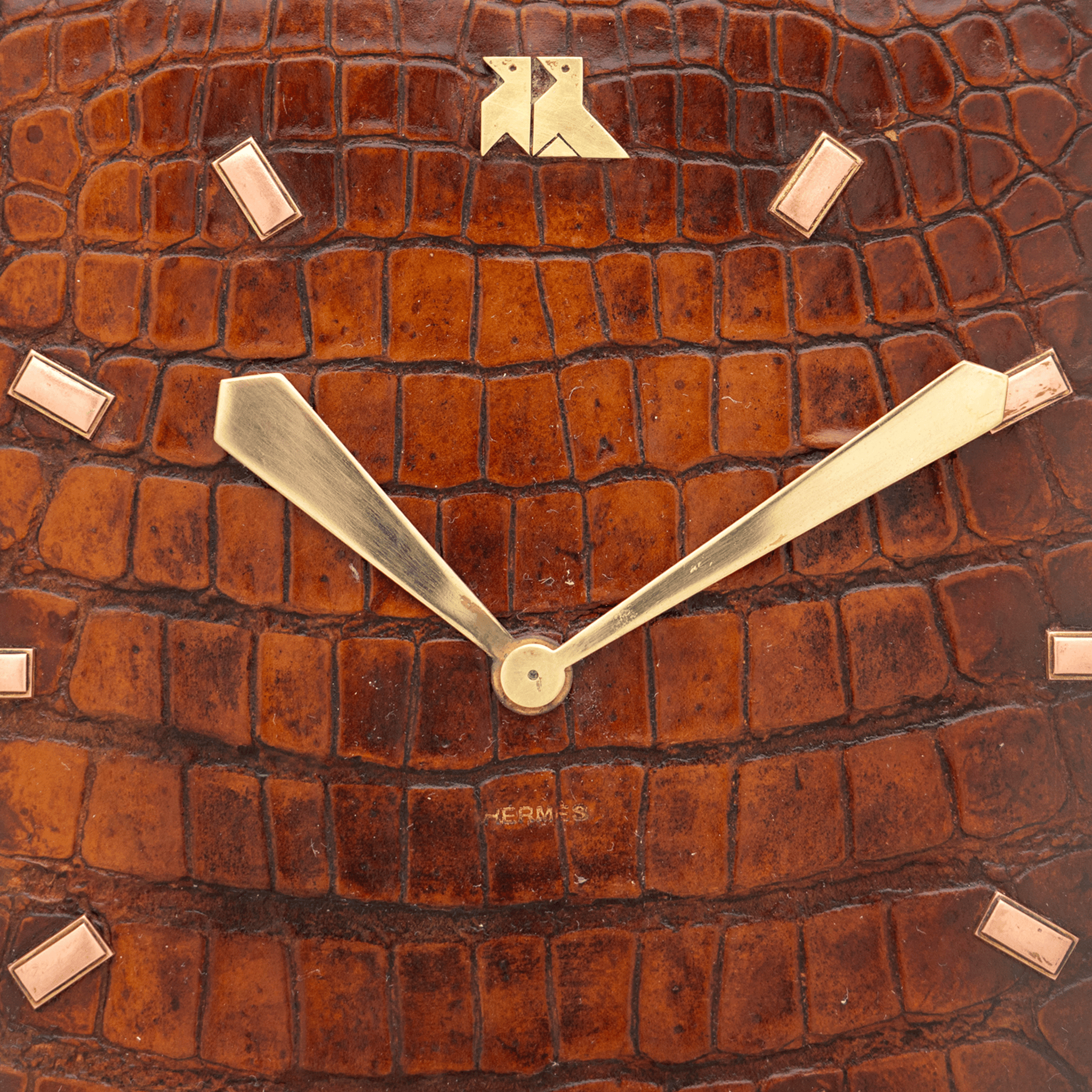 A fine and very rare Hermes clock, designed by Paul Dupre-Lafon. Fashioned entirely out of alligator, with gilt indexes and hands, this is a fantastic example of Paul Dupre-Lafon's work with Hermes, and the lengths they would go to for true, classic luxury.