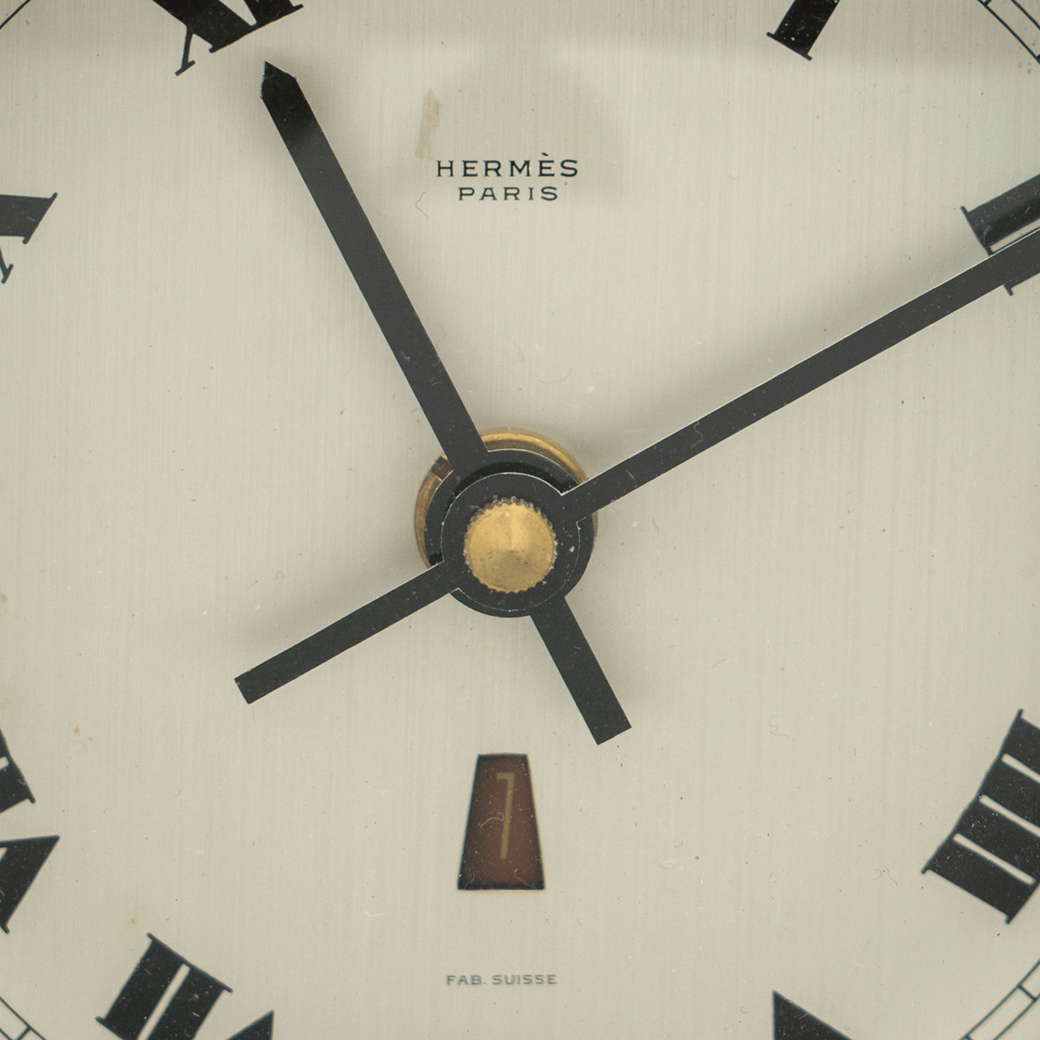A cool and sleek clock by Hermes, in the form of a working porthole. This interesting clock features a calendar function and easel backing as well as a quartz movement.