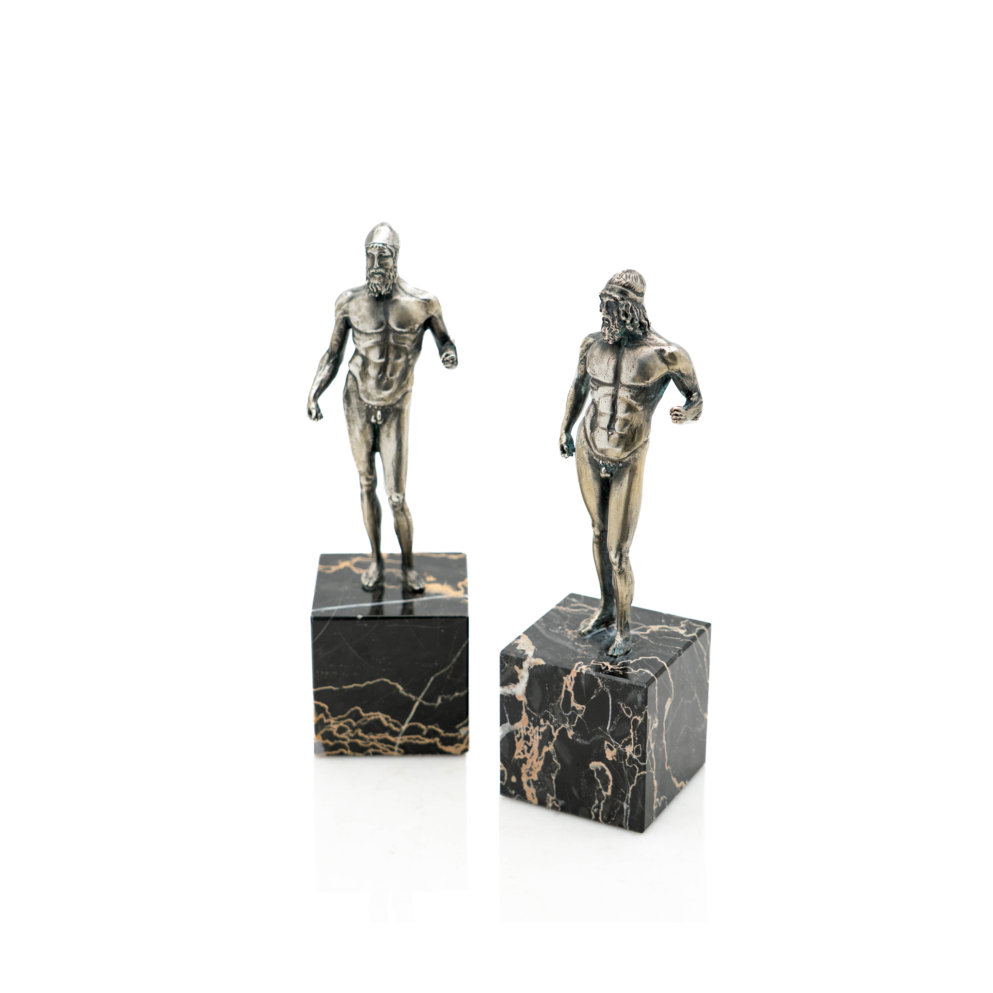 A fine and rare pair of miniature sculptures of Greek warriors, each fashioned out of sterling silver and set upon a marble base. These 1960s Italian sculptures are a wonderful and lively set, surely able to brighten any desk, shelf or table.