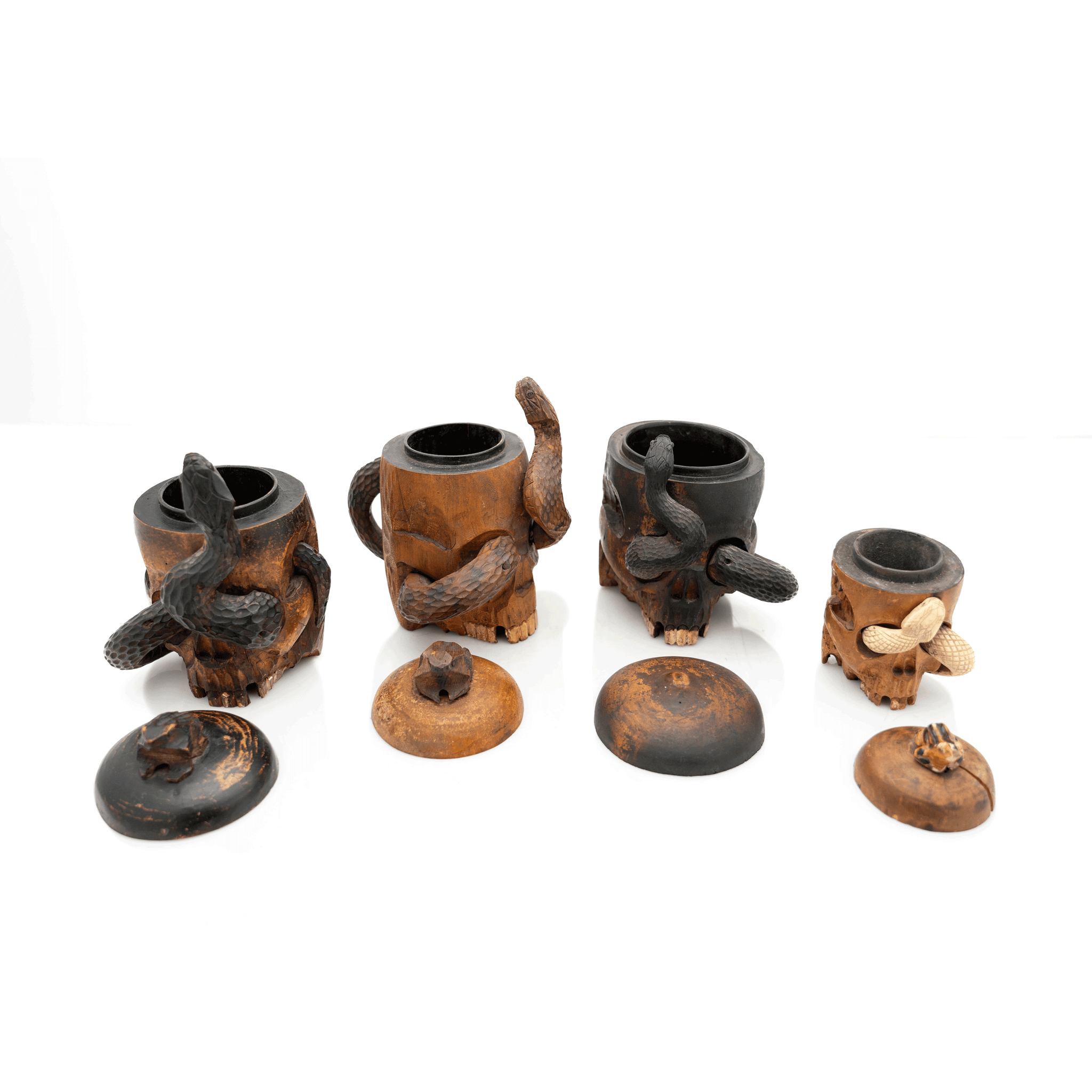 A very fine and rare group of Japanese carved wood skull boxes, made during the Meiji period (1867-1912), each features a carved wooden snake intertwined in the skull and a toad that doubles as a lid finial. This rare and fabulous group is a great example of the quality of woodwork happening in Japan during this period.