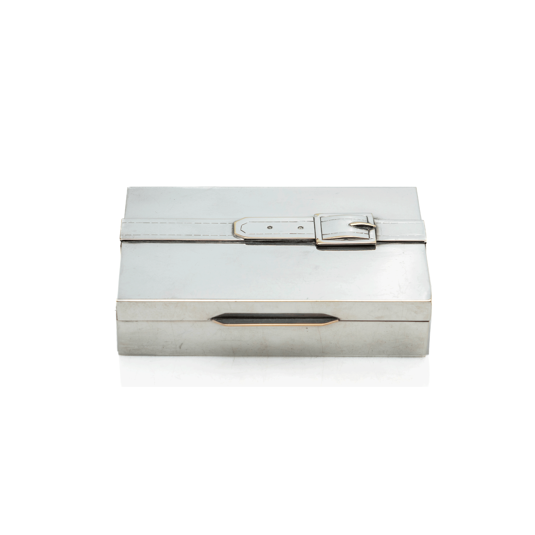 A stunning and rare belt-strap box by Maria Pergay in silver-plated brass. This extraordinary piece is one of Pergay's most iconic forms and comes complete with an original 1950s interior inscription, this statement piece will elevate any room it's put in.