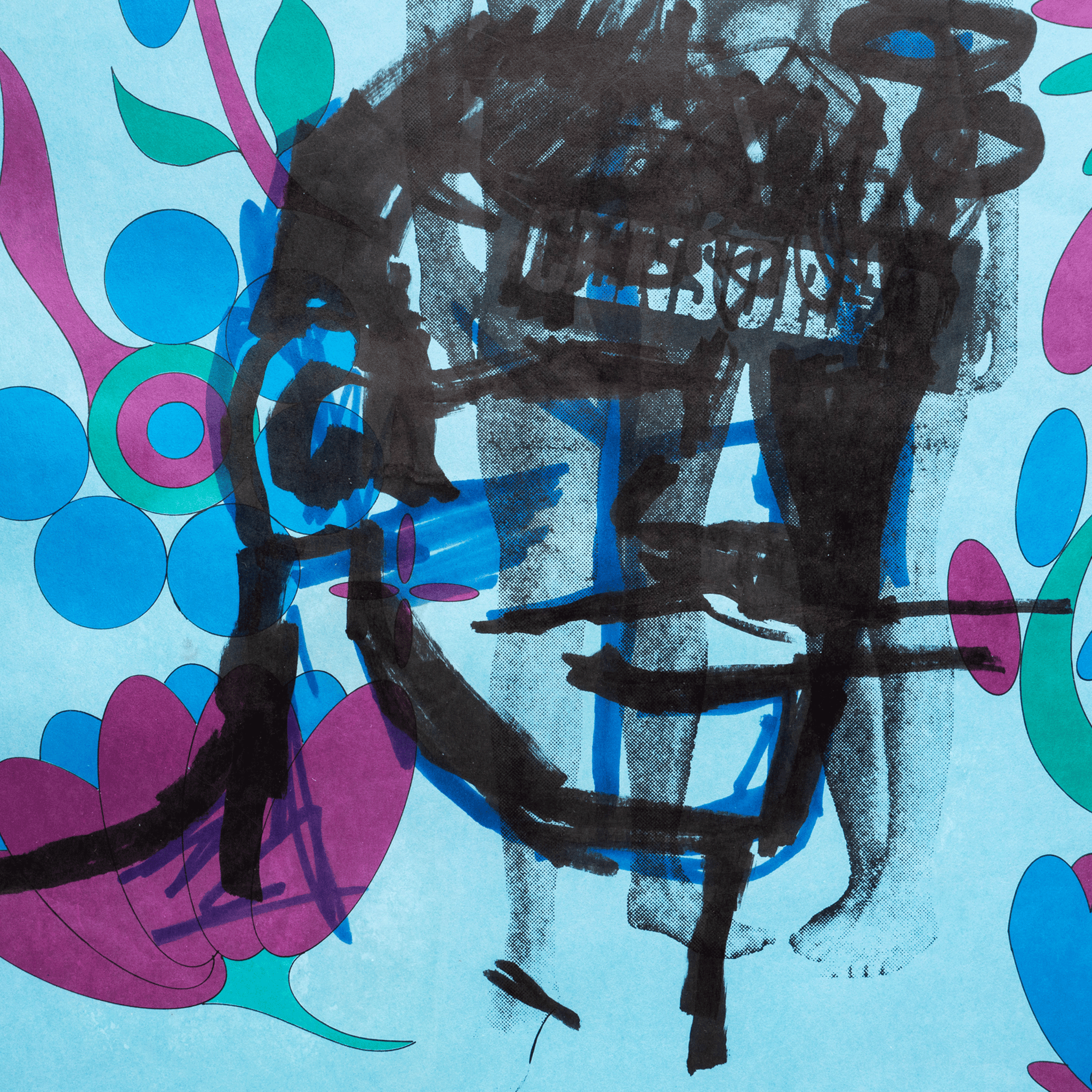 His work features his iconic 'Brute' face, painted on anything from canvas to found objects. What he painted on, was as crucial as what imagery he was painting.