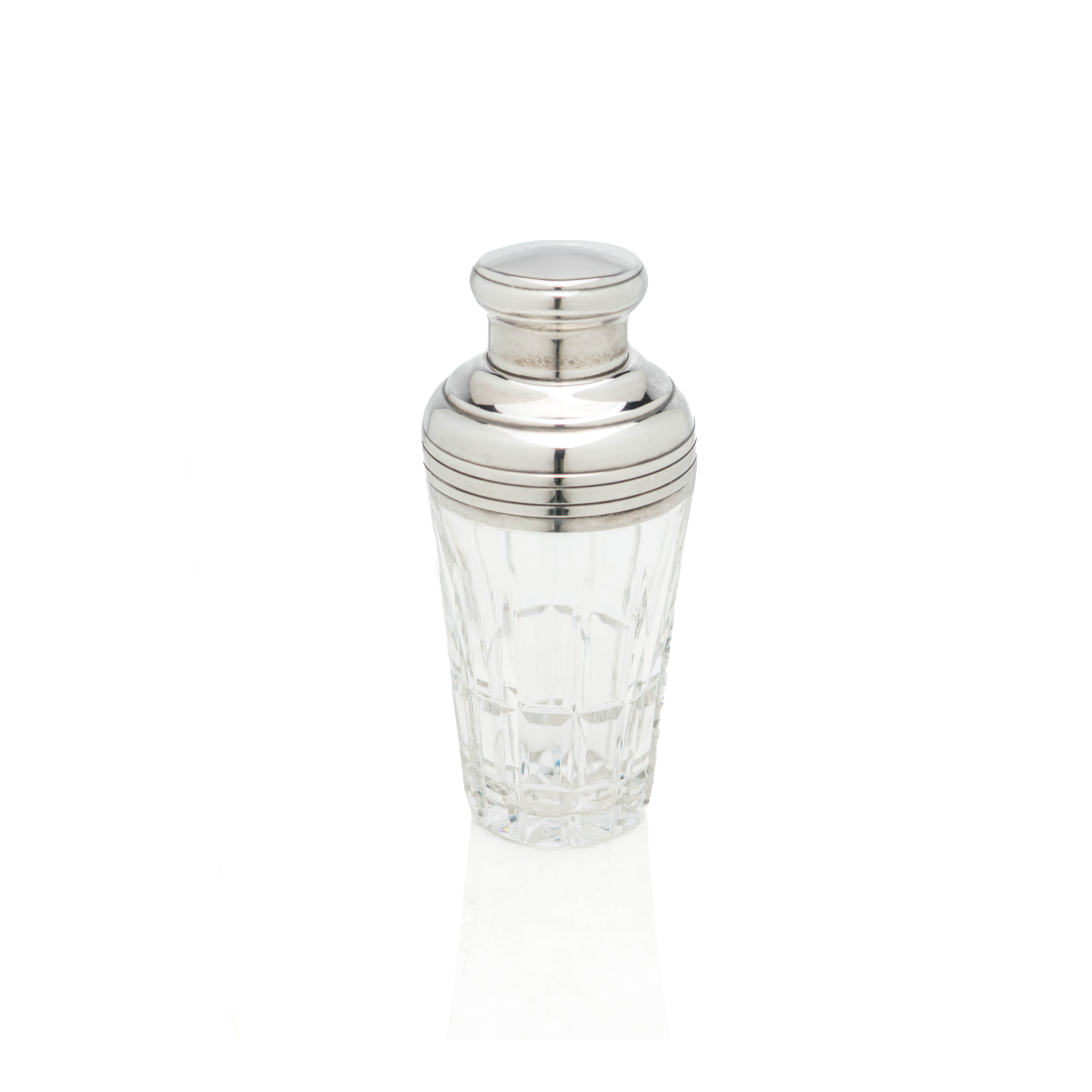 A fine and rare cocktail shaker by Saint Louis, one of France's most heralded crystal makers. A classic cut-crystal body is complemented by a silver-plated brass cap and strainer, both with an elegant banding around the perimeter.