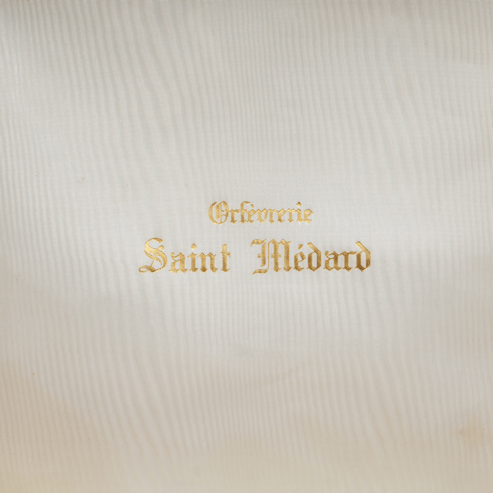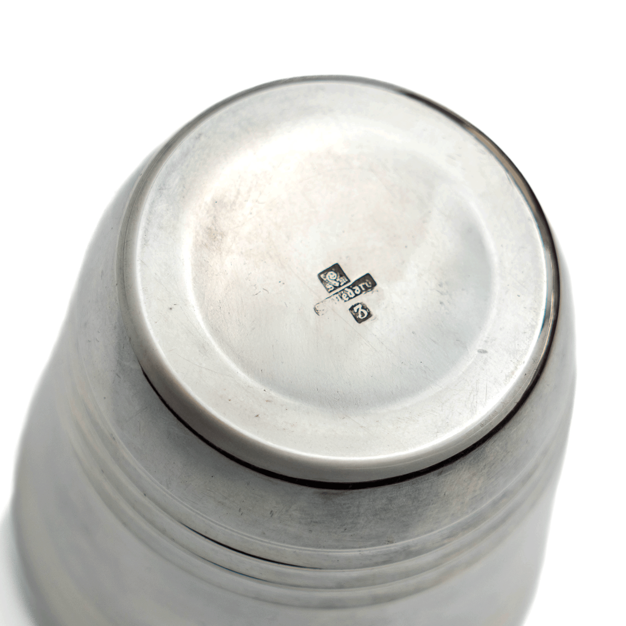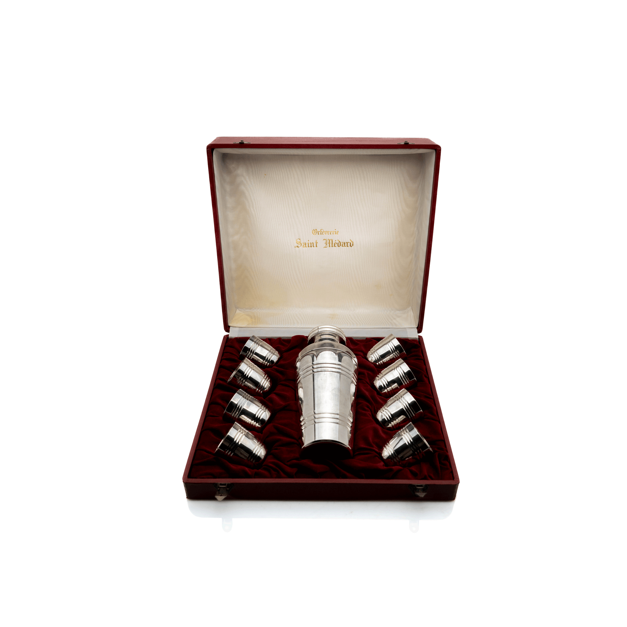 A gorgeous French cocktail shaker & shot glass set, fashioned out of silver-plated brass in a deco-inspired design. This fabulous set is complete with its original presentation box, making this a perfect gift for any person.