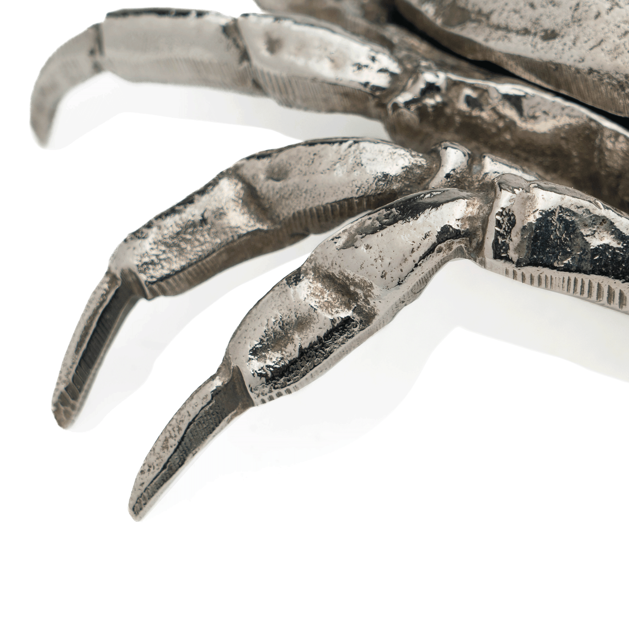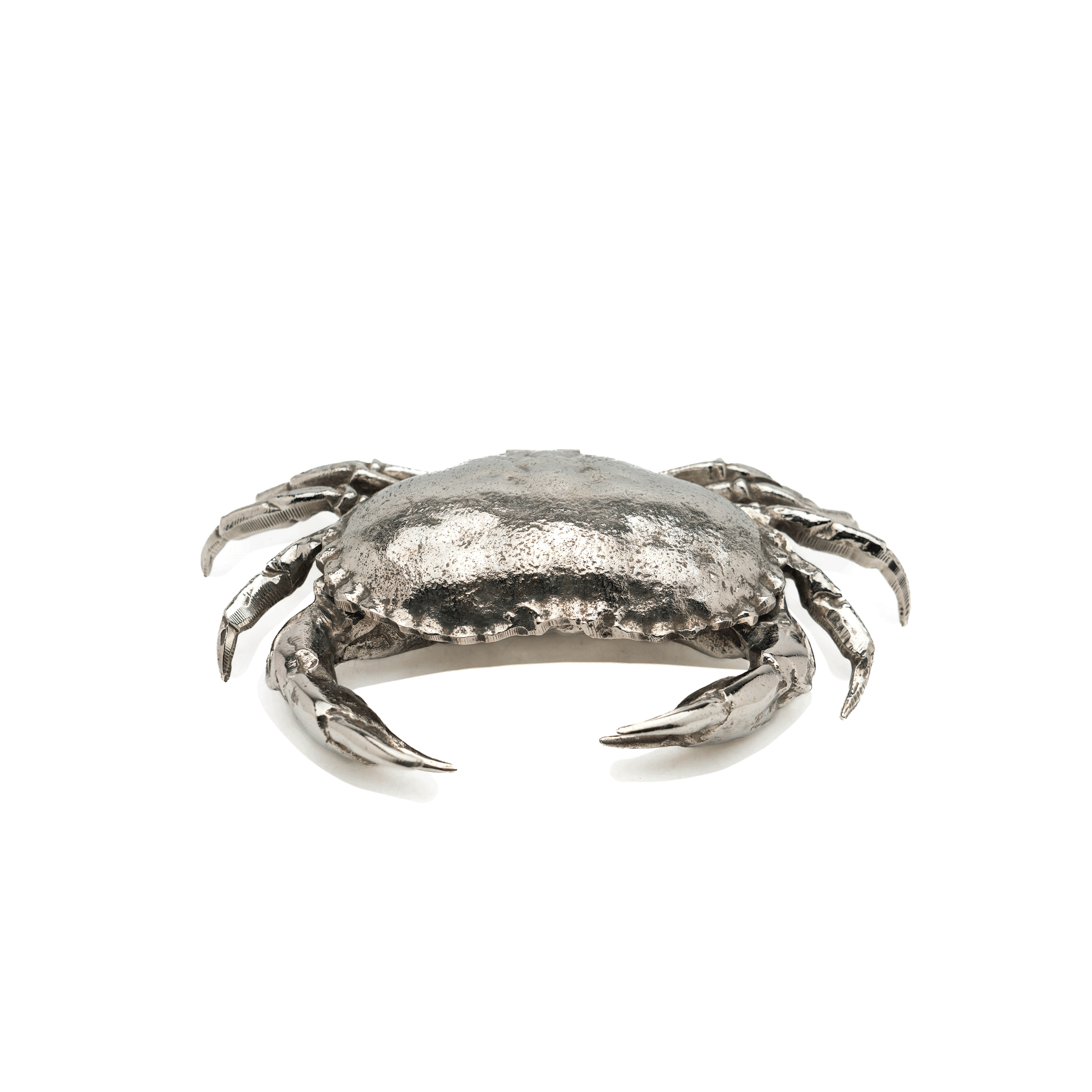 A cool and interesting figural crab box, fashioned out of silvered bronze in life-like detail. One needs only to lift the front of the crab shell to reveal the interior. Let this large and graphic box add a new element to any surface.