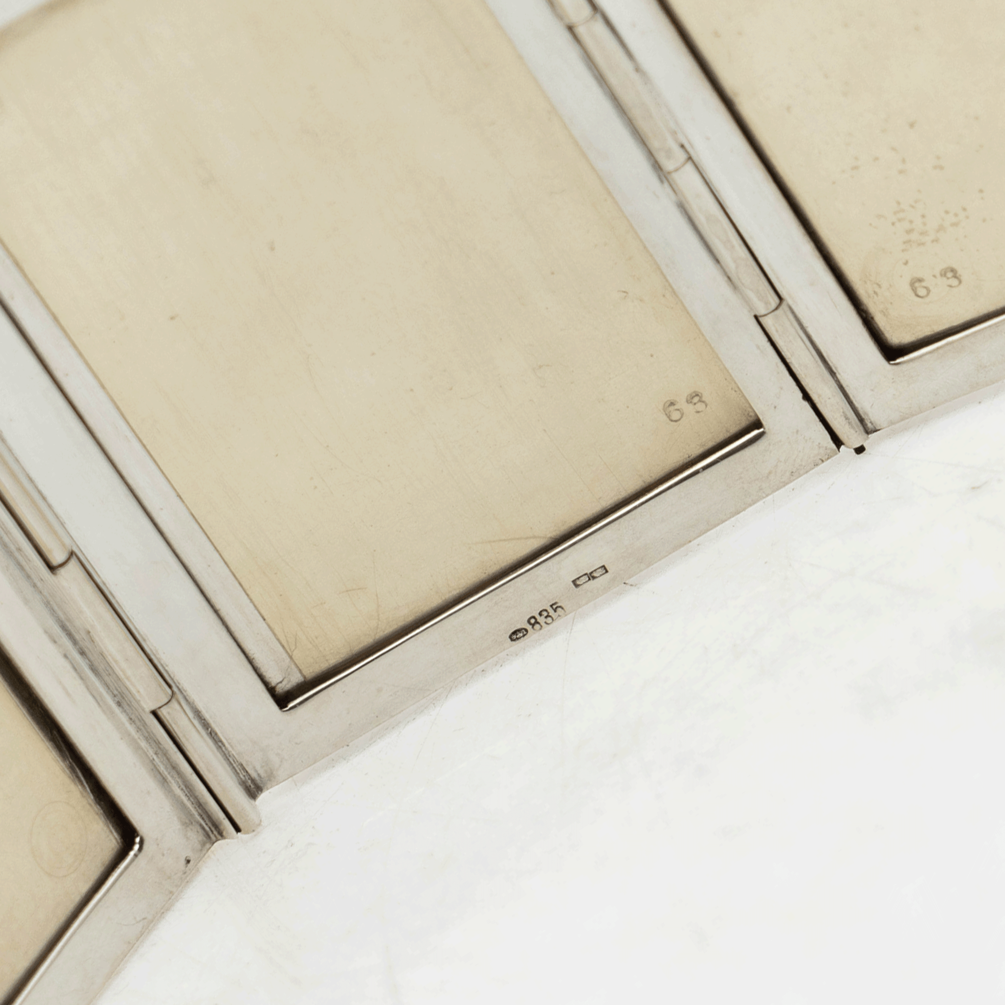 A gorgeous sterling silver folding picture frame set, expertly made to fold compactly and finished off with an engine-turned pattern on the back panels. This fabulous picture frame set is great for any desk or shelf.
