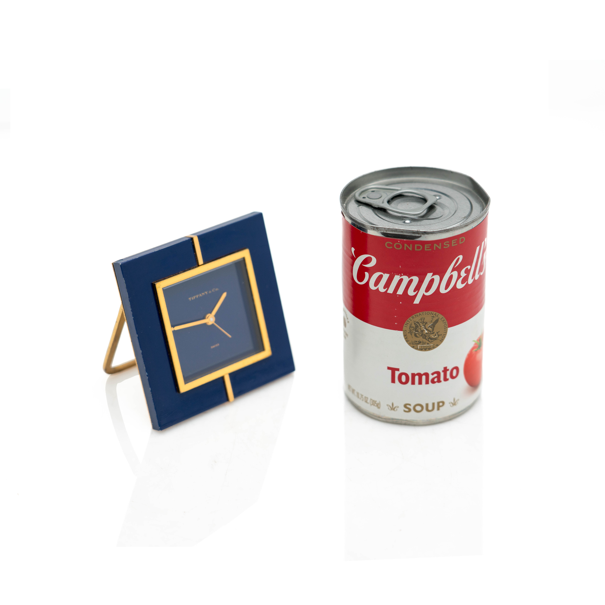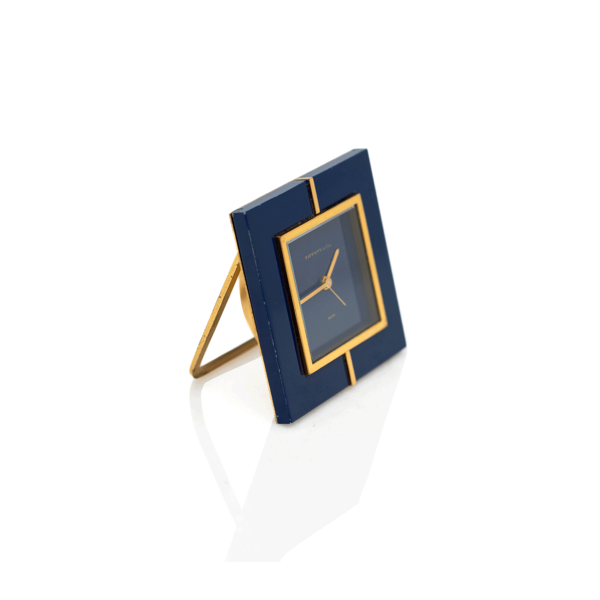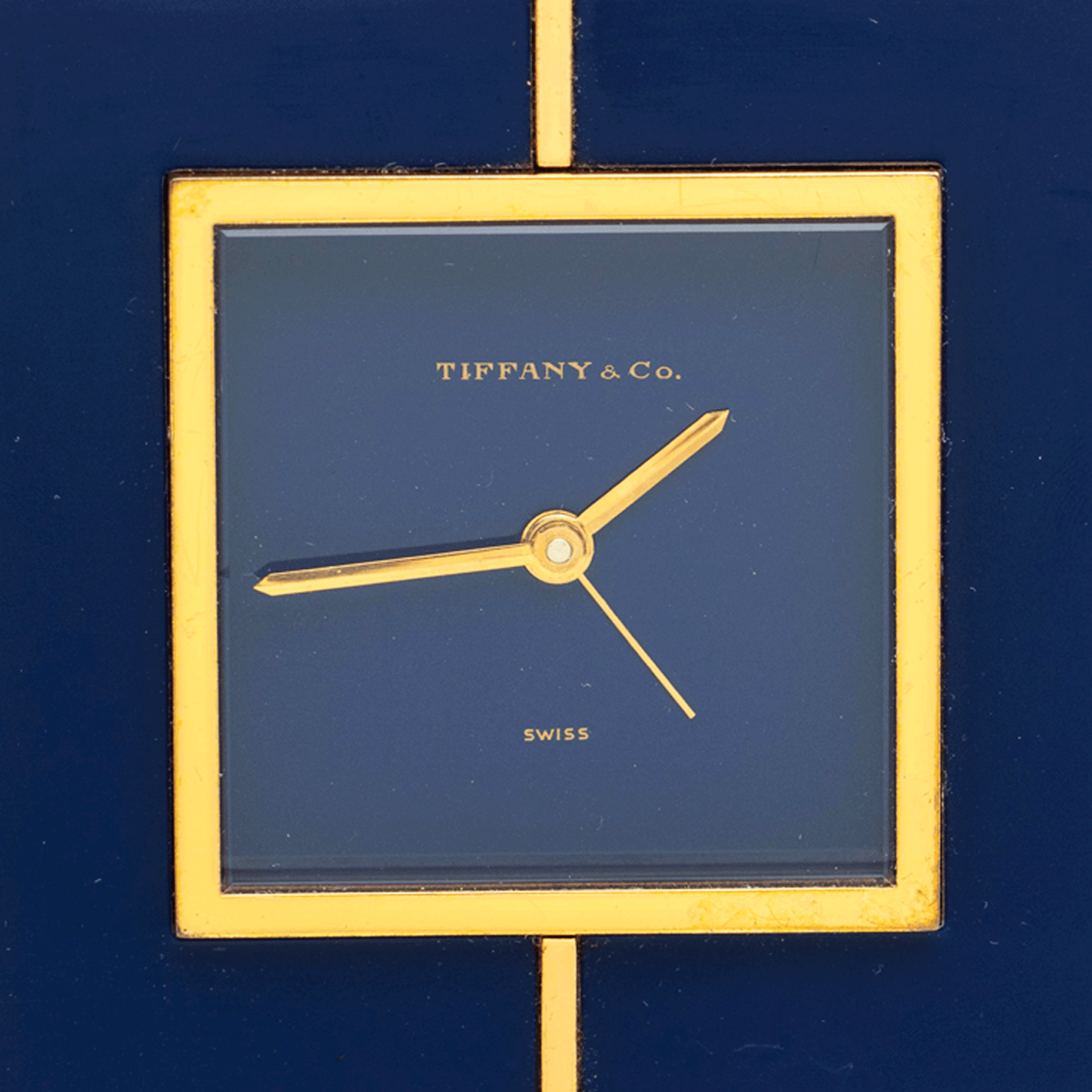 A fine and rare clock by Tiffany & Co., featuring a blue hardstone body with gilt-brass accents. A simple easel back allows for this clock to be easily set on any table. Featuring a mechanical movement along with an alarm function, this lovely clock will be a perfect companion on any bedside table.