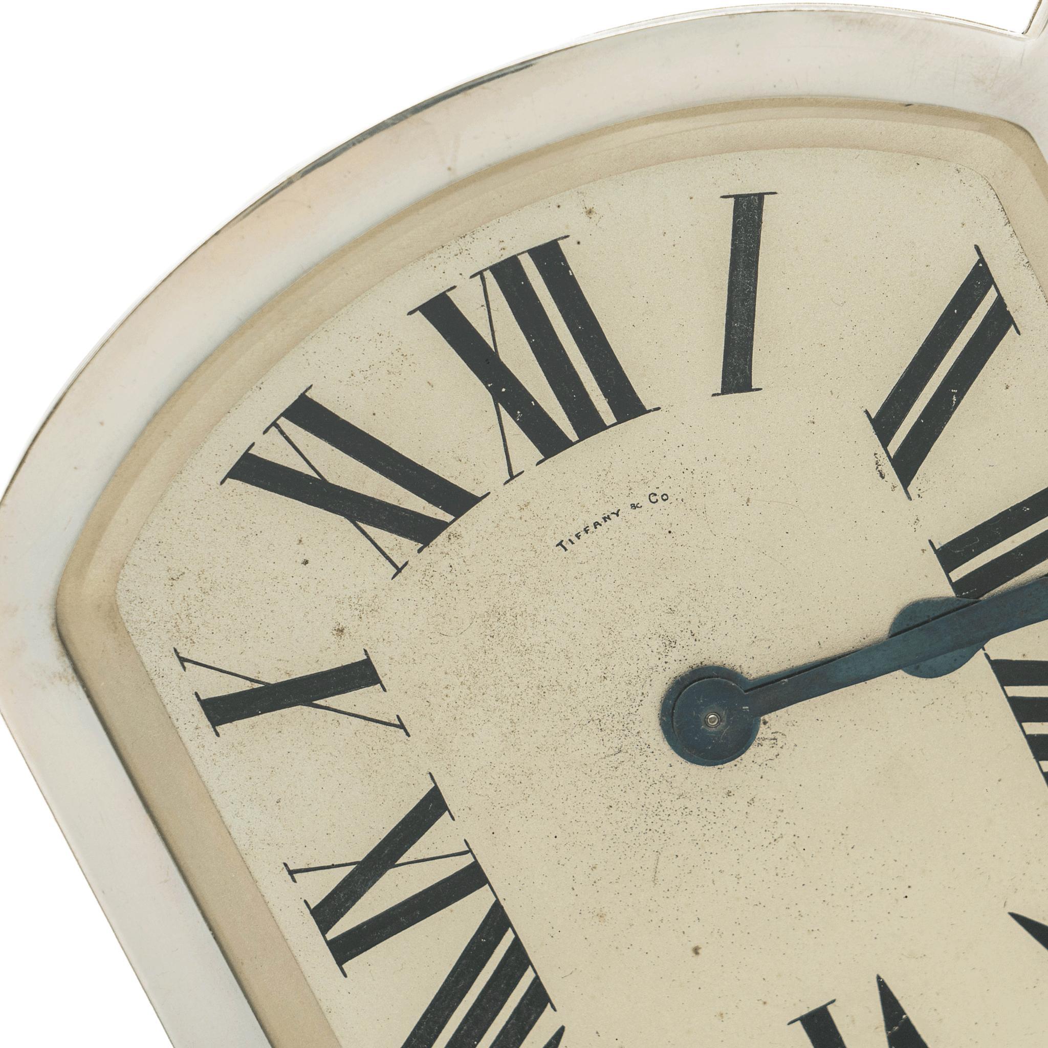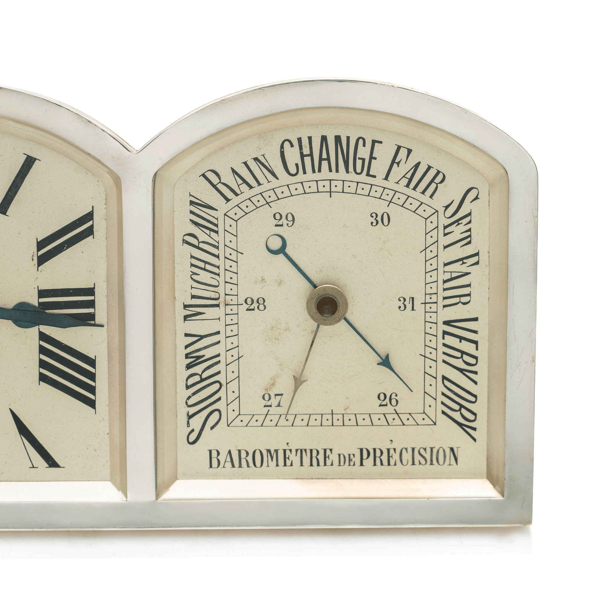 A large and rare Tiffany Paris clock and barometer, joined as a magnificent weather station in a classically modern taste. This stunning 1930s clock features a square body with rounded tops and a foldable easel backing.