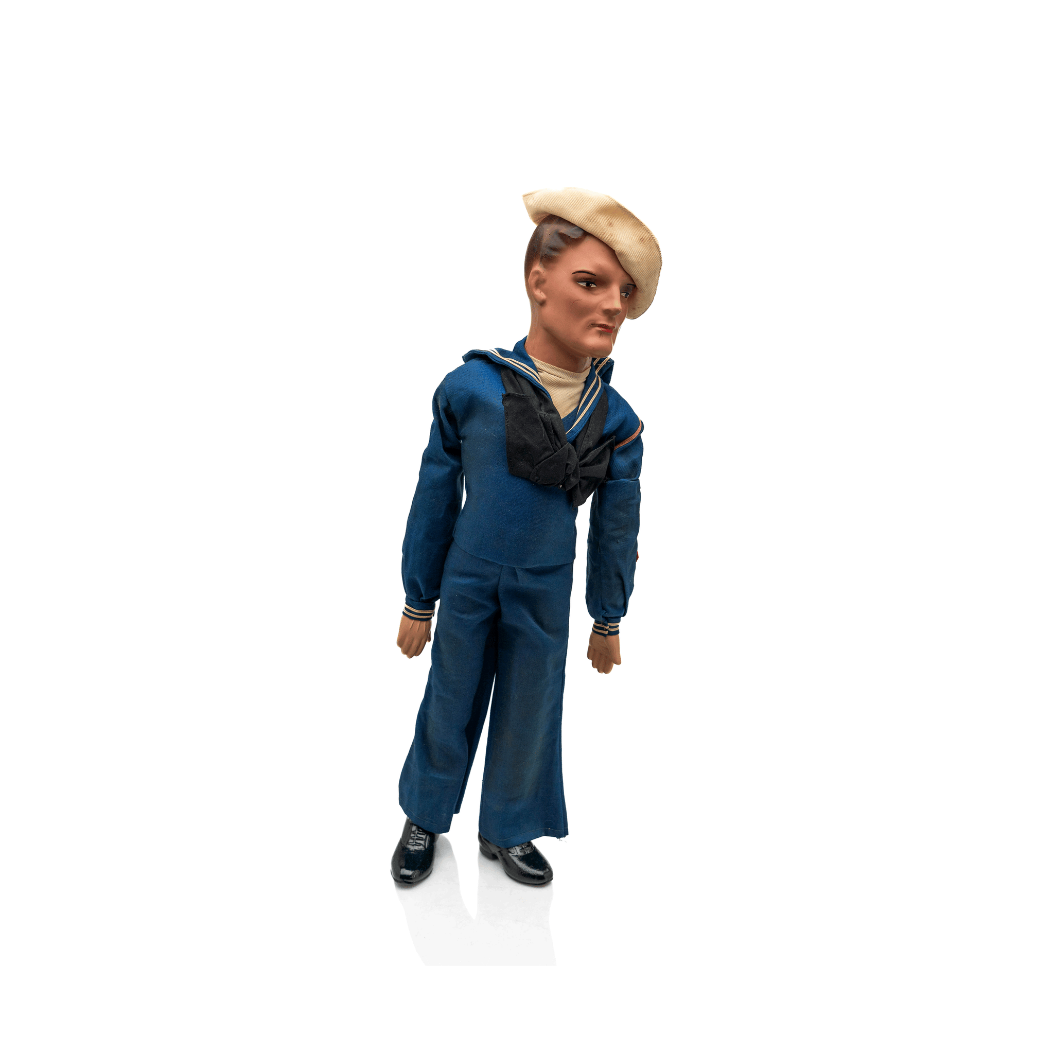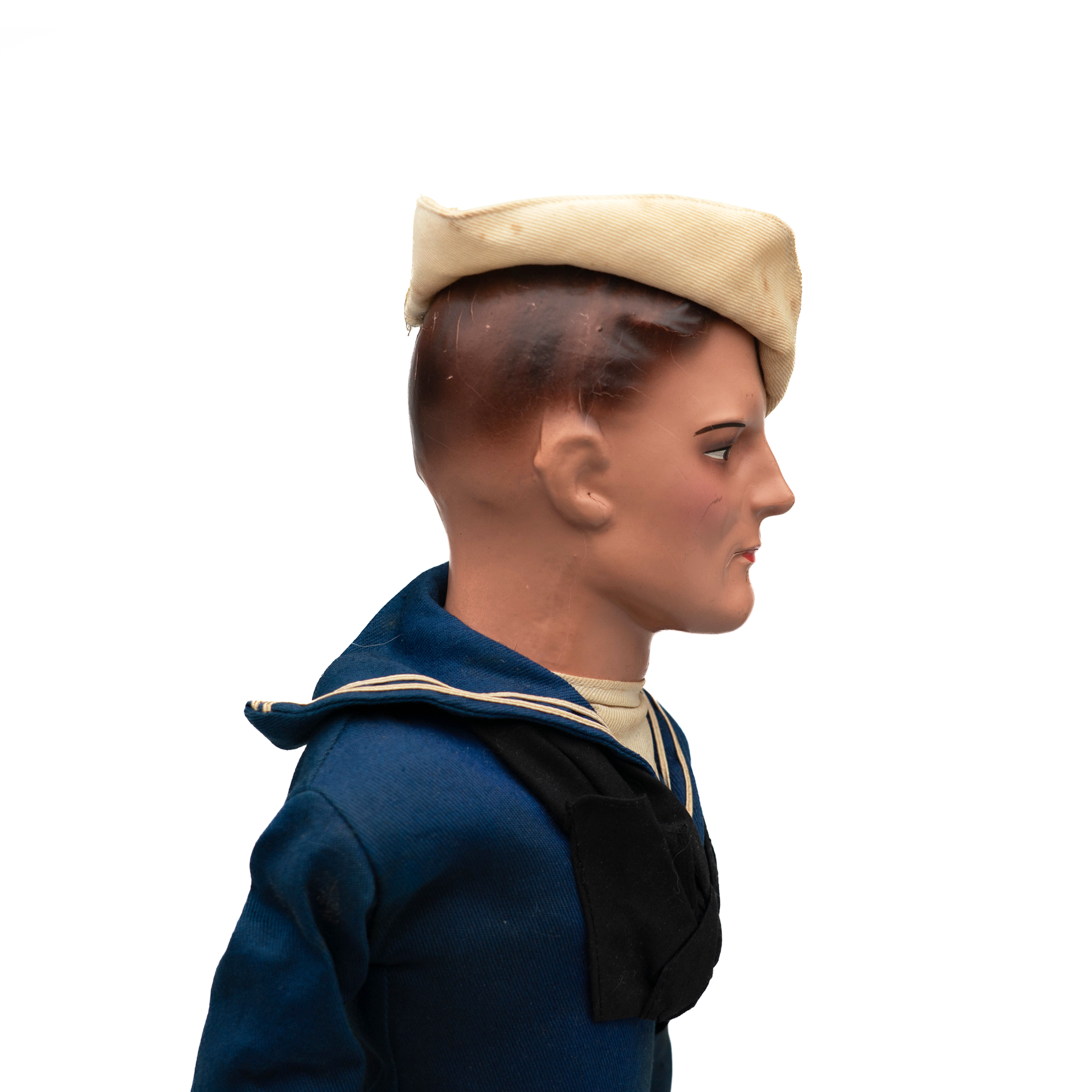 A cool and historic WW2 window display of a US Navy uniform. Made to the exact specifications of a Navy uniform and housed on a composition mannequin with a perfectly stylized face, this wonderful piece of history will be perfect for any collector.