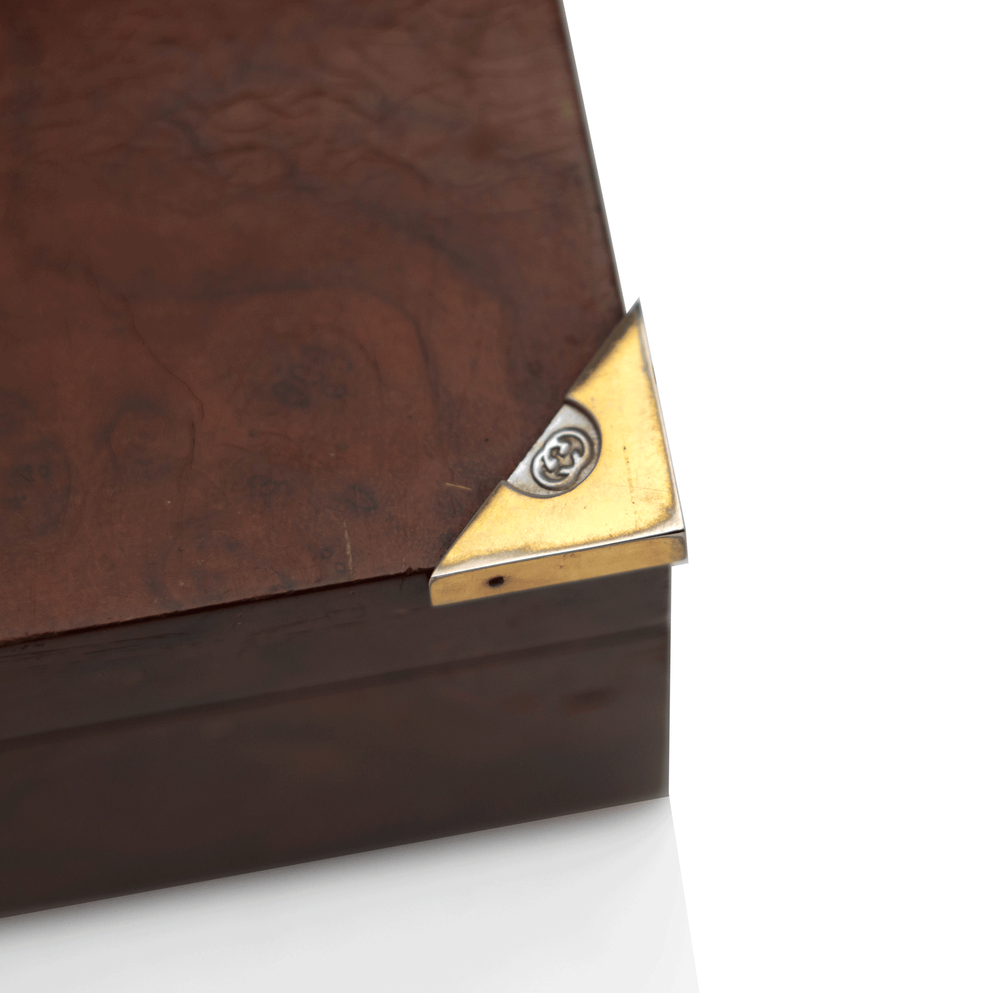 A large and rare Gucci box, fashioned out of burlwood and gilt-brass end caps in the 1970s. Complete with its original cedar lining, this simple yet elegant box by Gucci is a perfect example of their refined design sensibility throughout the mid-century.
