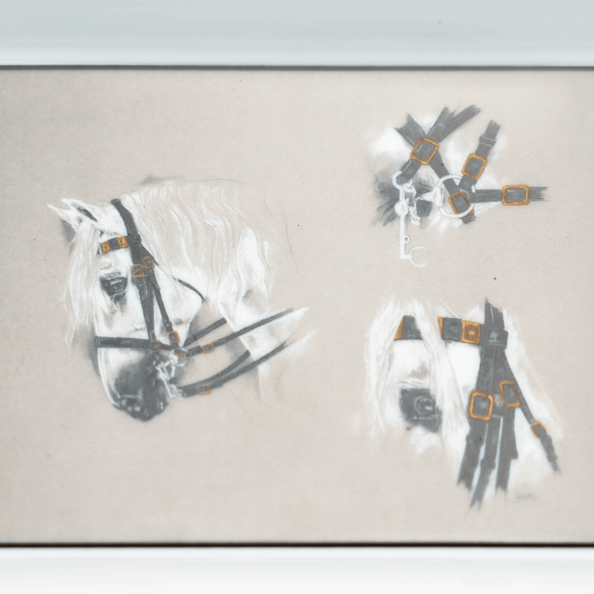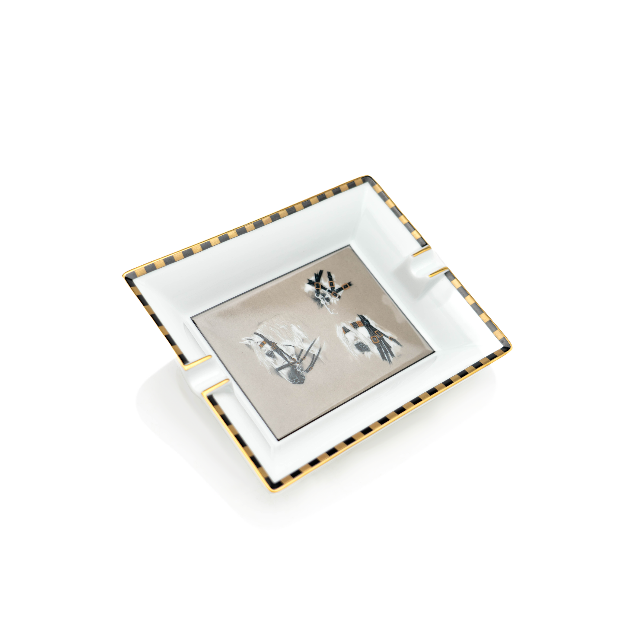 A classic porcelain ashtray by Hermes with a beautifully painted scene of a horse's profile in three distinct views, surrounded by a checkered border reminiscent of a jockey's jersey.