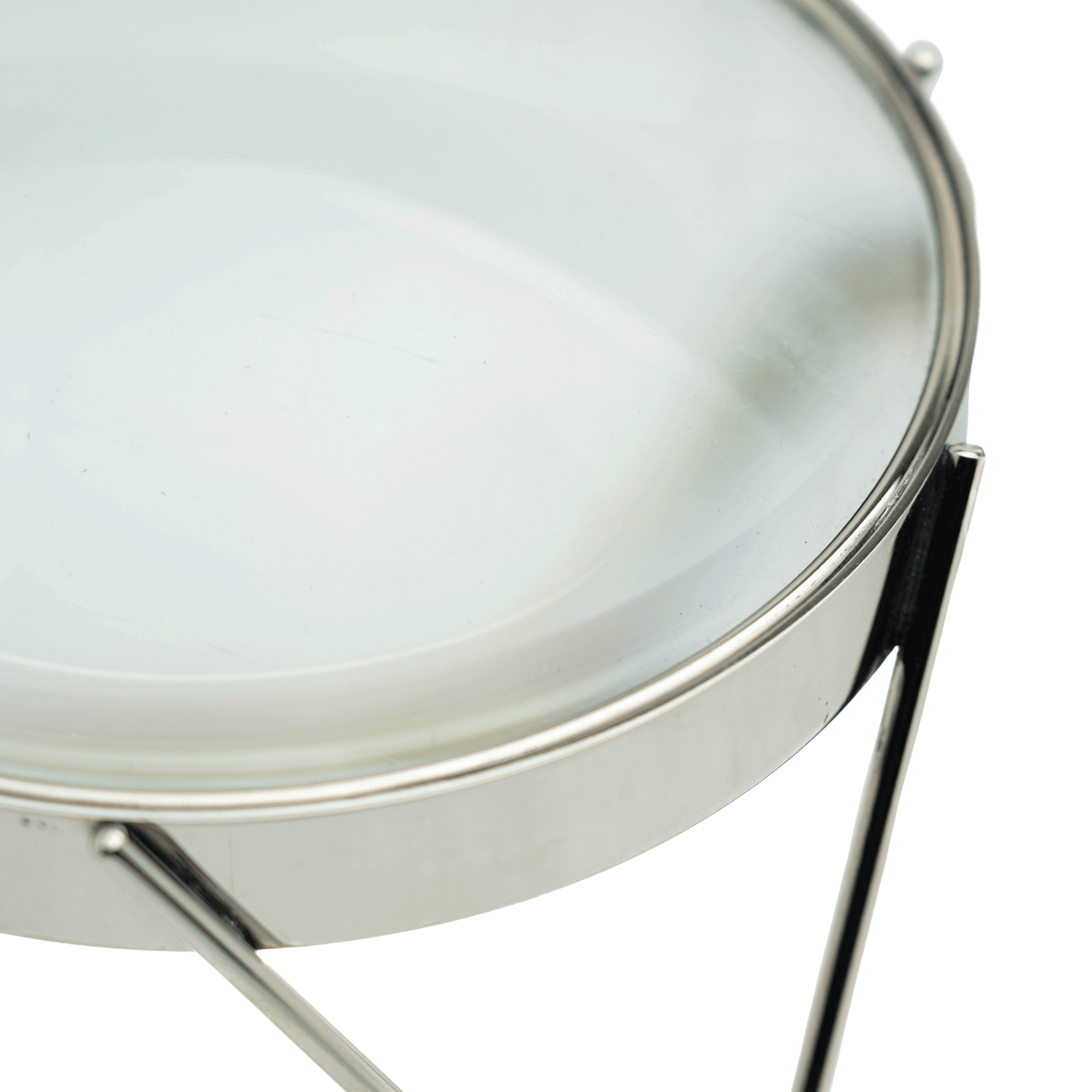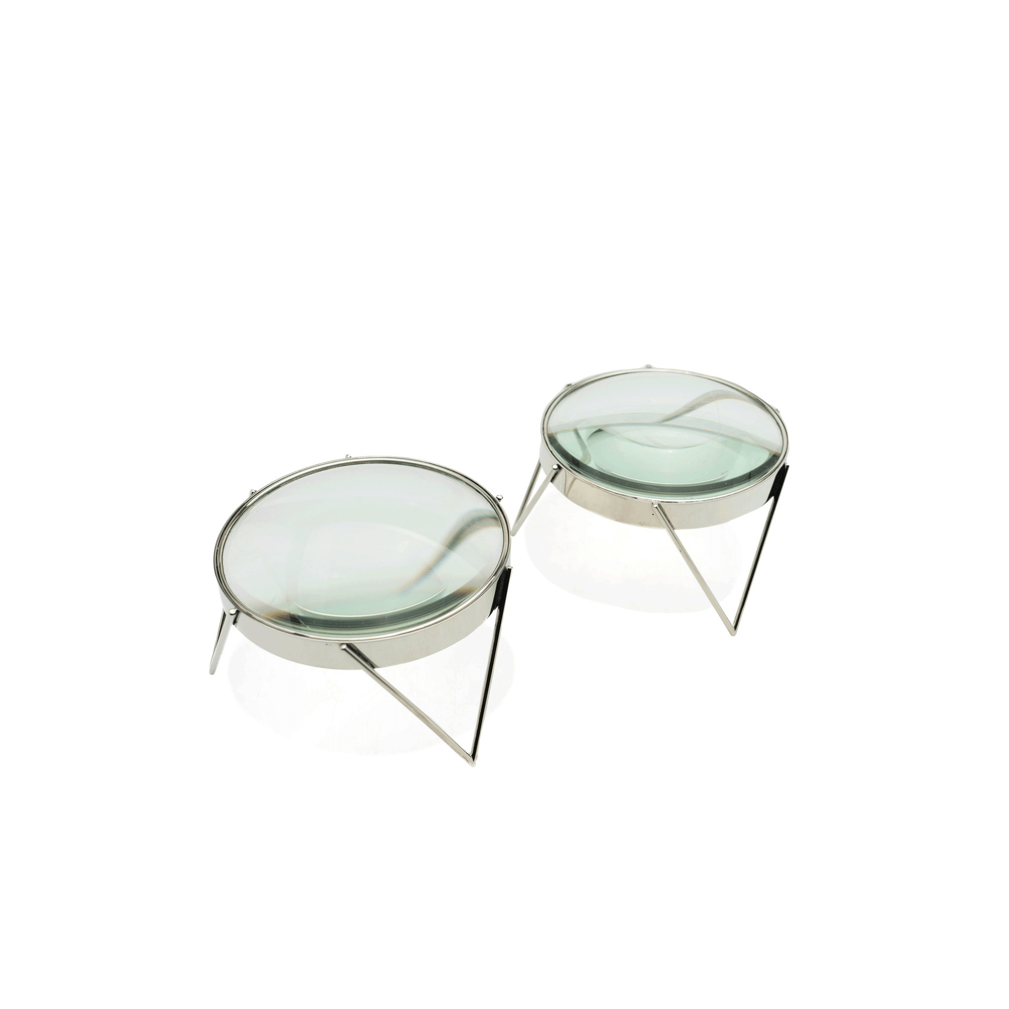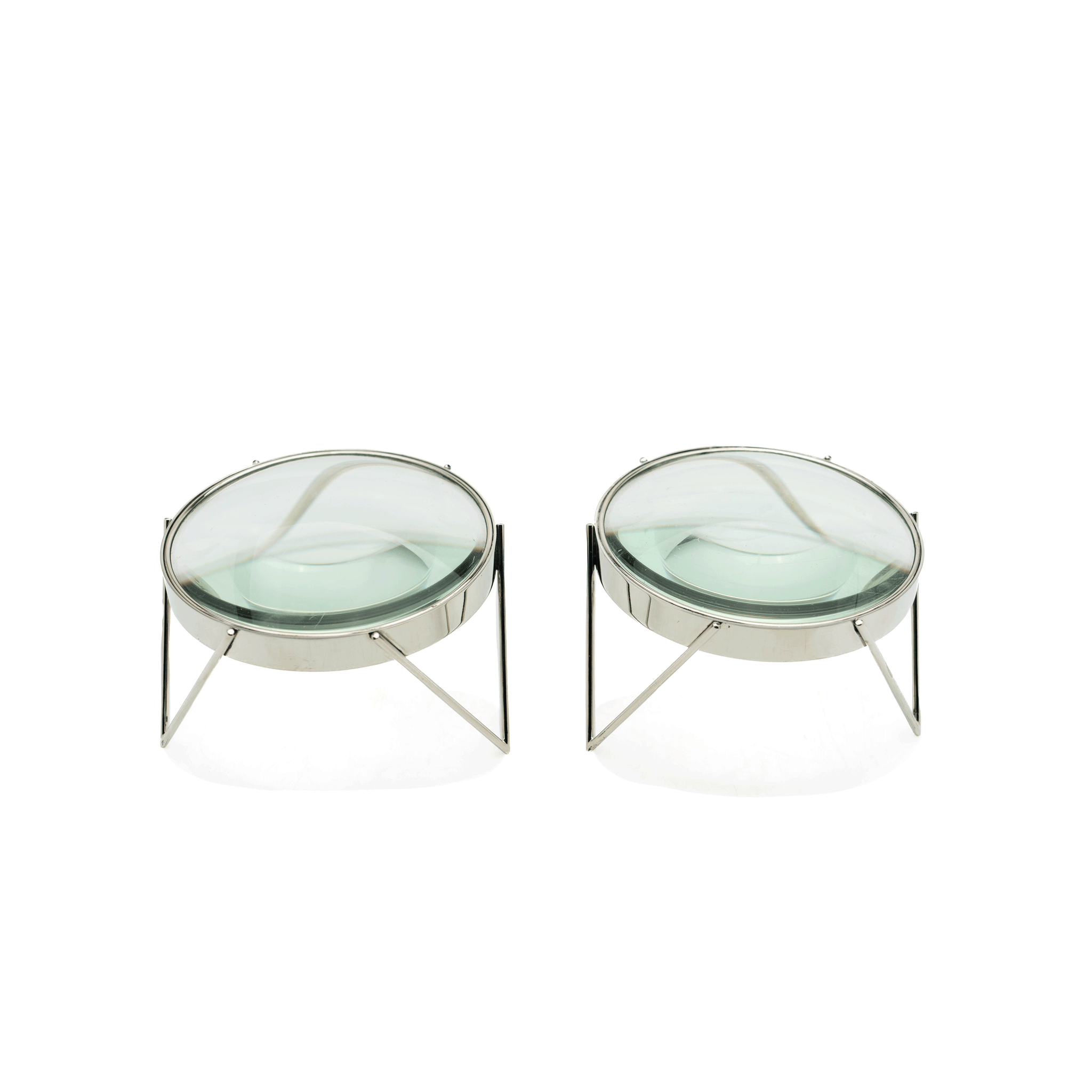 A large and rare set of table top magnifiers, featuring a large lens encased in a nickel body with hairpin legs. Used for a variety of purposes from maps, film and more, these rare and interesting magnifiers make for fantastic and unique pieces of decor.