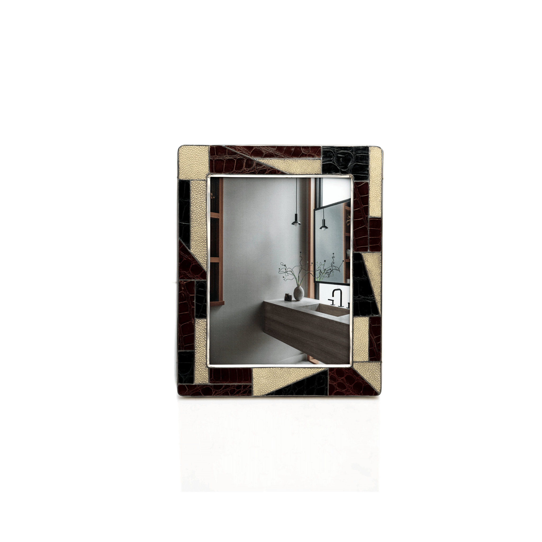 A very fine and rare picture frame, in sterling silver with patchworked sections of shagreen, alligator and crocodile. This rare and extraordinary example of a jeweler-made picture frame will be the perfect statement piece for any room.
