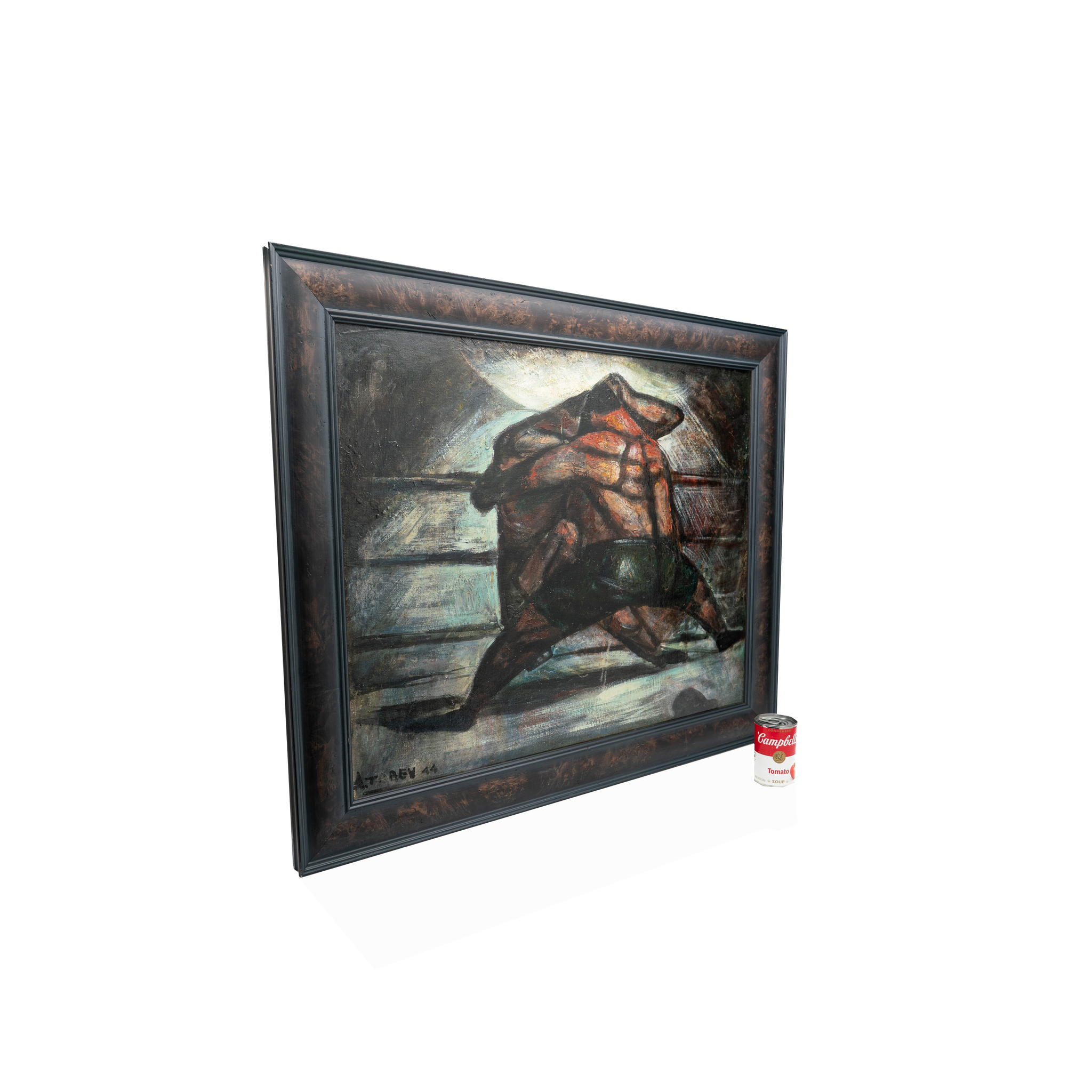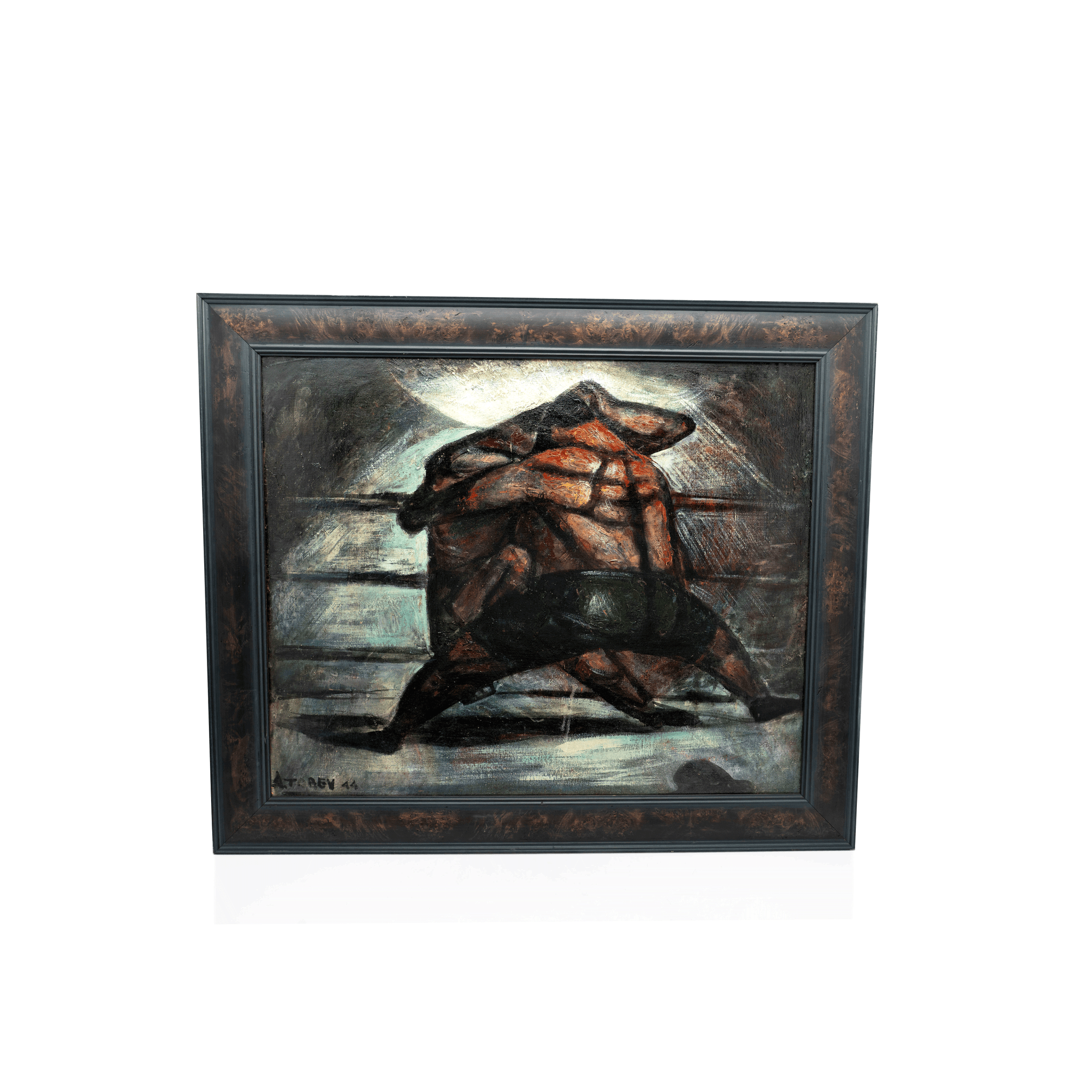 A fine and captivating WPA-era painting of wrestlers, locked together in a match. This vibrant oil on canvas is a perfectly stylized painting, capturing the forms of each body and the environment, but most importantly, the feeling of this rich scene.