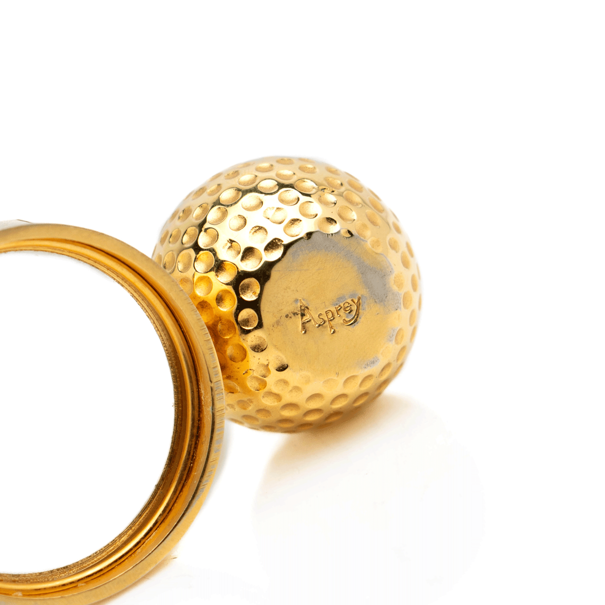 A fine and elegant gilt-brass table magnifier by Asprey. A simple, rounded magnifier is complemented by a figural golf-ball handle -- a perfect accessory for any golfer.