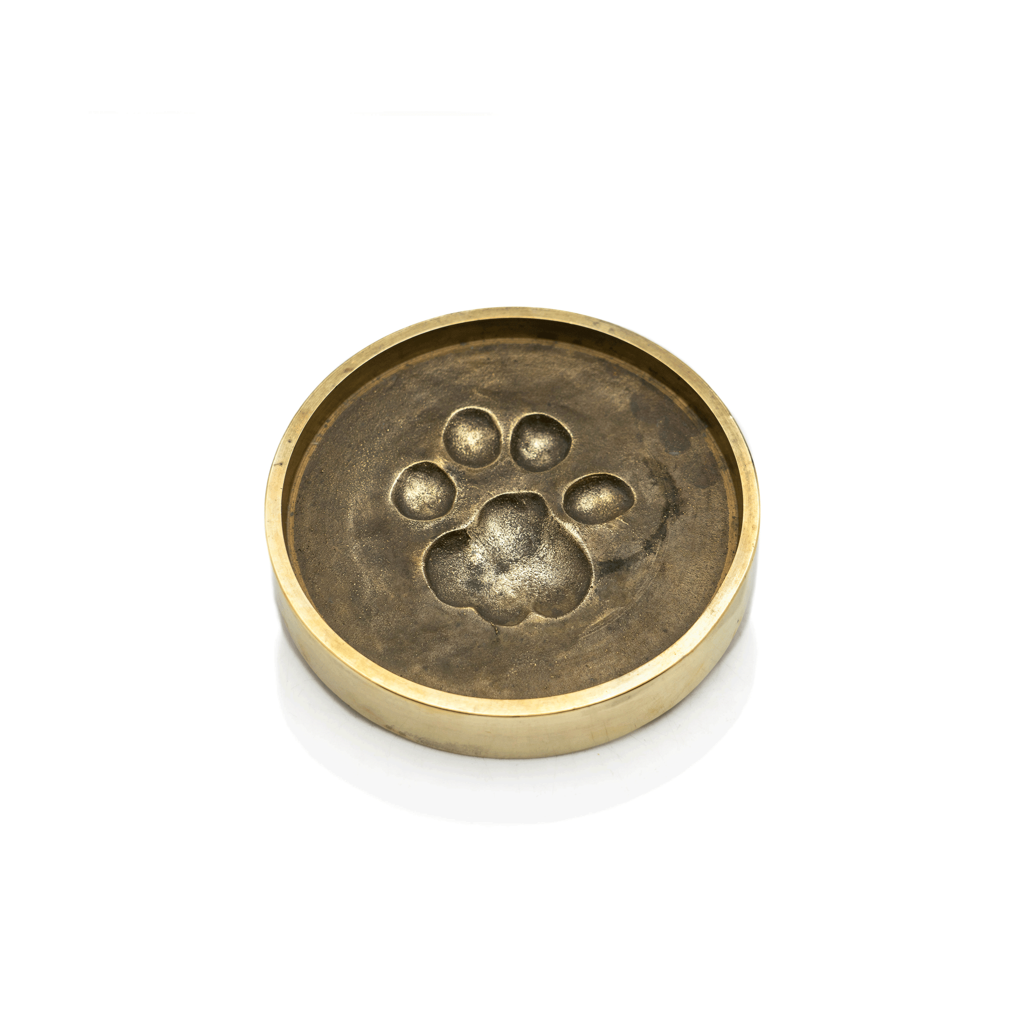 A fine and captivating bronze vide poche in the form of a dog's paw imprint. A thick, polished bronze border is met with a textured interior, giving a perfect contrast for the lovely vide-poche.