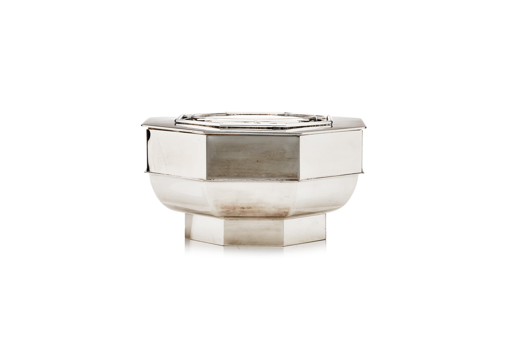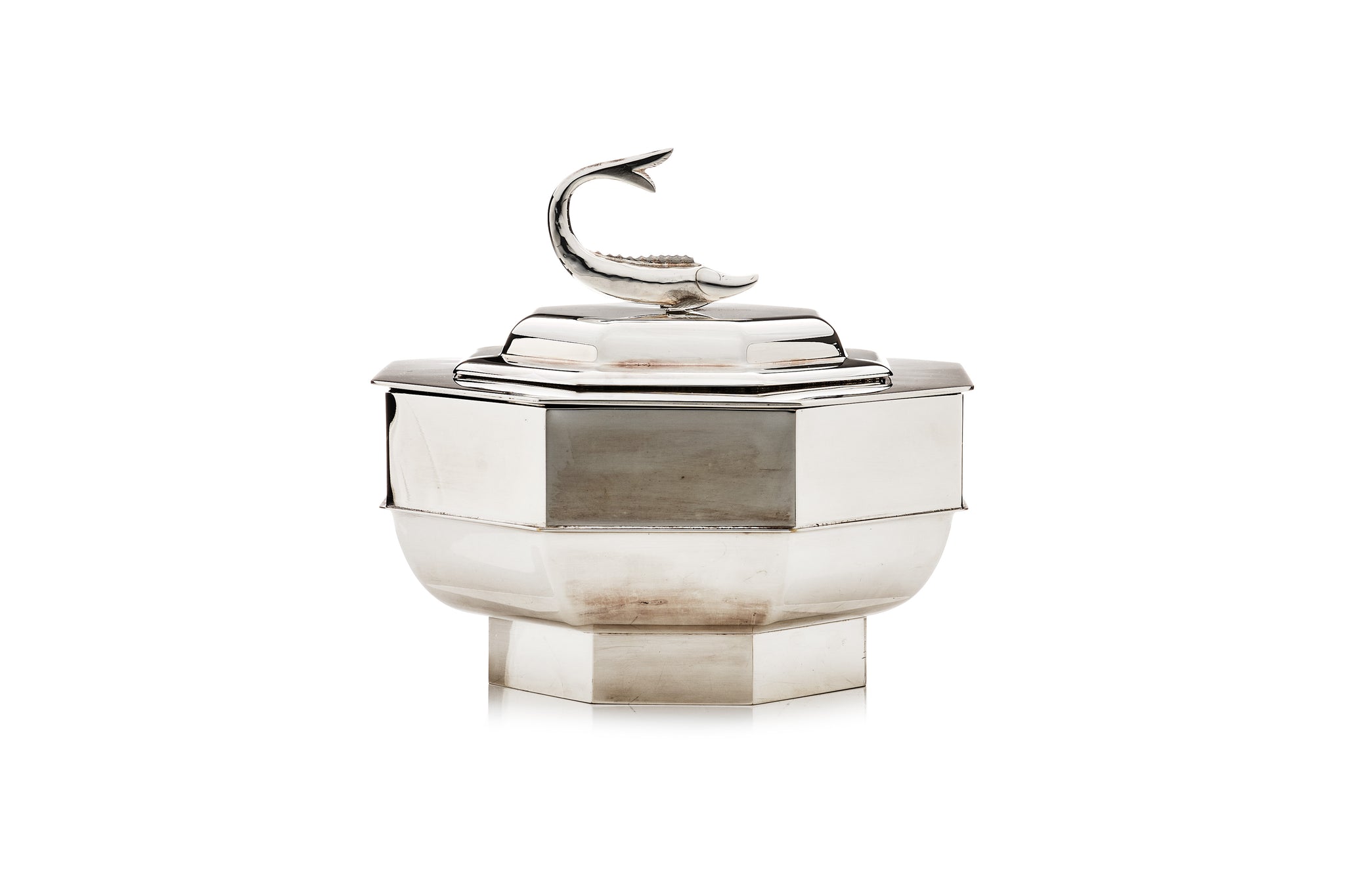 A fine and decadent French caviar service in a faceted form with a figural fish handle. This refined and chic piece will surely be a standout at your next event or party.