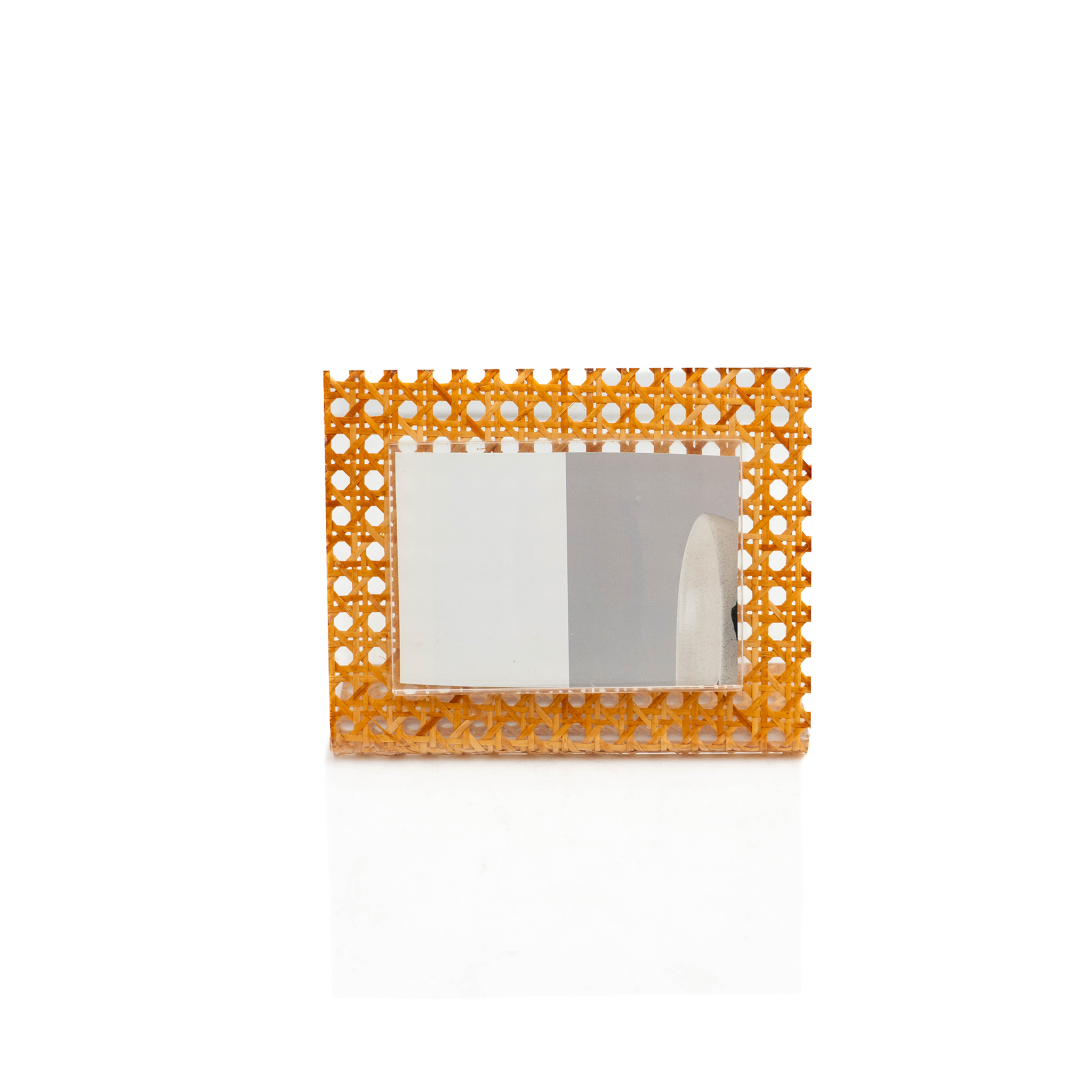 A fine and chic Christian Dior picture frame in their lucite-encased wicker. A simple bent bottom creates the base, allowing for the materials and minimal form to shine through. Let this dynamic frame add a new texture to any table.