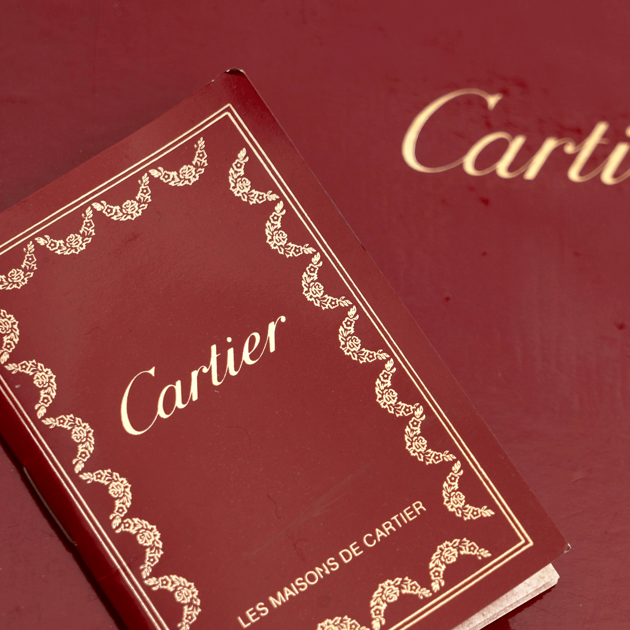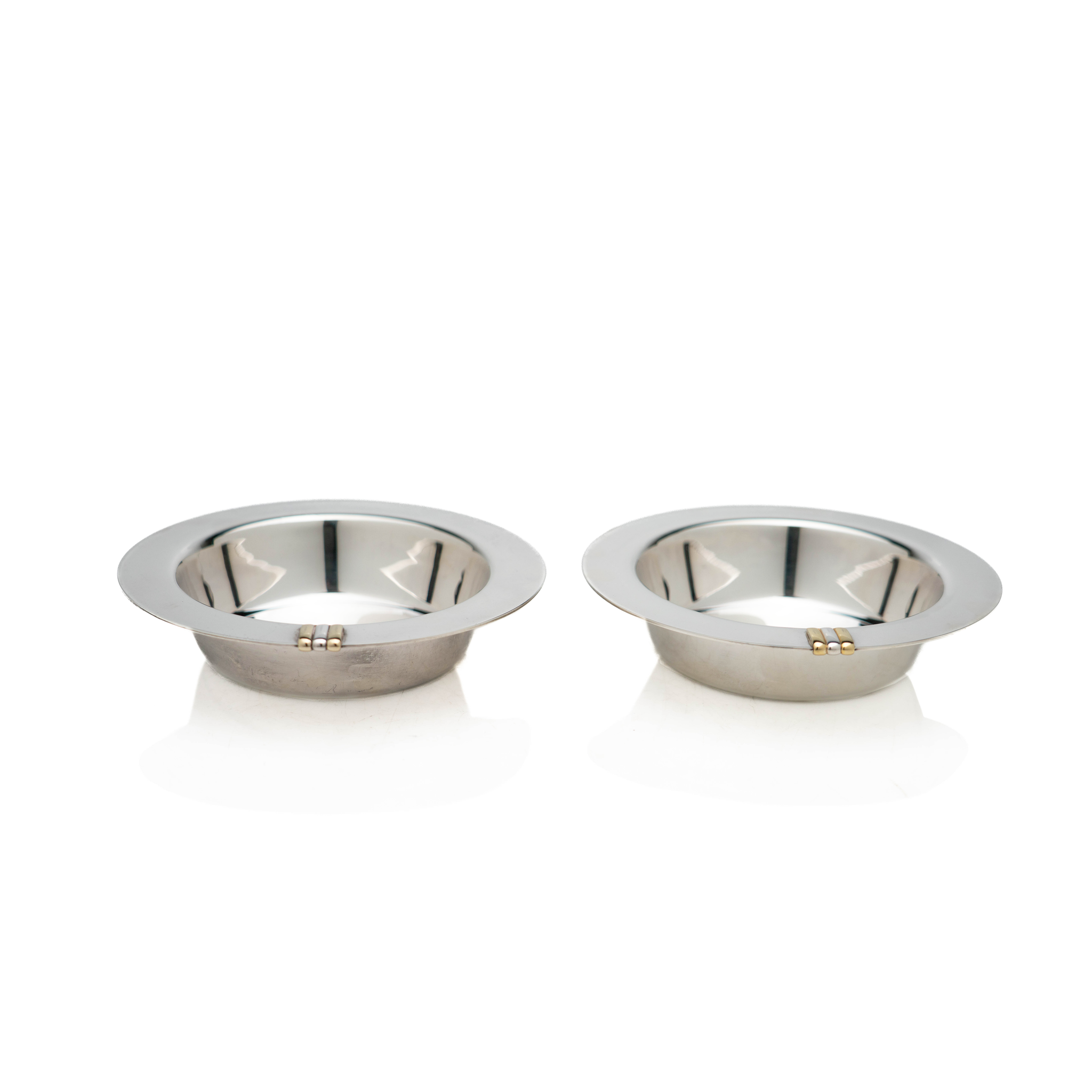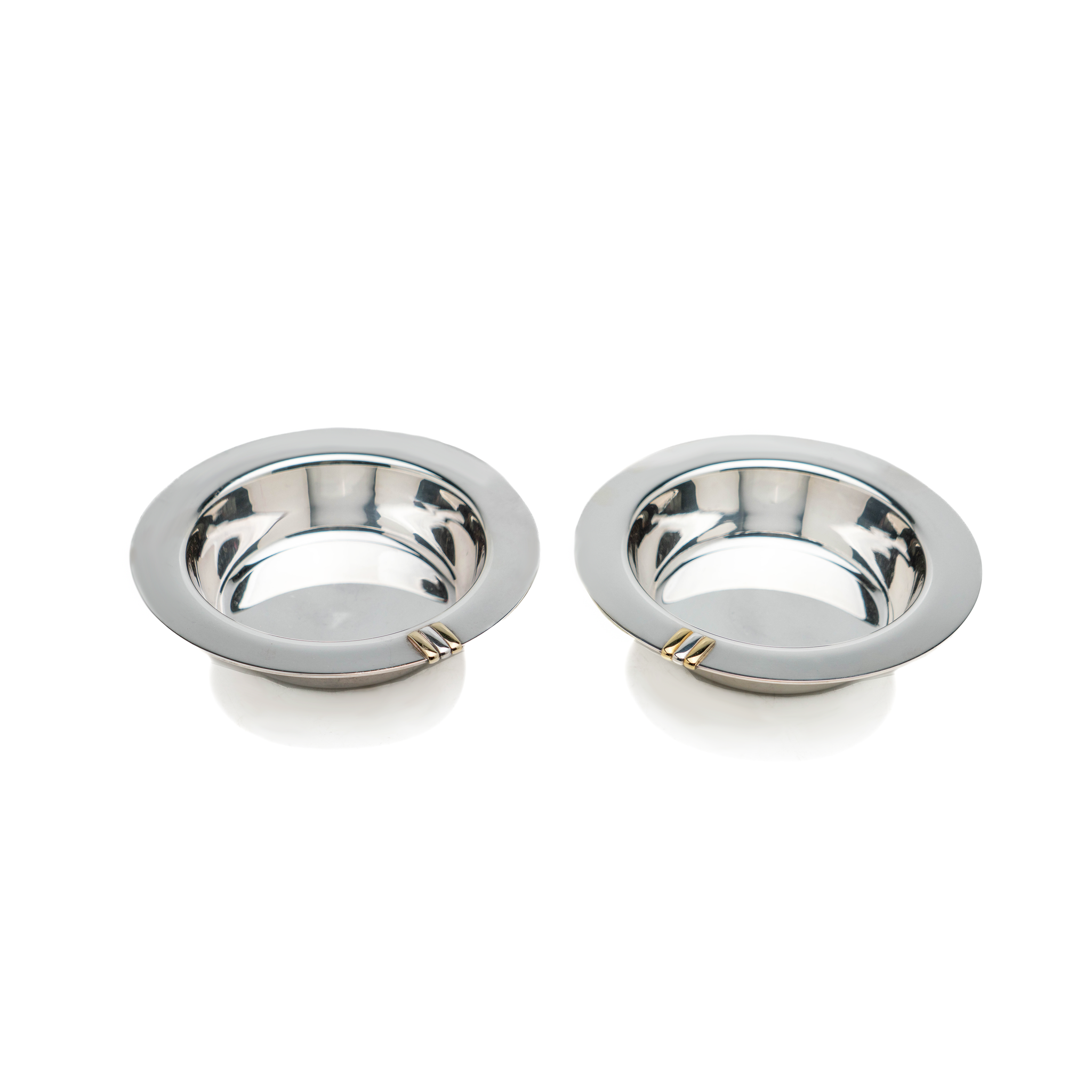 A fine and luxurious pair of 'trinity dishes' by Cartier. Featuring a heavy-gauge silver-plated brass body with a gold-plated trinity emblem at the rim. These simple yet dynamic dishes will be a perfect accent for any room in the home.