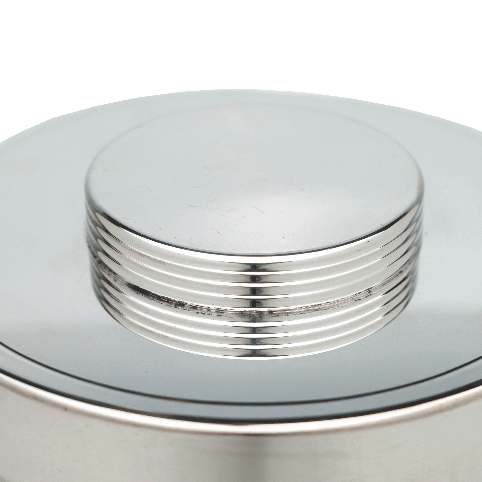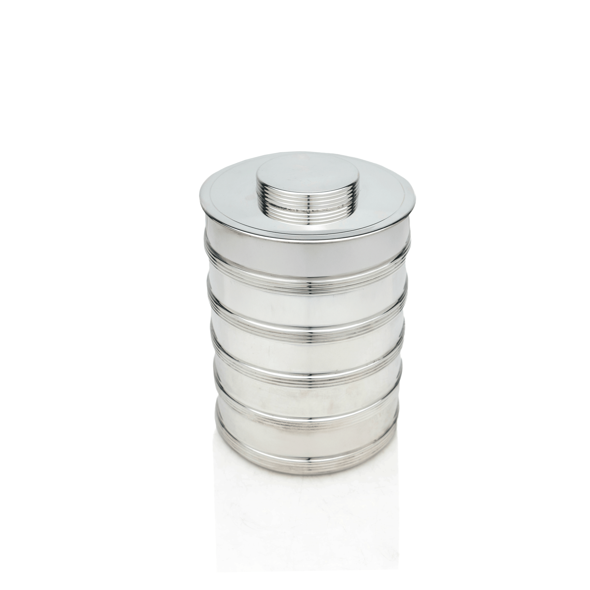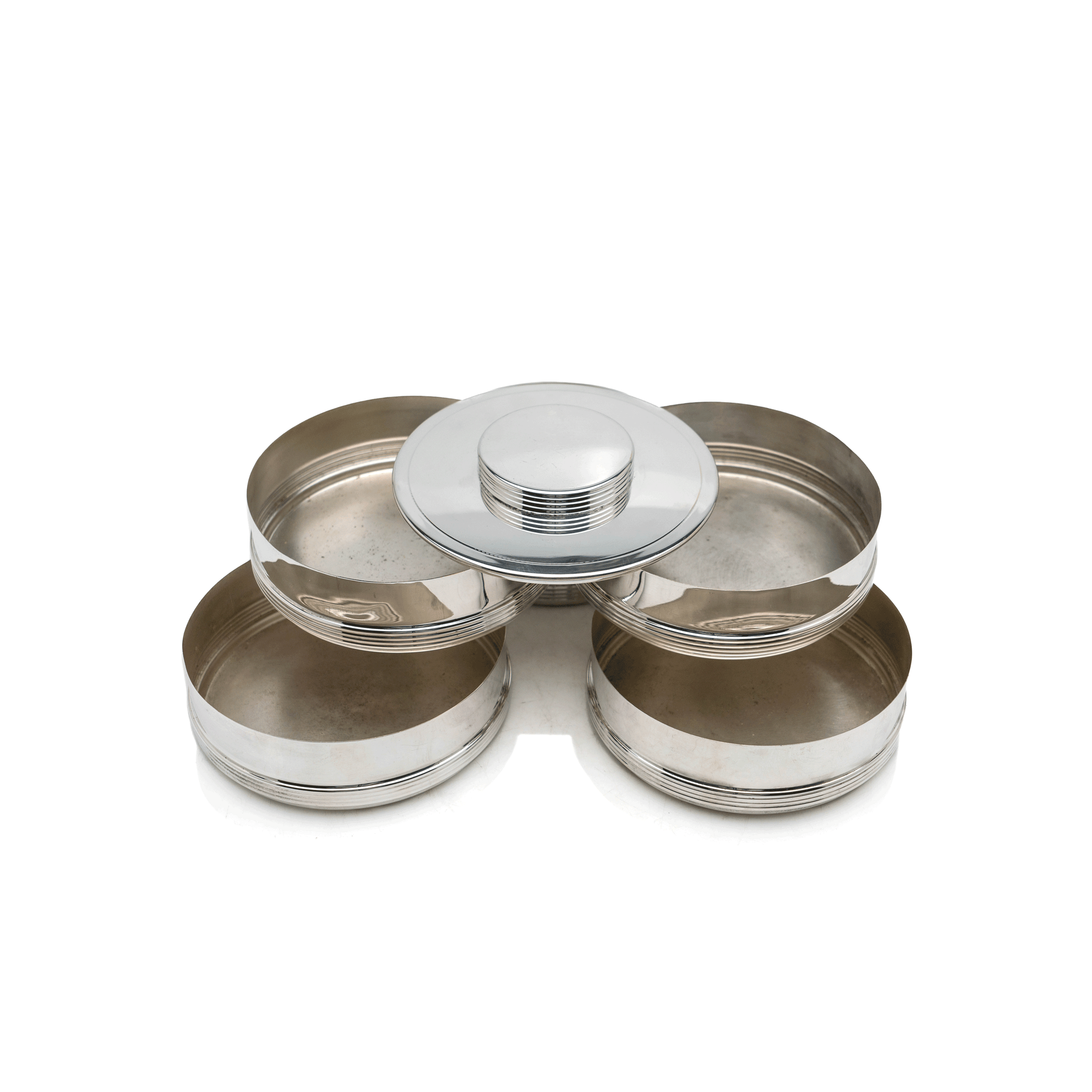A fine and rare Christian Dior stacking box set. Comprised of five stacking dishes that can be used separately or stacked together, depending on what you need. Finished with a deco-inspired banding around each container, this dynamic set will be perfect for a myriad of rooms.