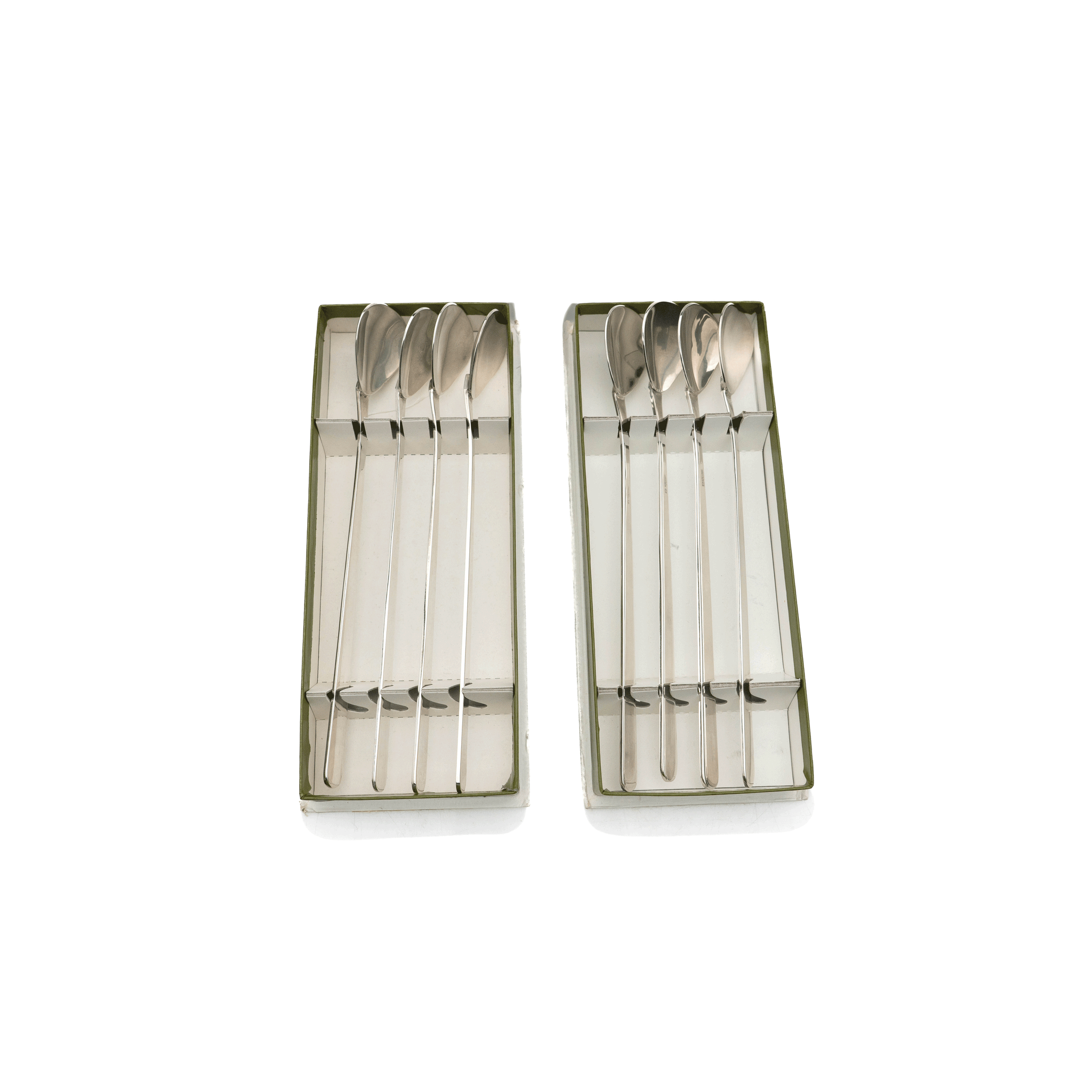 A fine set of eight cocktail spoons by Christofle, each housed in its original box. Crafted out of silver-plated brass, these extra-long spoons bear a modernist finish, a perfect set for any chic cocktail party.