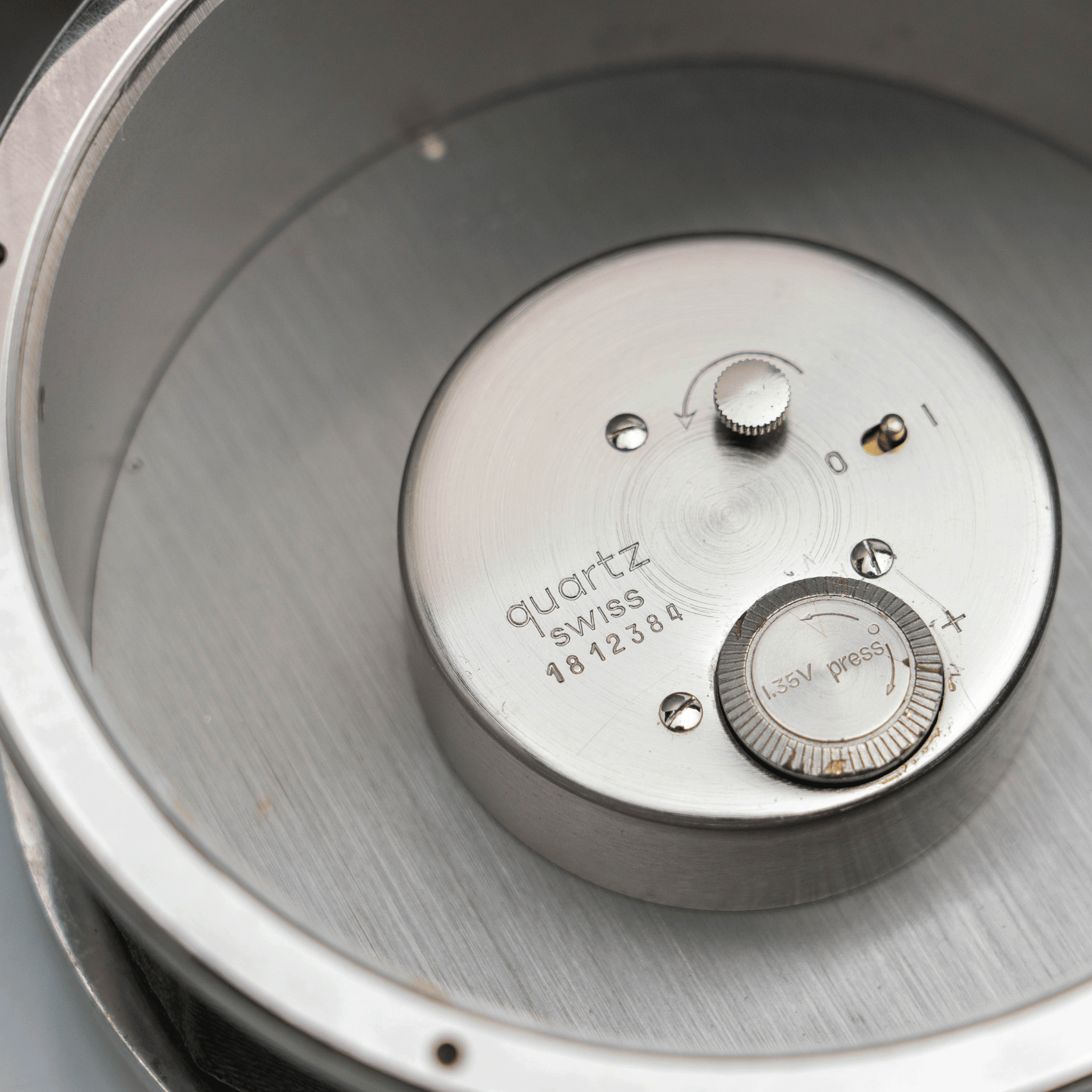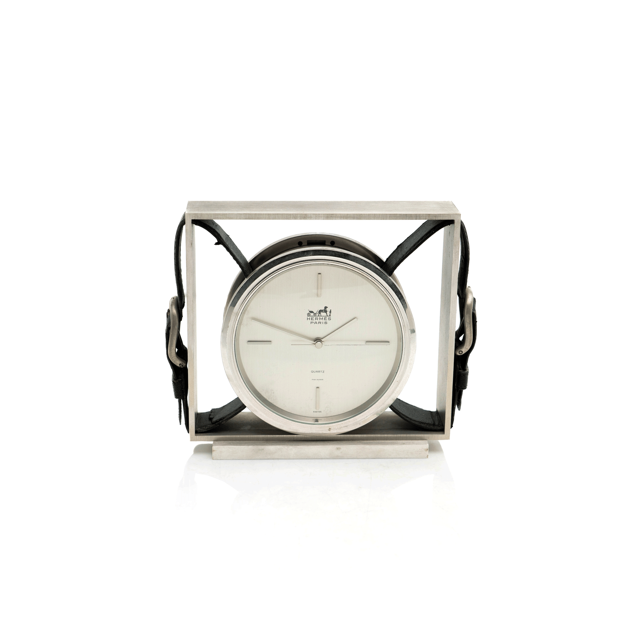 A fine and rare Hermes table clock, in brushed steel and leather. A rounded clock face is suspended in leather by a steel frame, with adjustable straps on either side. This stunning clock features a quartz movement and an alarm function -- perfect for any room in the home.