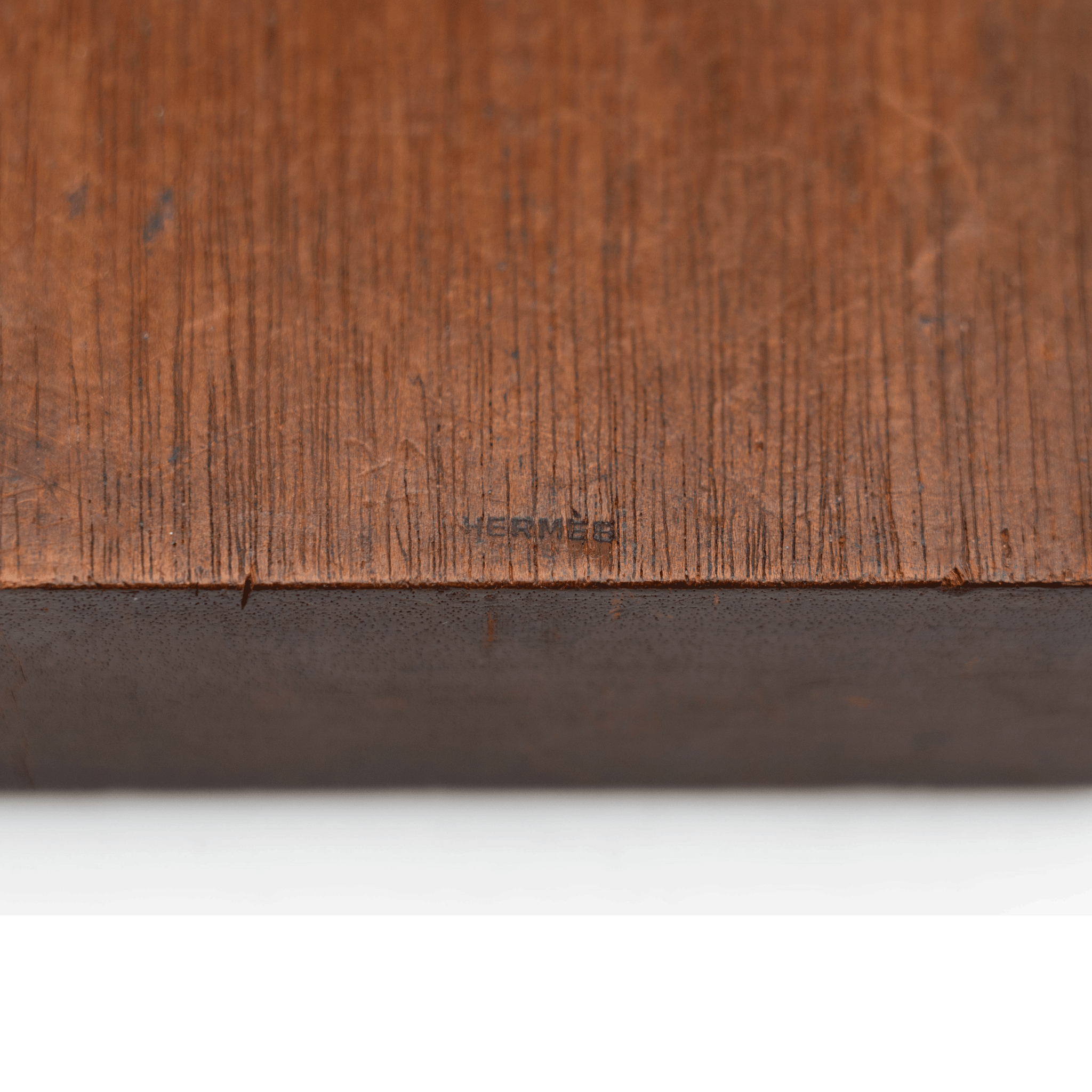 A fine and very rare Hermes flip-top wooden box, designed by Paul Dupre-Lafon. A simple yet rich oak box has been ingeniously crafted to reveal the interior by pressing down on one side of the box, revealing the chamber beneath. Each side is lined with brass tacks, reminiscent of the tacks on saddles.