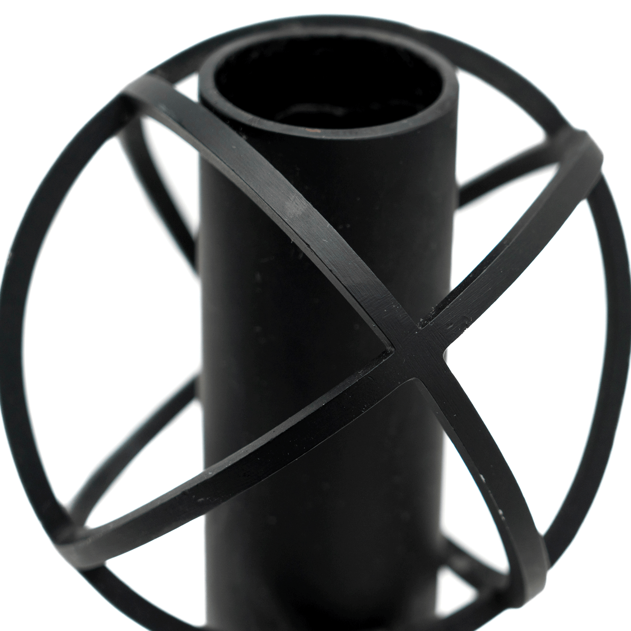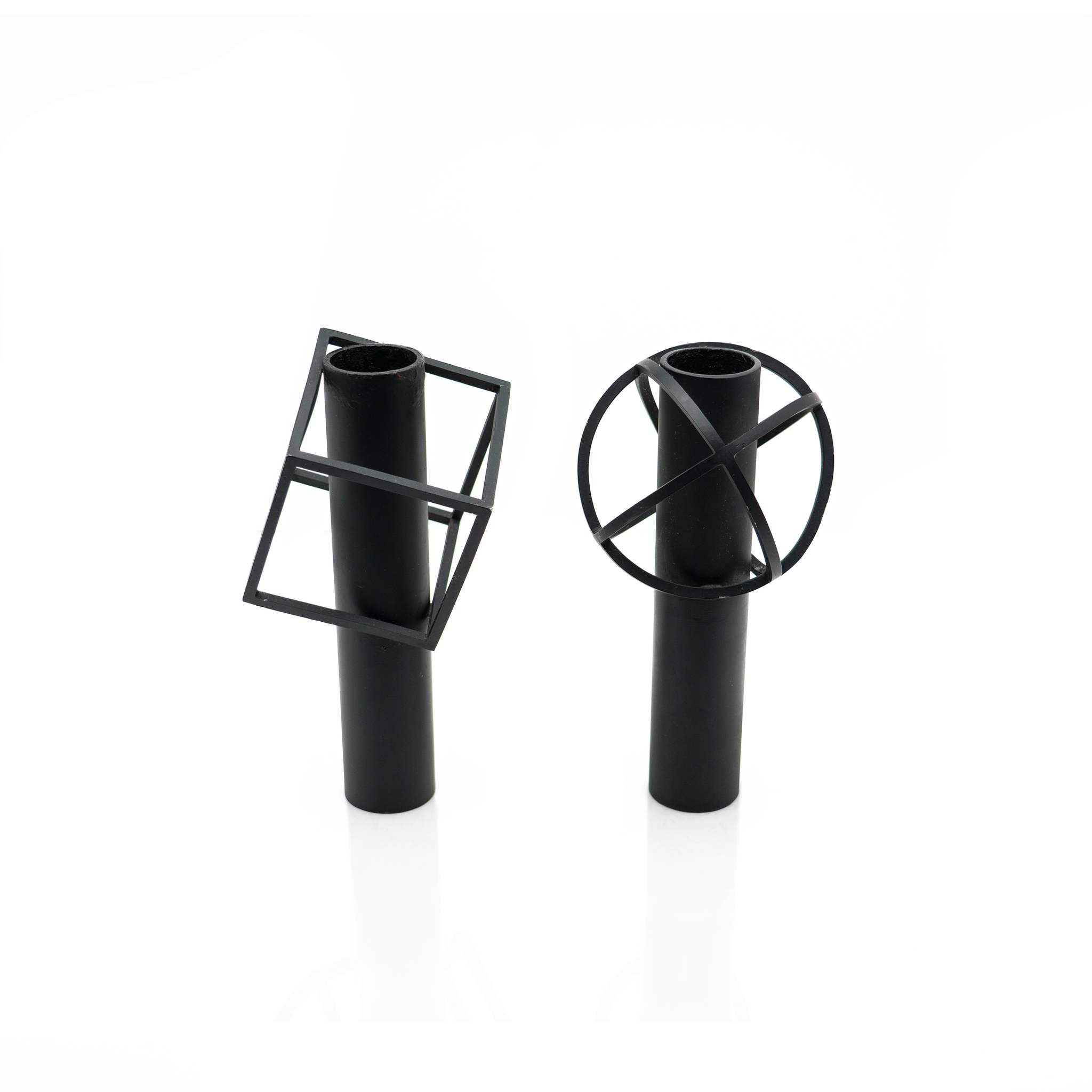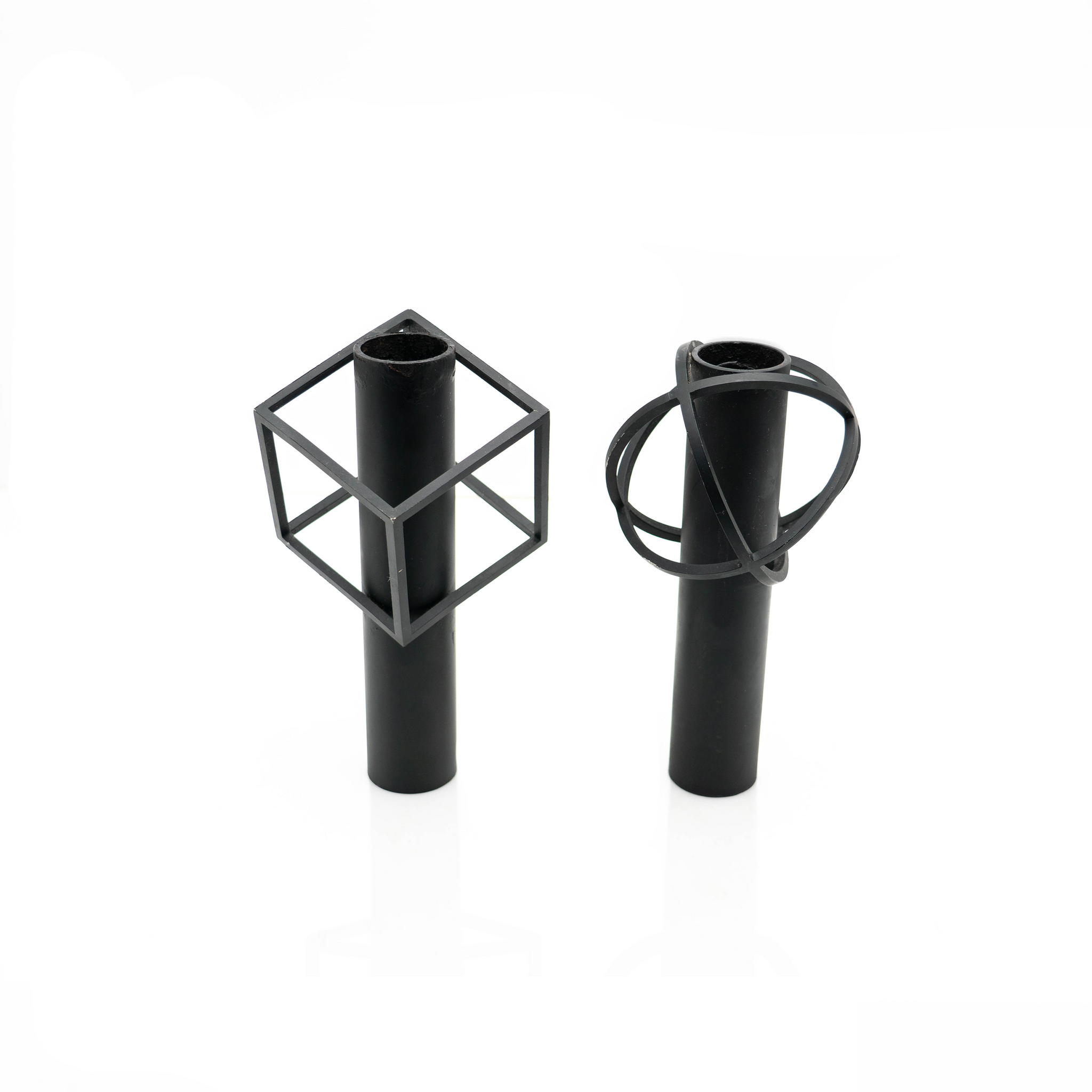 A fine and interesting pair of Japanese vases in blackened steel. Each vase consists of a simple tubular body with various geometric forms wrapped around the body. Let these sculptural vases add a modernist touch to any interior.