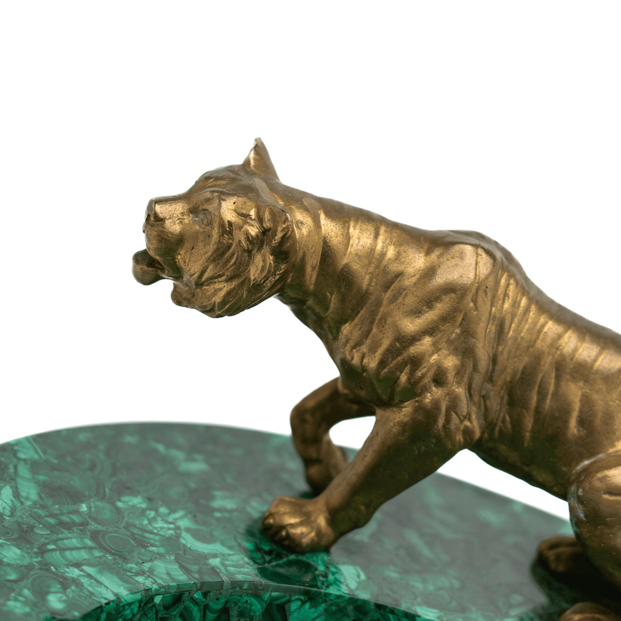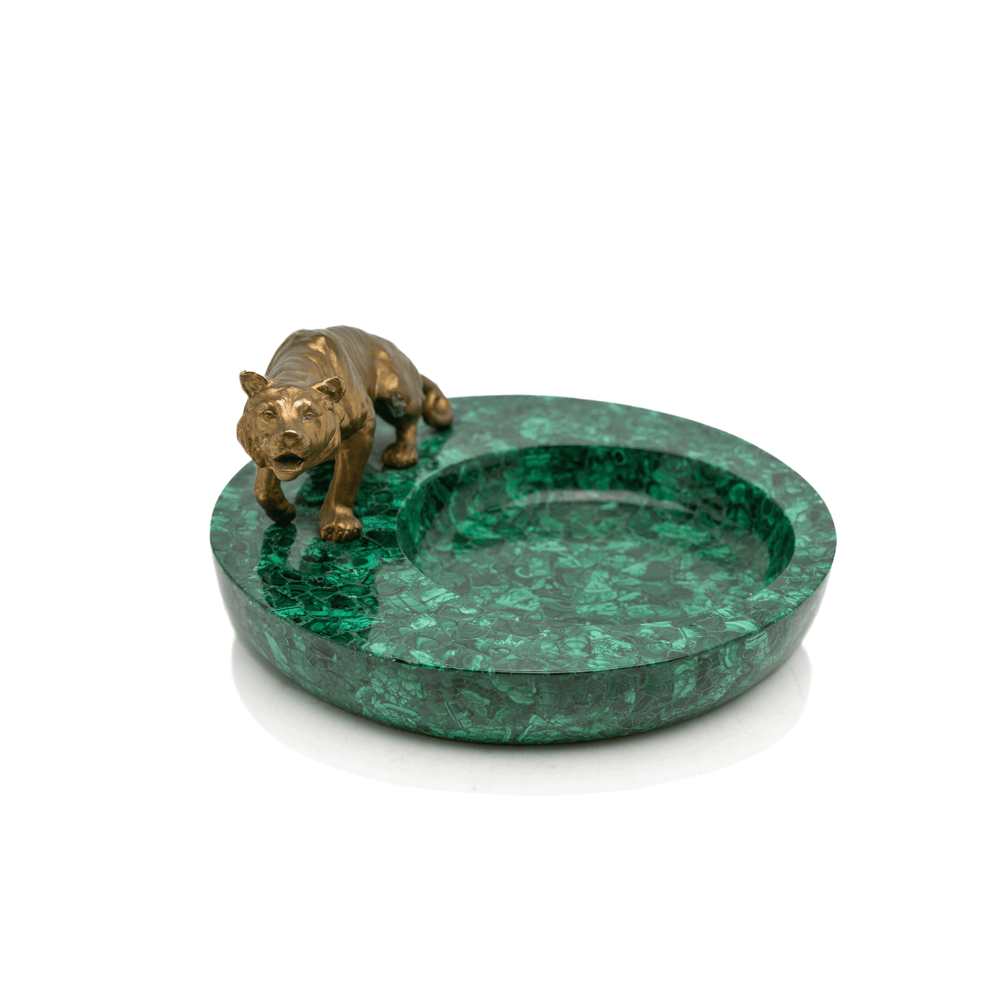A large and rare catchall made of a solid piece of malachite with a gilt-bronze tiger applied to the border. This striking and massive catchall will be a major standout on any table, desk, or shelf.